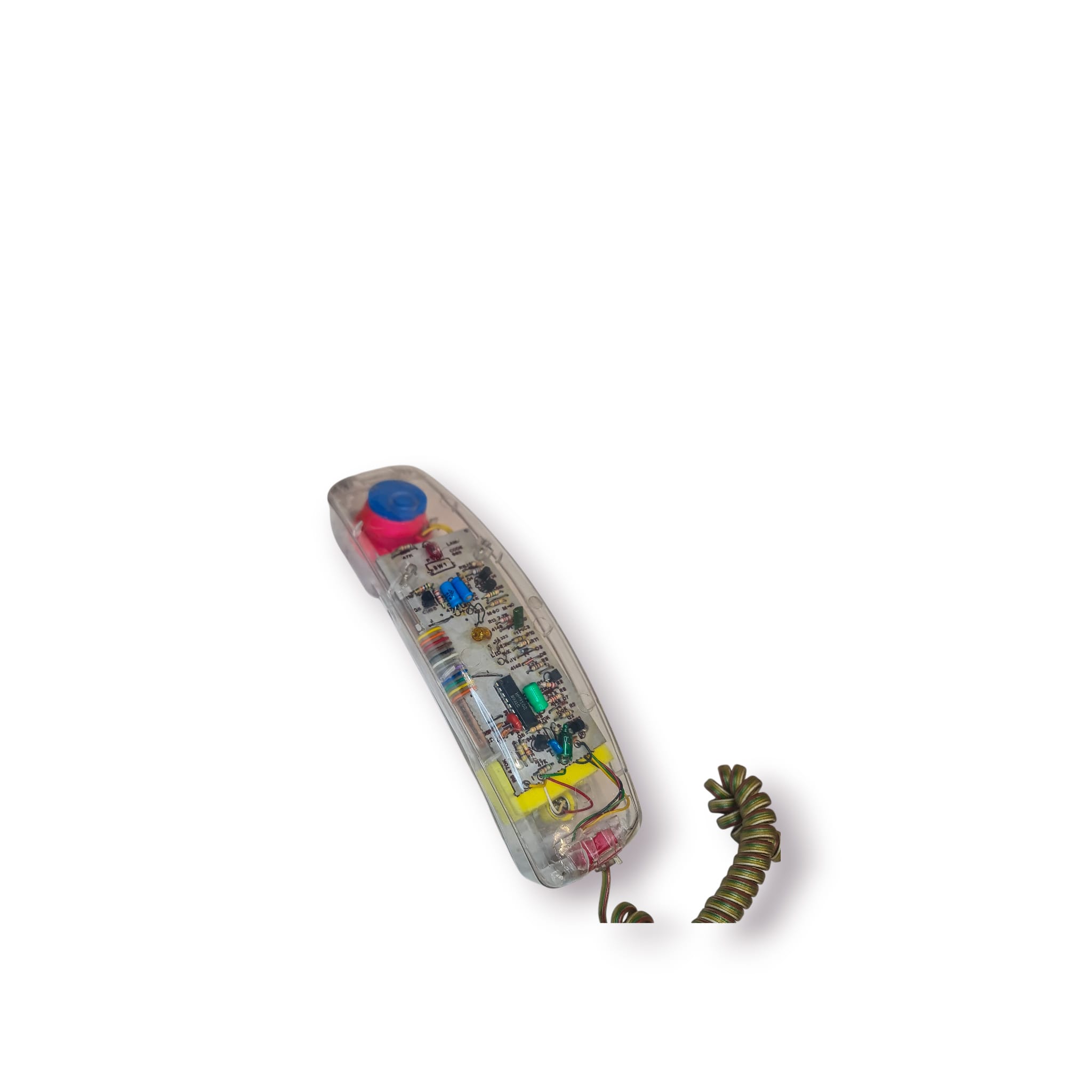 Telefone fixo vintage com corpo totalmente transparente, permitindo visualizar todo o circuito interno — um design icónico e muito característico dos anos 90.