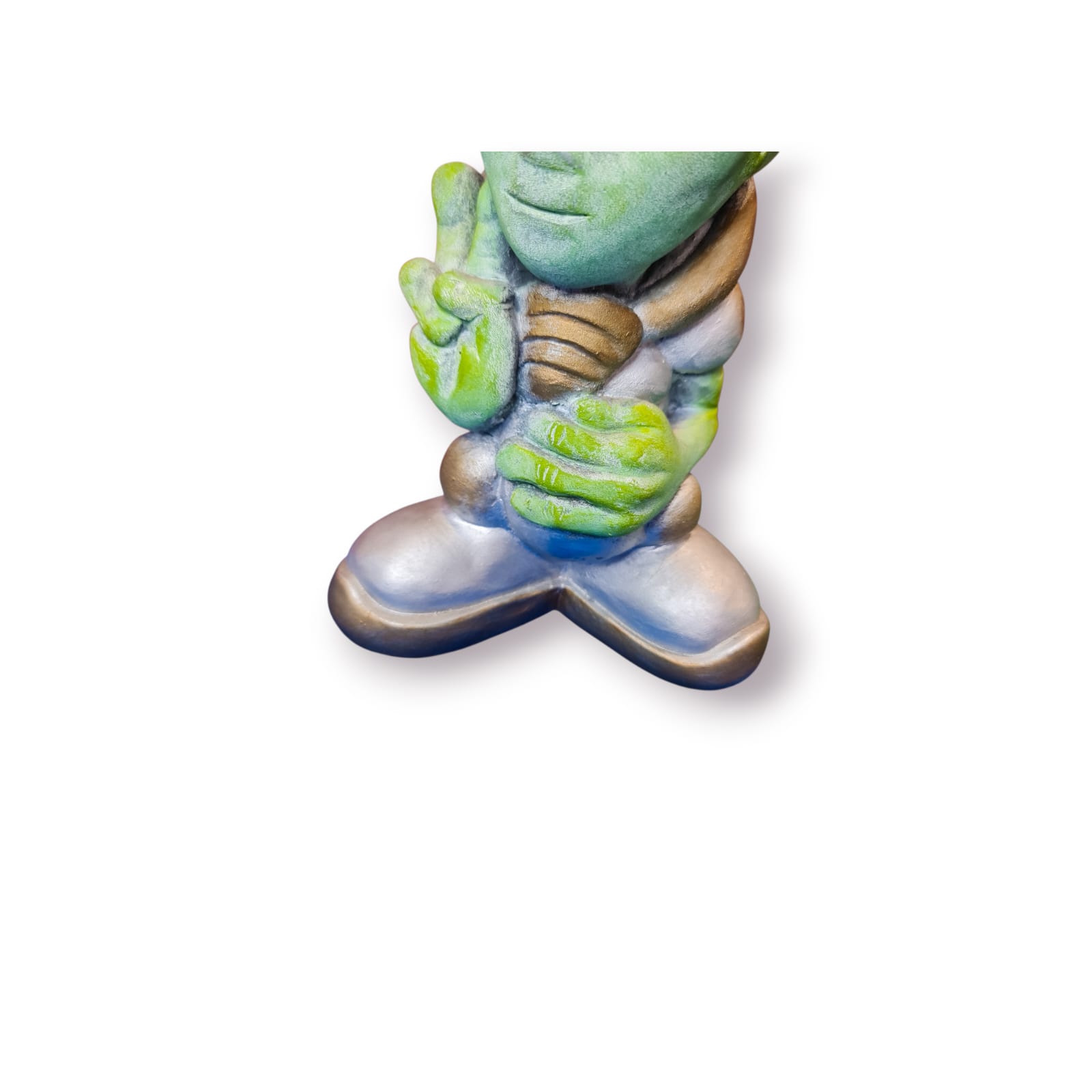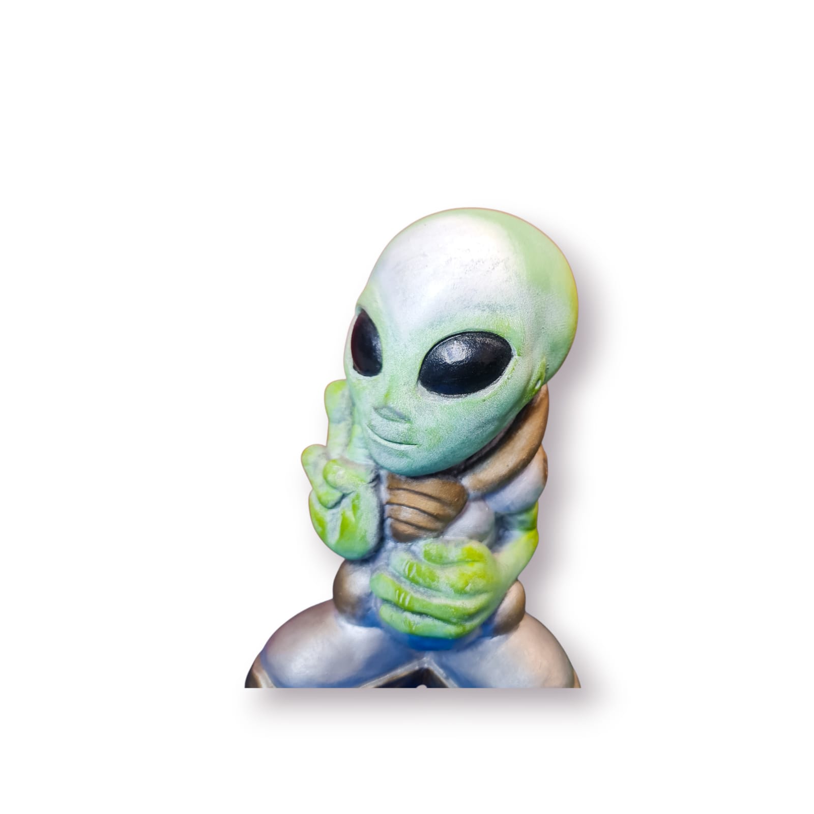 Escultura decorativa representando um simpático alienígena em pose descontraída, com excelente nível de detalhe e acabamento artesanal. Produzida em resina artística e pintada à mão em tons de verde e dourado/prateado metálico, esta peça destaca-se pelo seu caráter criativo, humor subtil e forte presença visual.