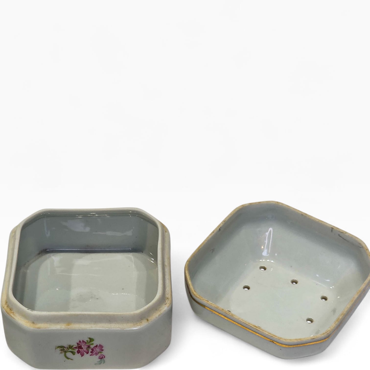 Elegante e delicada Caixa de Toucador Perfurada Vista Alegre, em porcelana branca com decoração floral policromada e filete dourado original.