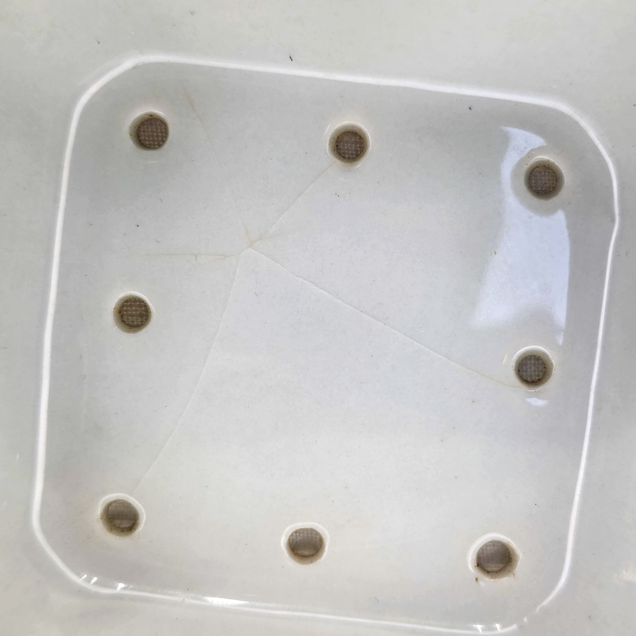 A tampa apresenta perfurações decorativas que permitem ventilação, sendo tradicionalmente utilizada para toucador — algodão, sabonete fino, essências ou pequenos objetos pessoais.