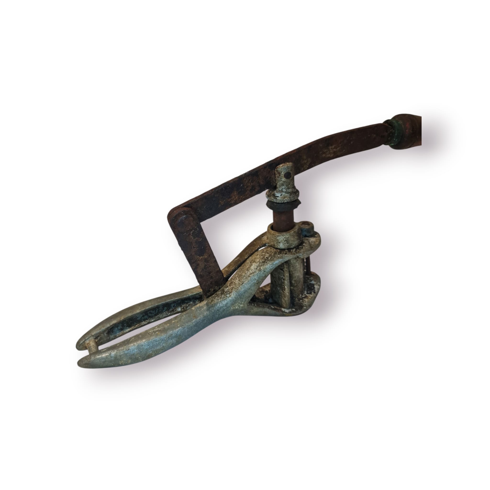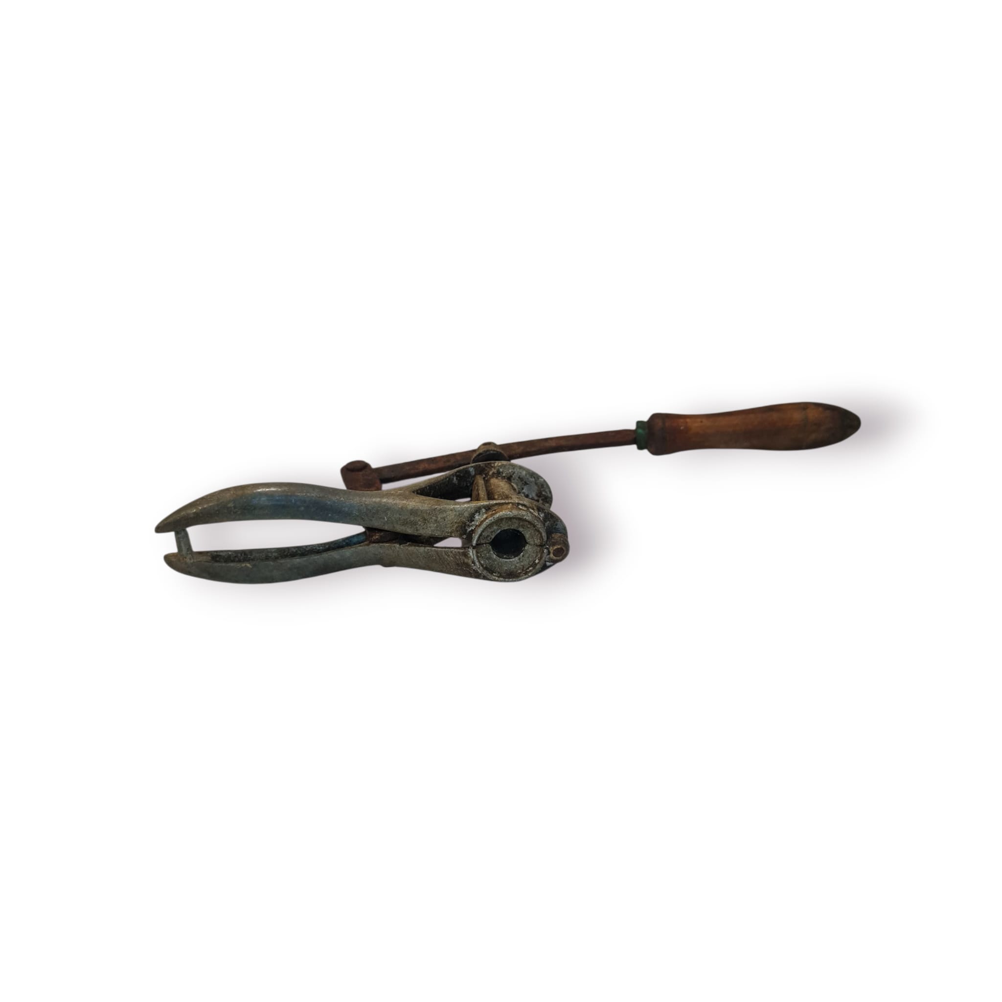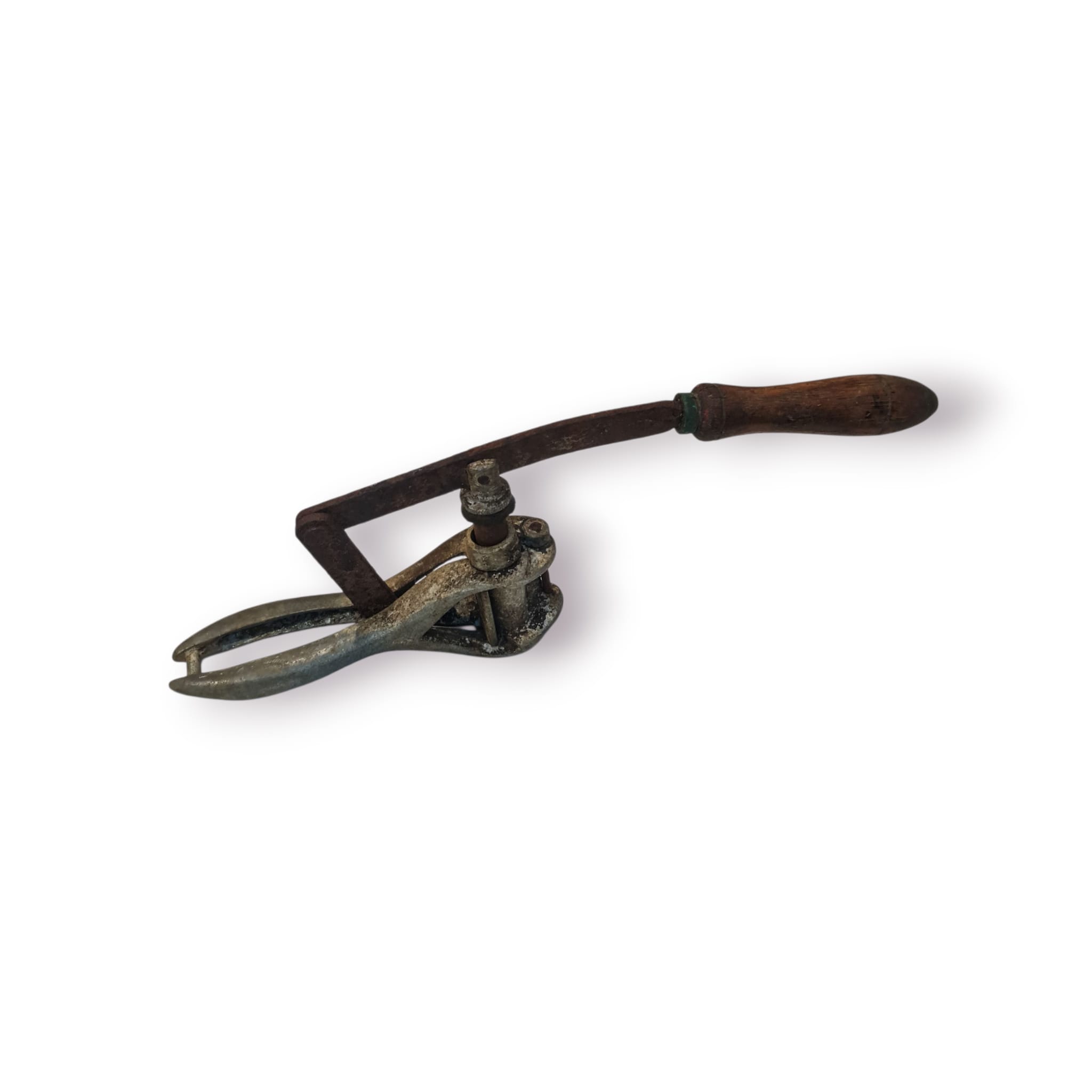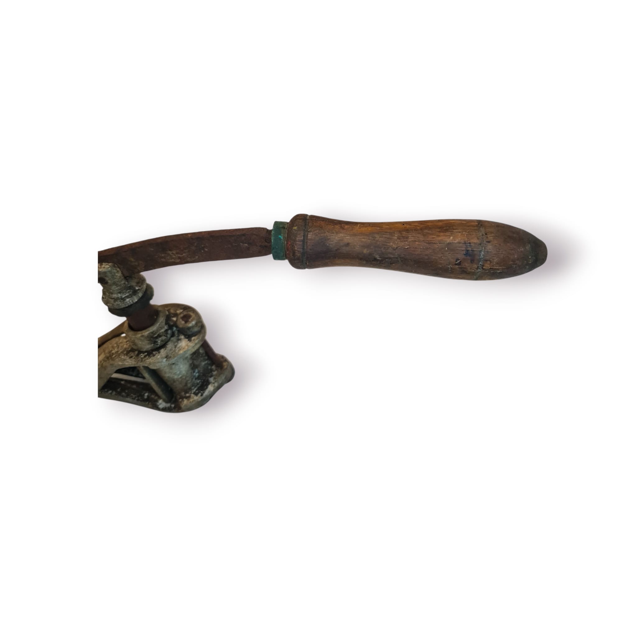 Peça histórica de adega, este colocador de rolhas manual foi utilizado para introduzir rolhas em garrafas de vidro antes da popularização das máquinas modernas. Com estrutura em ferro fundido e cabo em madeira, o mecanismo de pressão permite segurar o gargalo da garrafa enquanto a rolha é empurrada para dentro com força e precisão.
