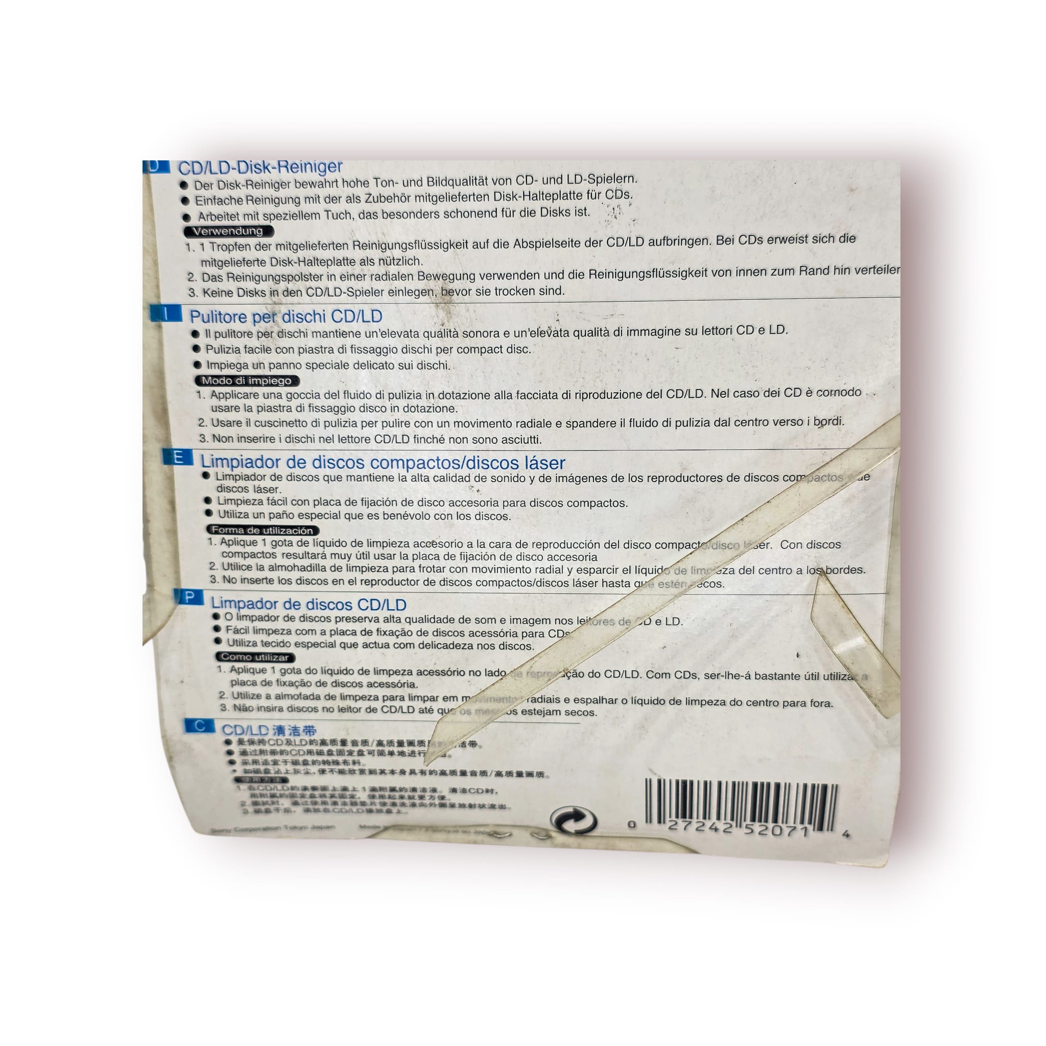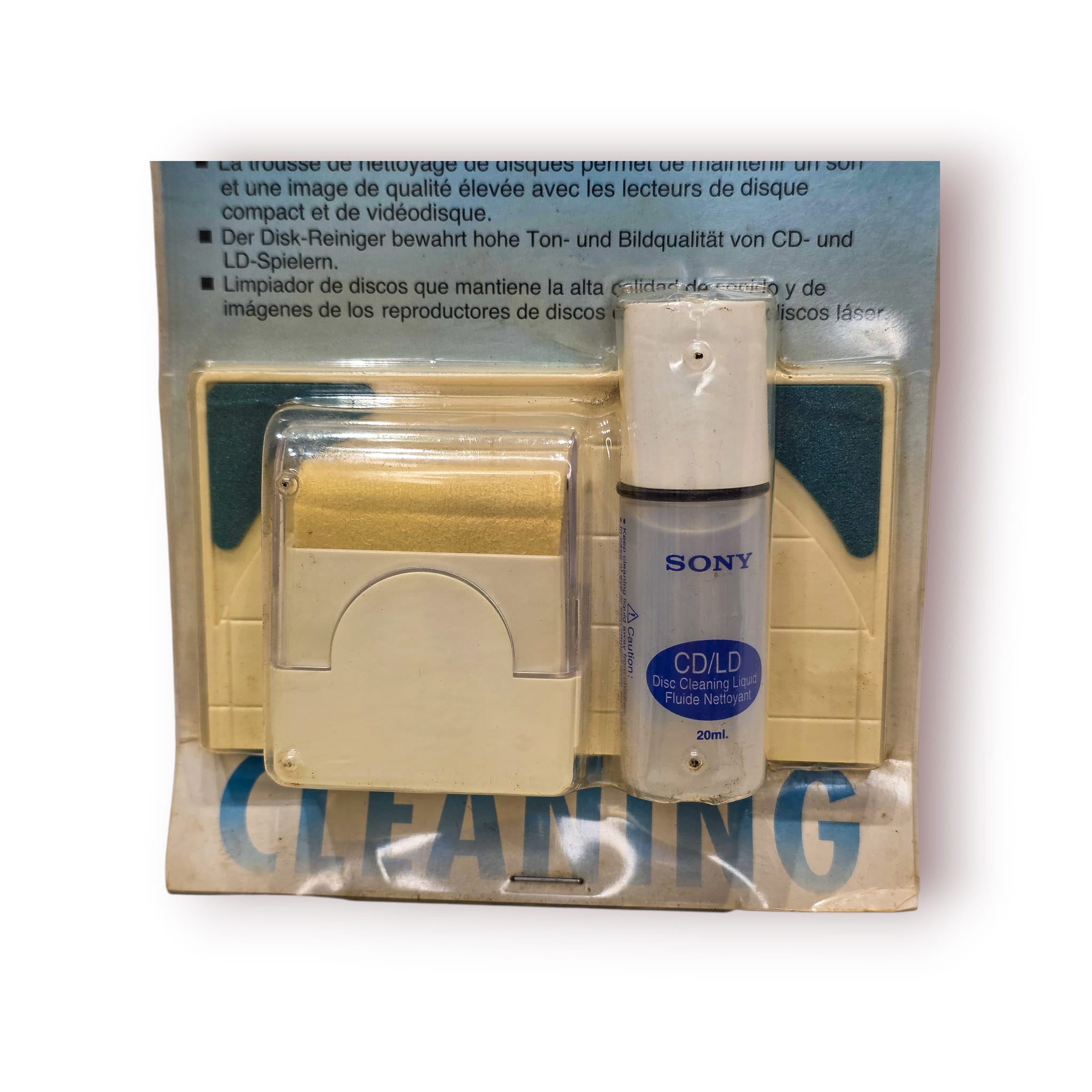 Kit de limpeza original Sony para CDs e LaserDiscs, ideal para manter a qualidade de reprodução de áudio e vídeo em leitores ópticos.
