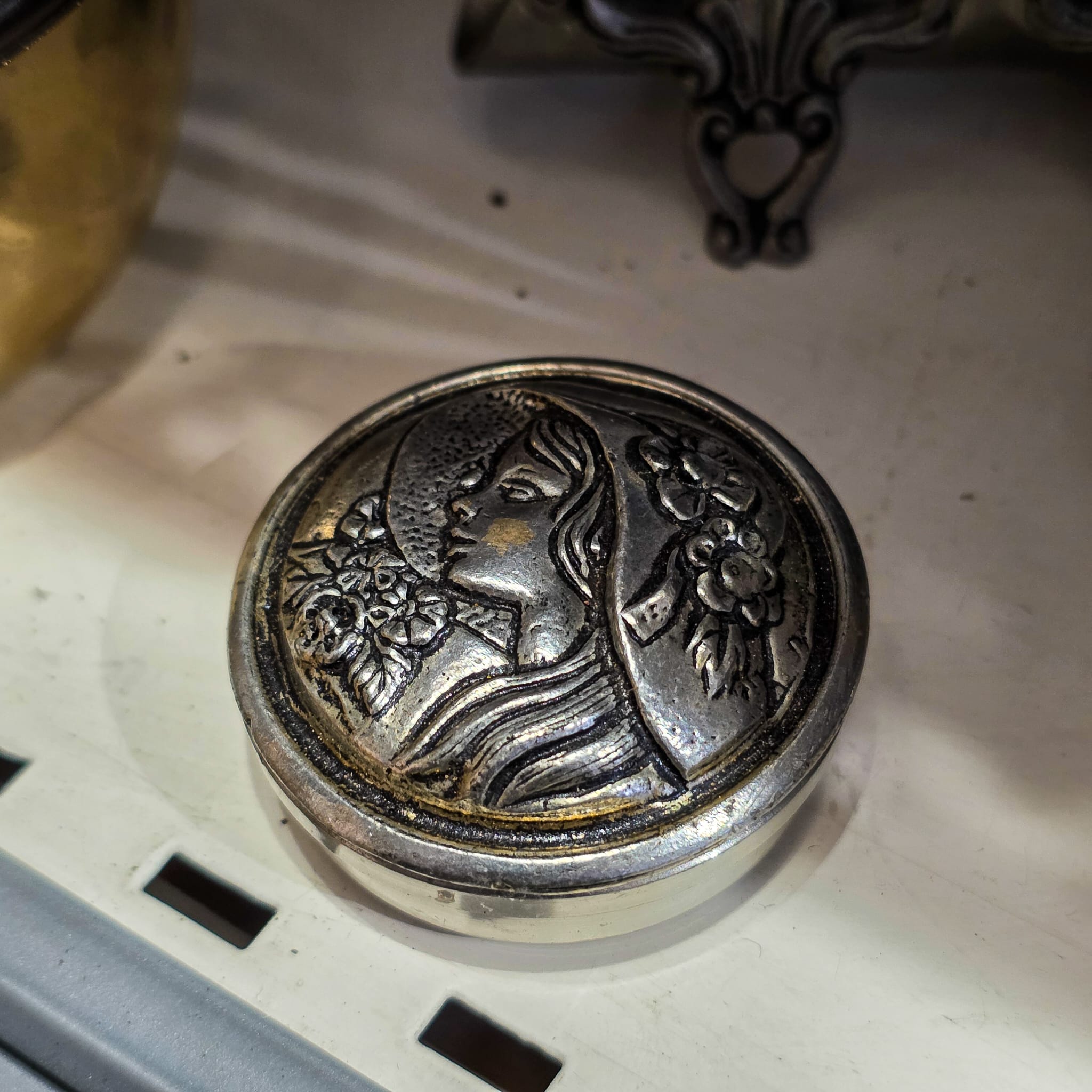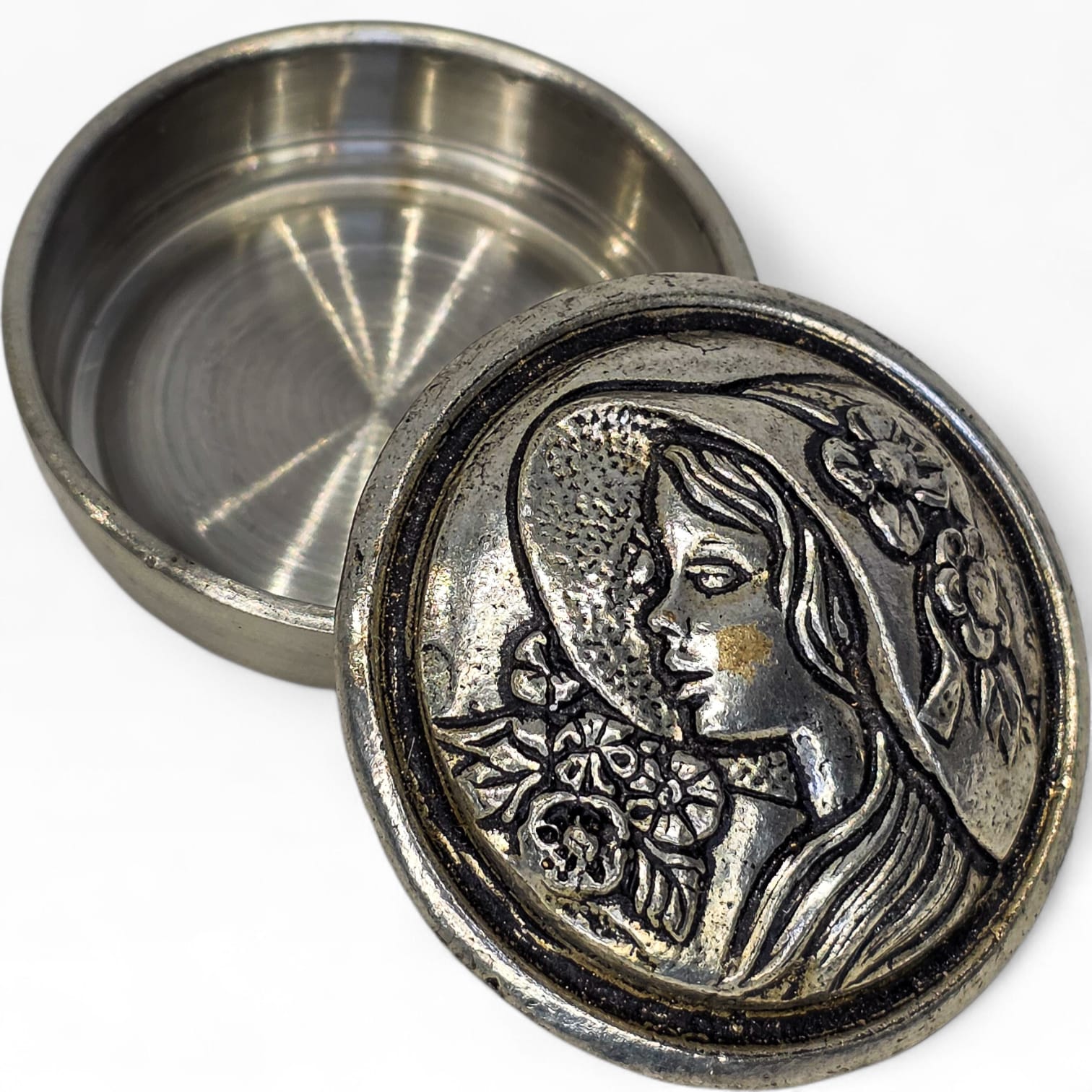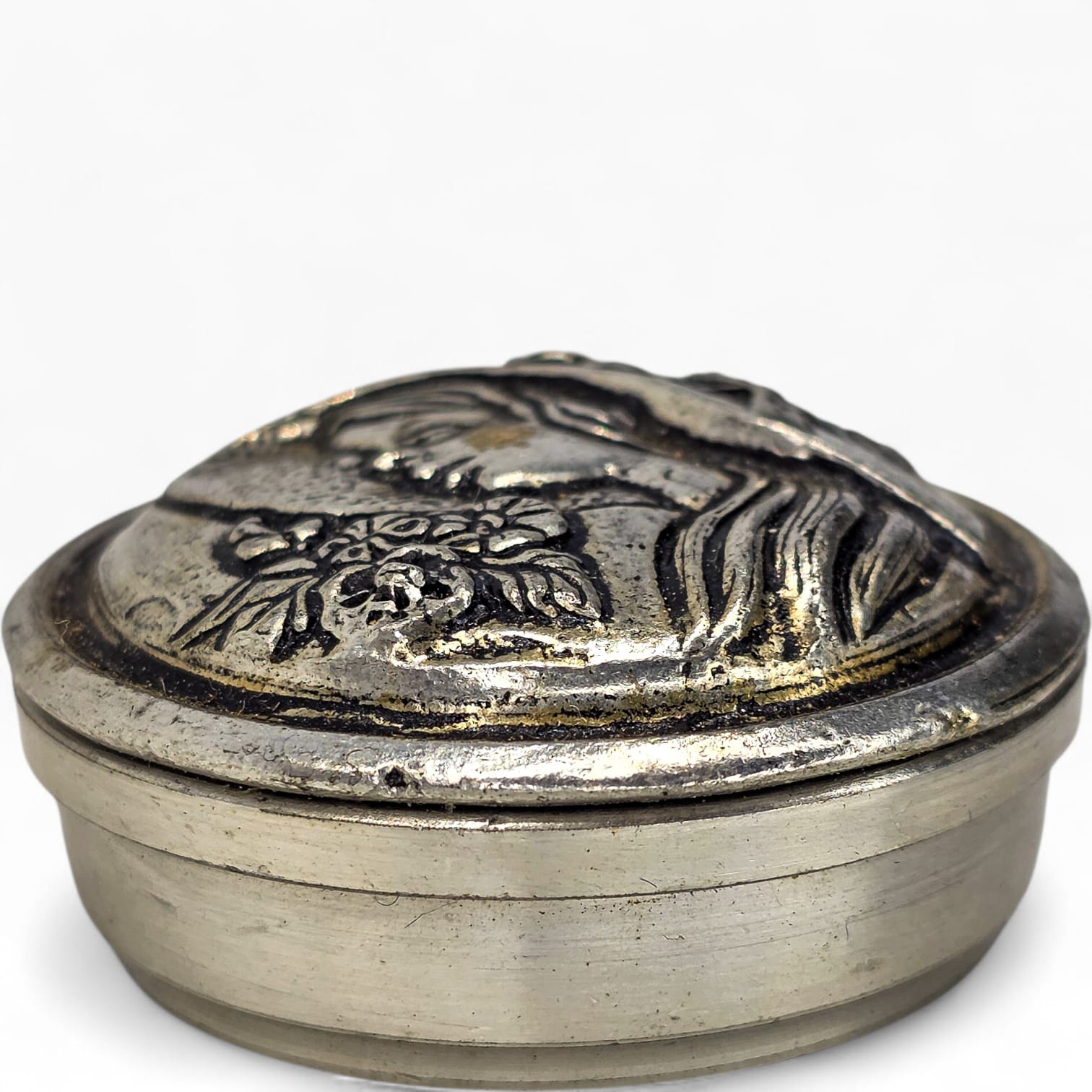 Caixa redonda em estanho SM95% (95% estanho), com tampa decorada em relevo representando perfil feminino com flores, num estilo claramente inspirado no movimento Art Nouveau.