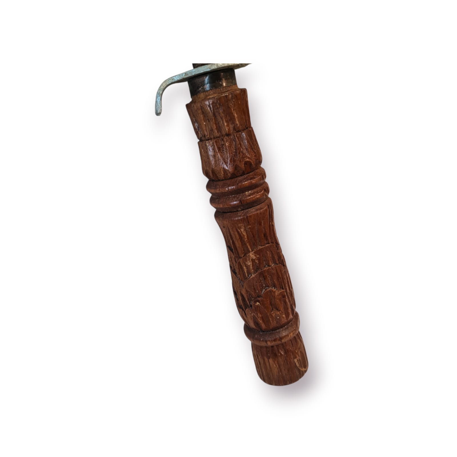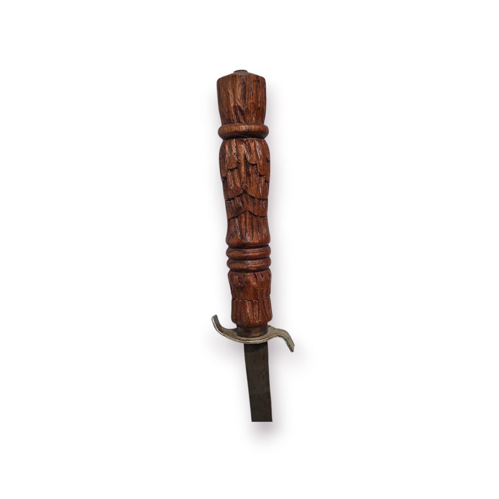 Elegante punhal decorativo artesanal, com cabo e bainha em madeira entalhada à mão, apresentando motivos ornamentais tradicionais e acabamento rústico de grande impacto visual.