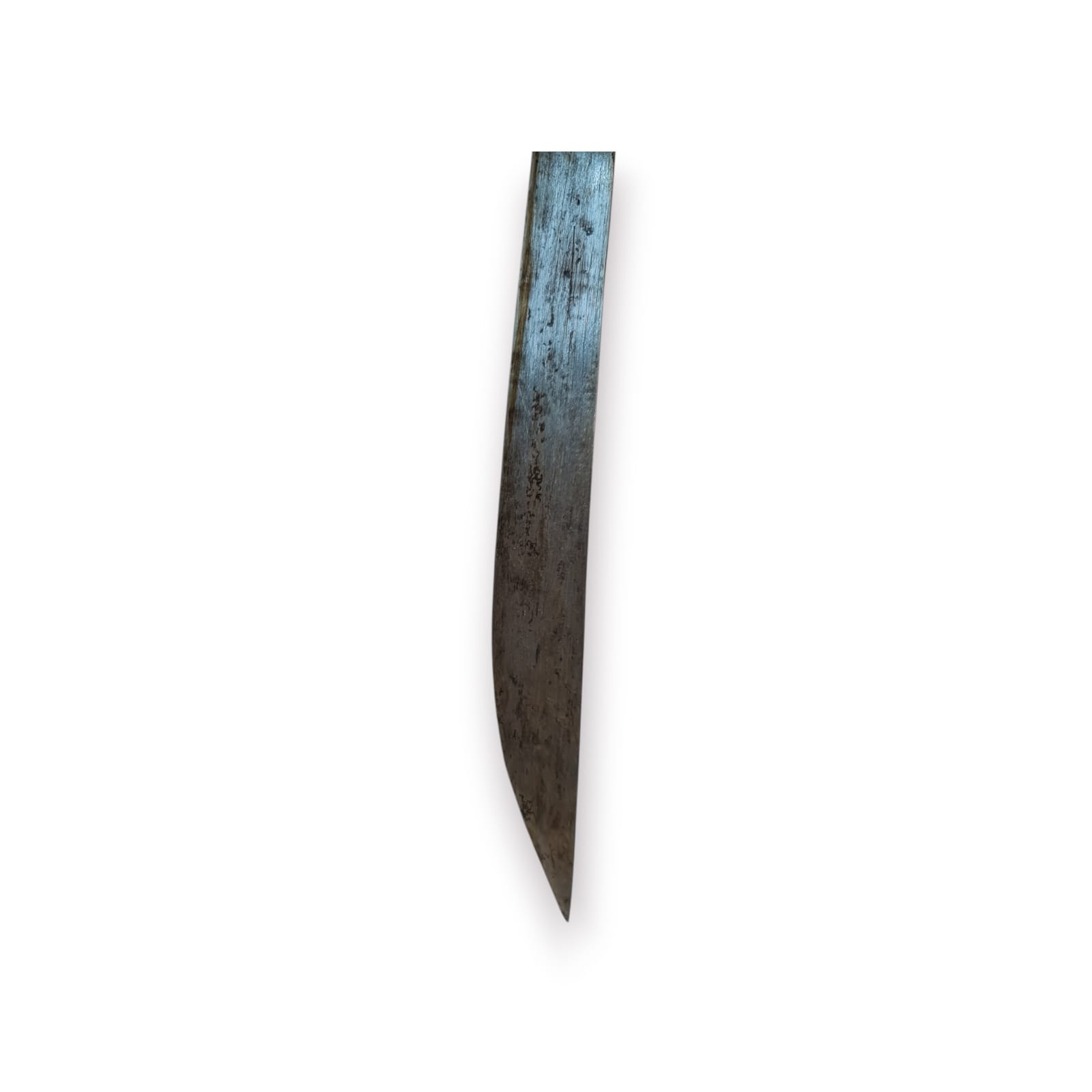 A lâmina em aço, aliada ao entalhe detalhado da madeira e aos pequenos apontamentos metálicos, confere à peça um carácter etnográfico e decorativo, ideal para exposição em parede, vitrine ou integração em ambientes de inspiração histórica ou exótica.