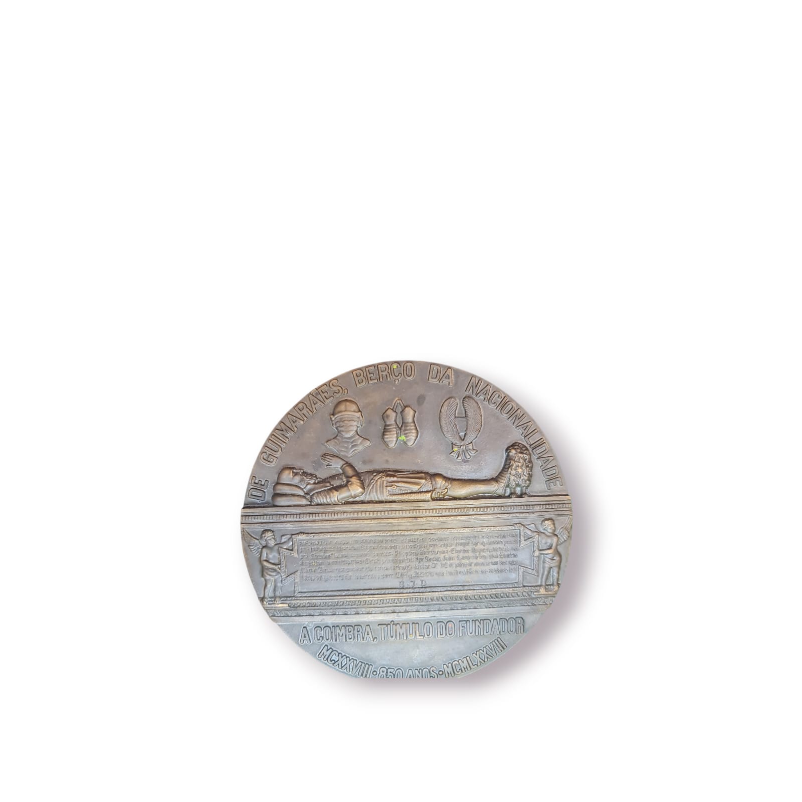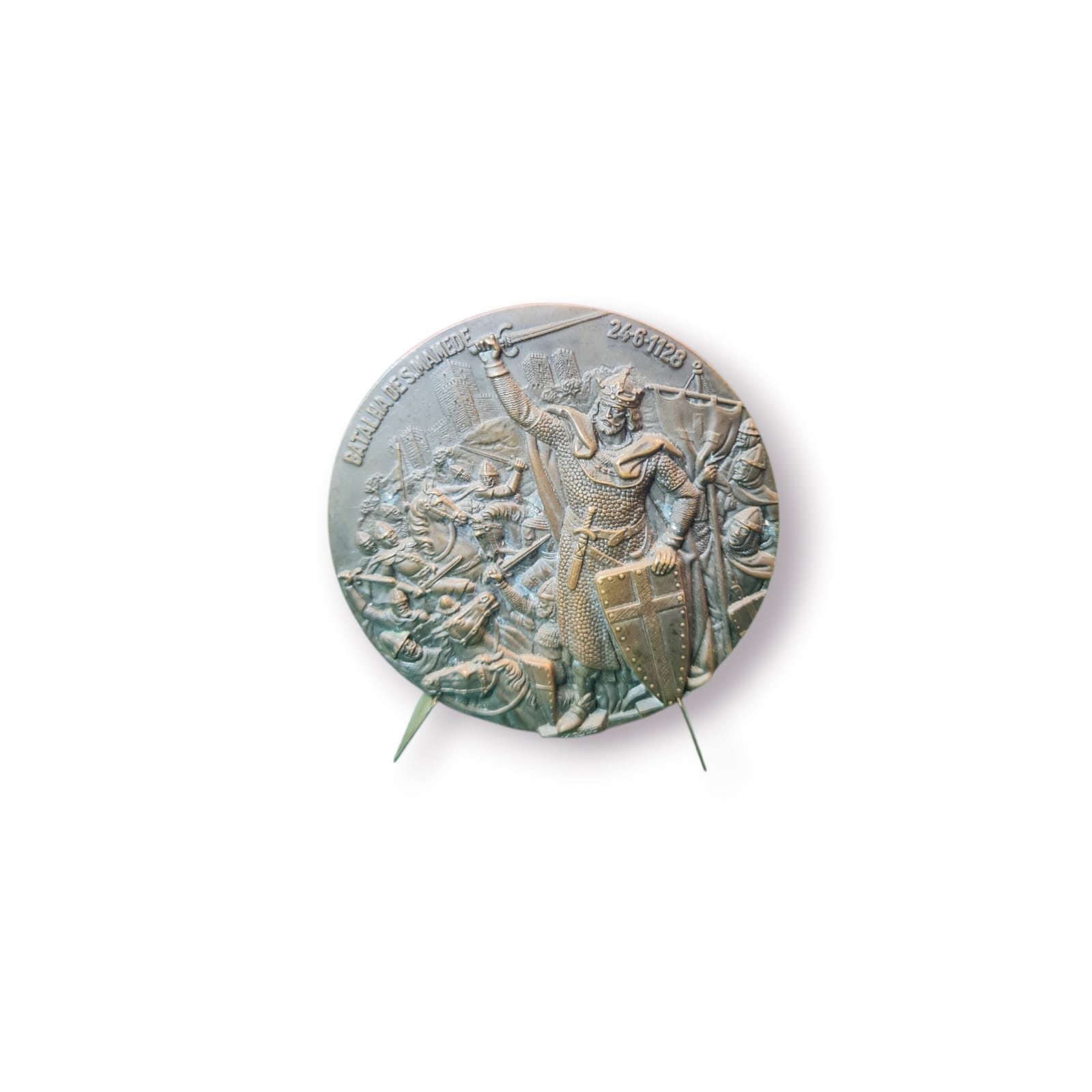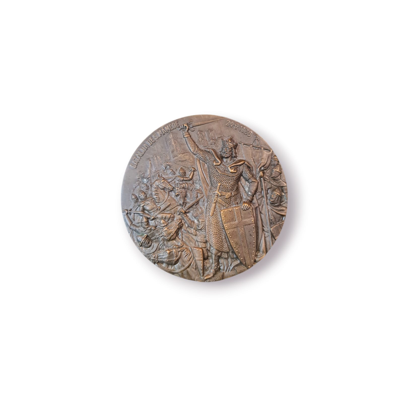 Importante medalha comemorativa portuguesa em bronze, celebrando a Batalha de São Mamede (24 de junho de 1128), marco decisivo para a independência e fundação de Portugal.