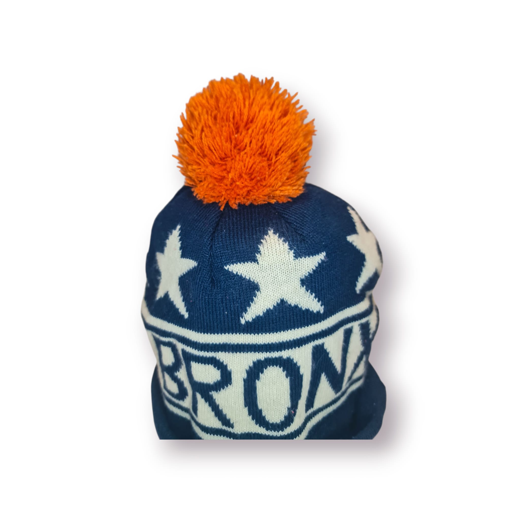 Gorro de malha estilo urbano, modelo “BRONX”, em azul marinho com estrelas brancas e detalhes laranja. Possui pompom grosso no topo, interior confortável e malha elástica que se adapta bem à cabeça.