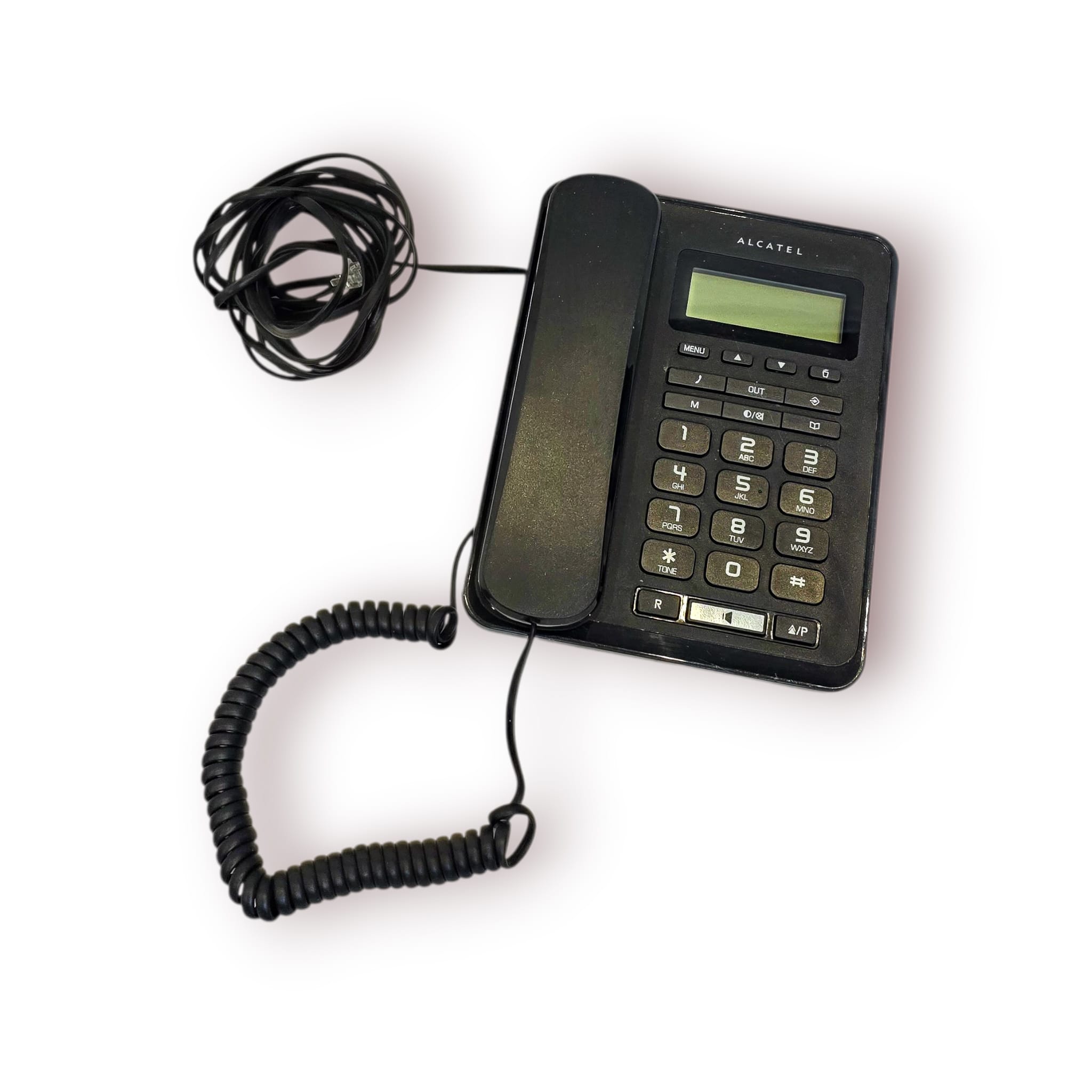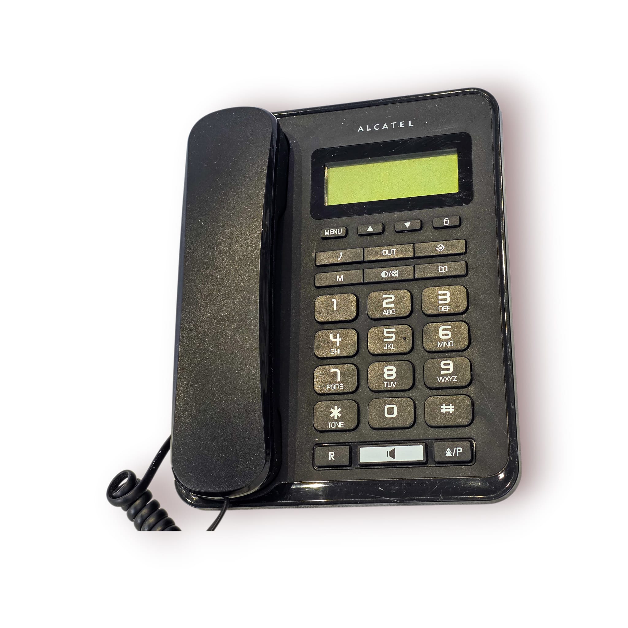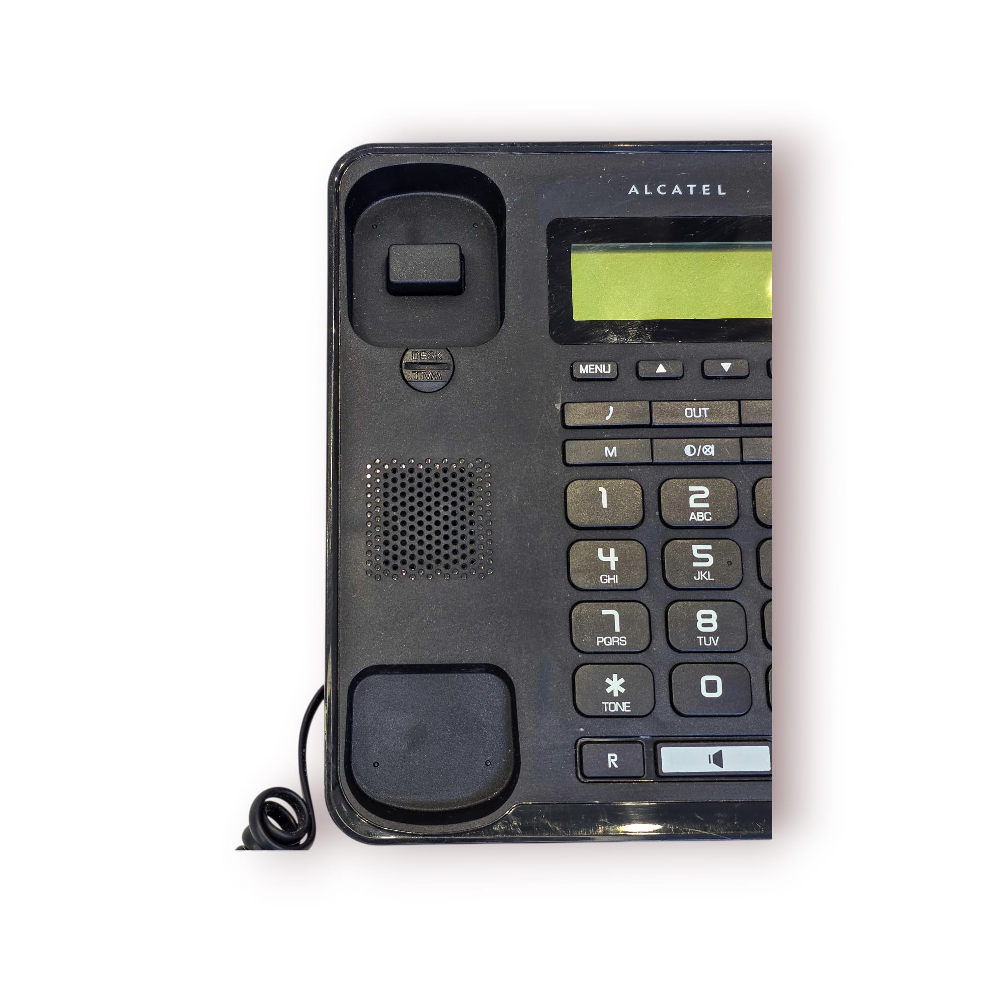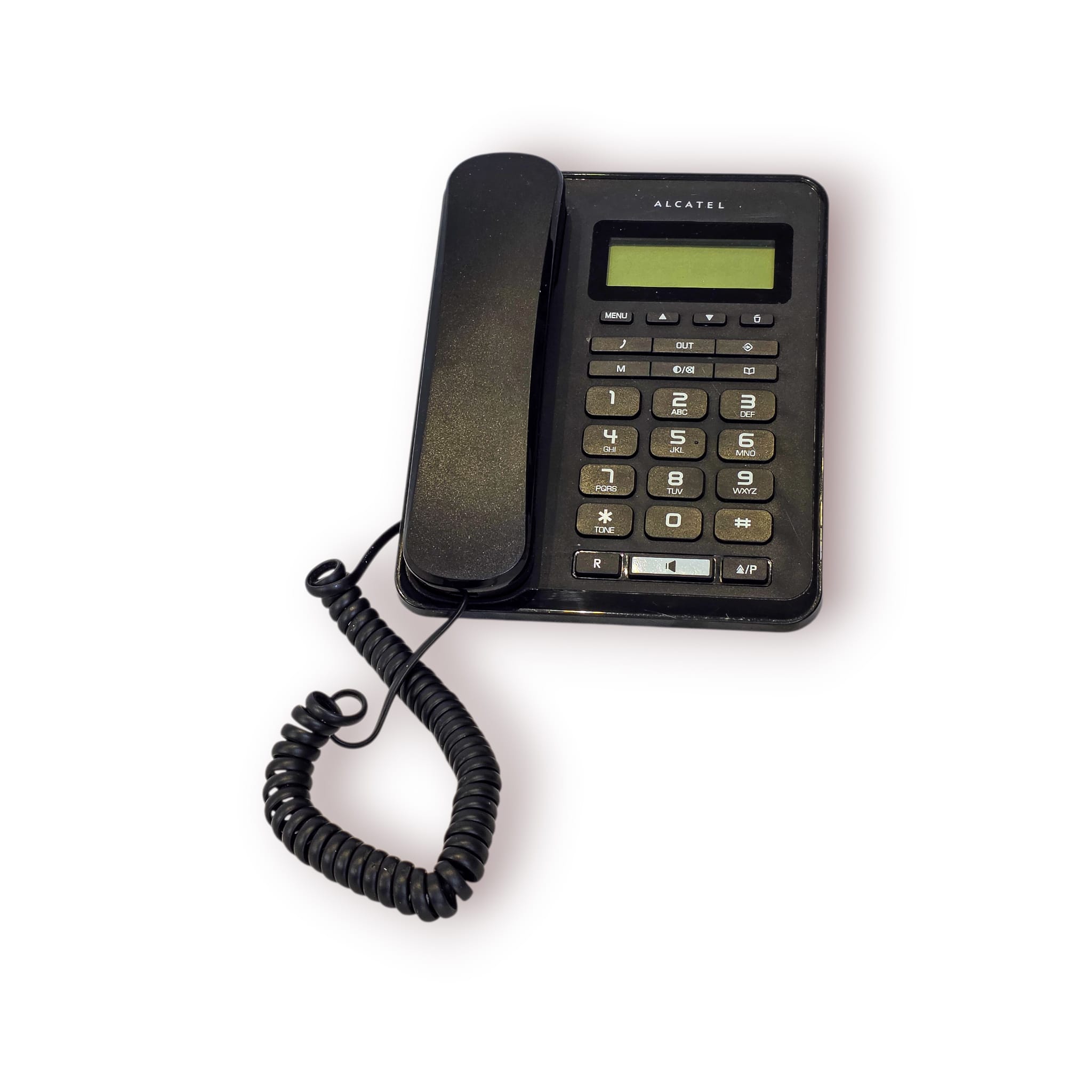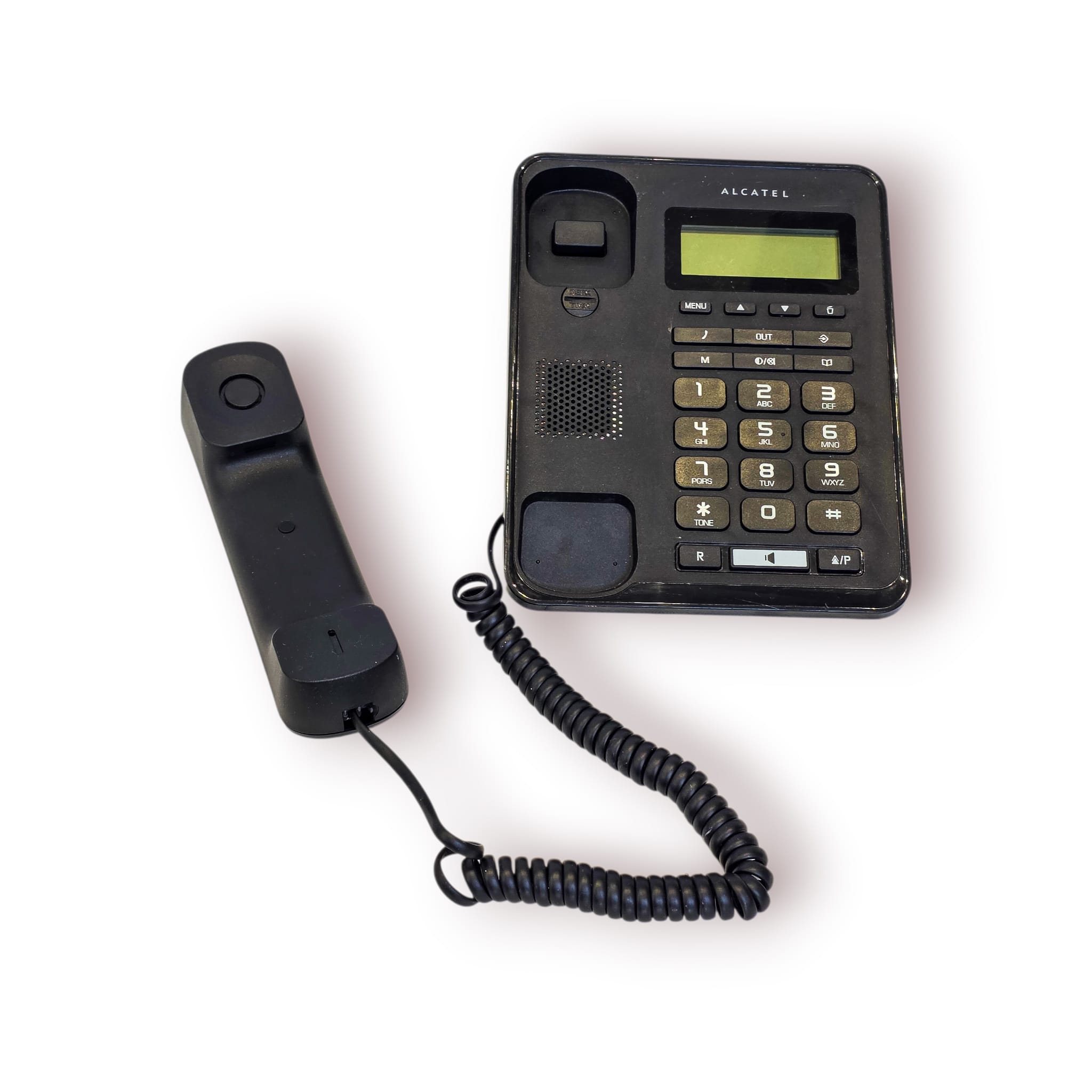 Telefone fixo compacto da marca Alcatel, modelo T50-CE, ideal para utilização em casa, escritórios ou estabelecimentos comerciais.