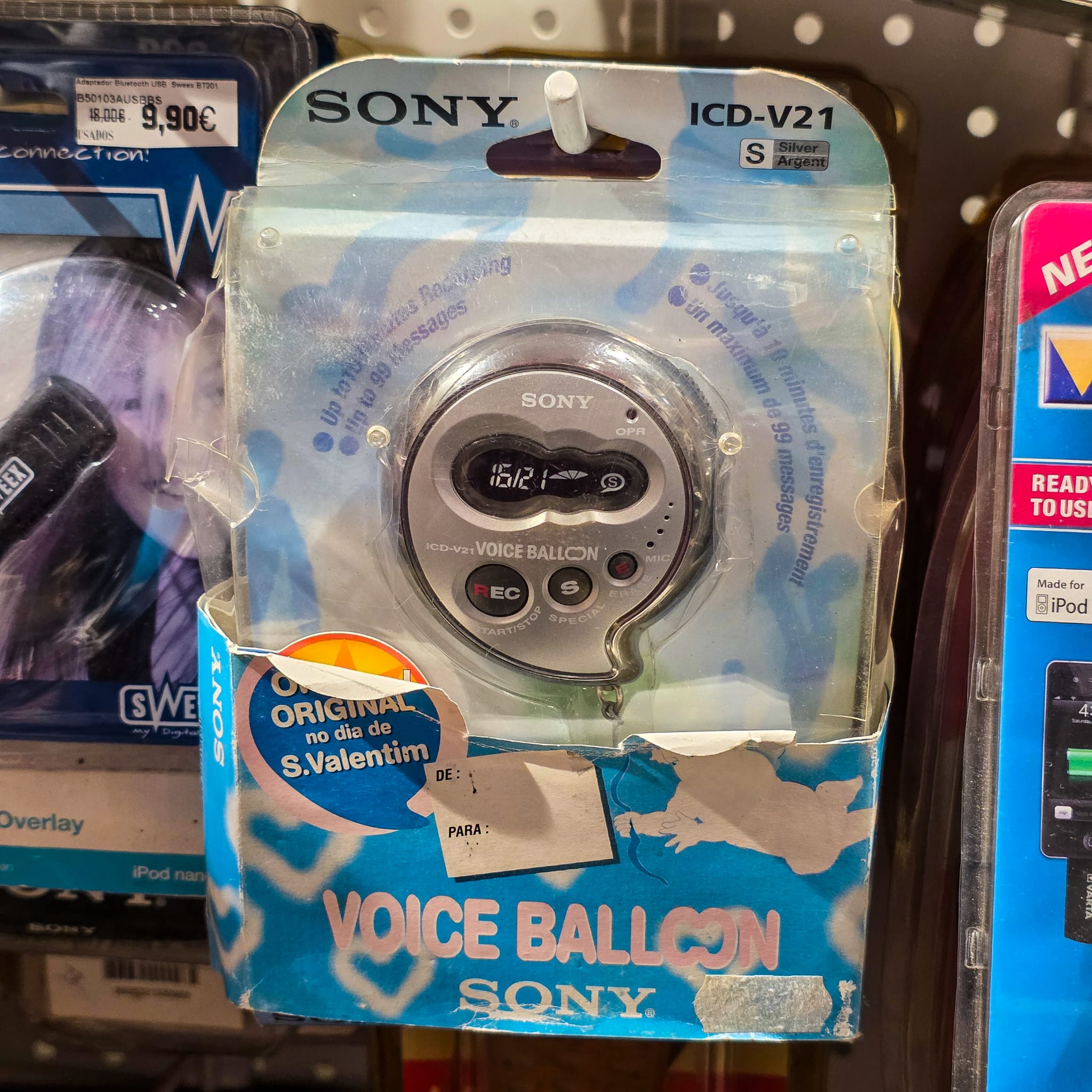 Uma peça icónica da transição para a era digital. Este gravador de voz Sony ICD-V21, conhecido como “Voice Balloon”, representa o início dos gravadores digitais portáteis compactos.