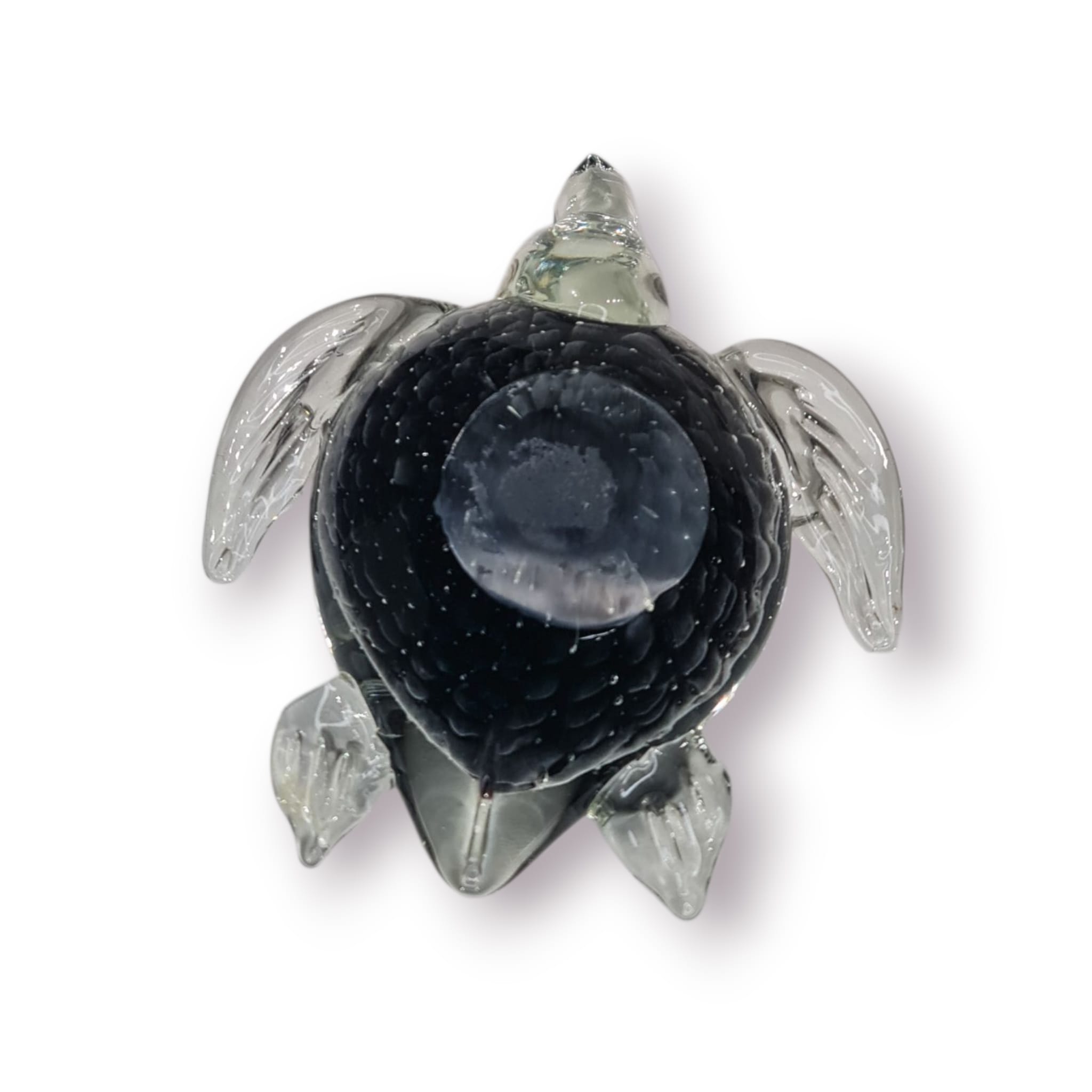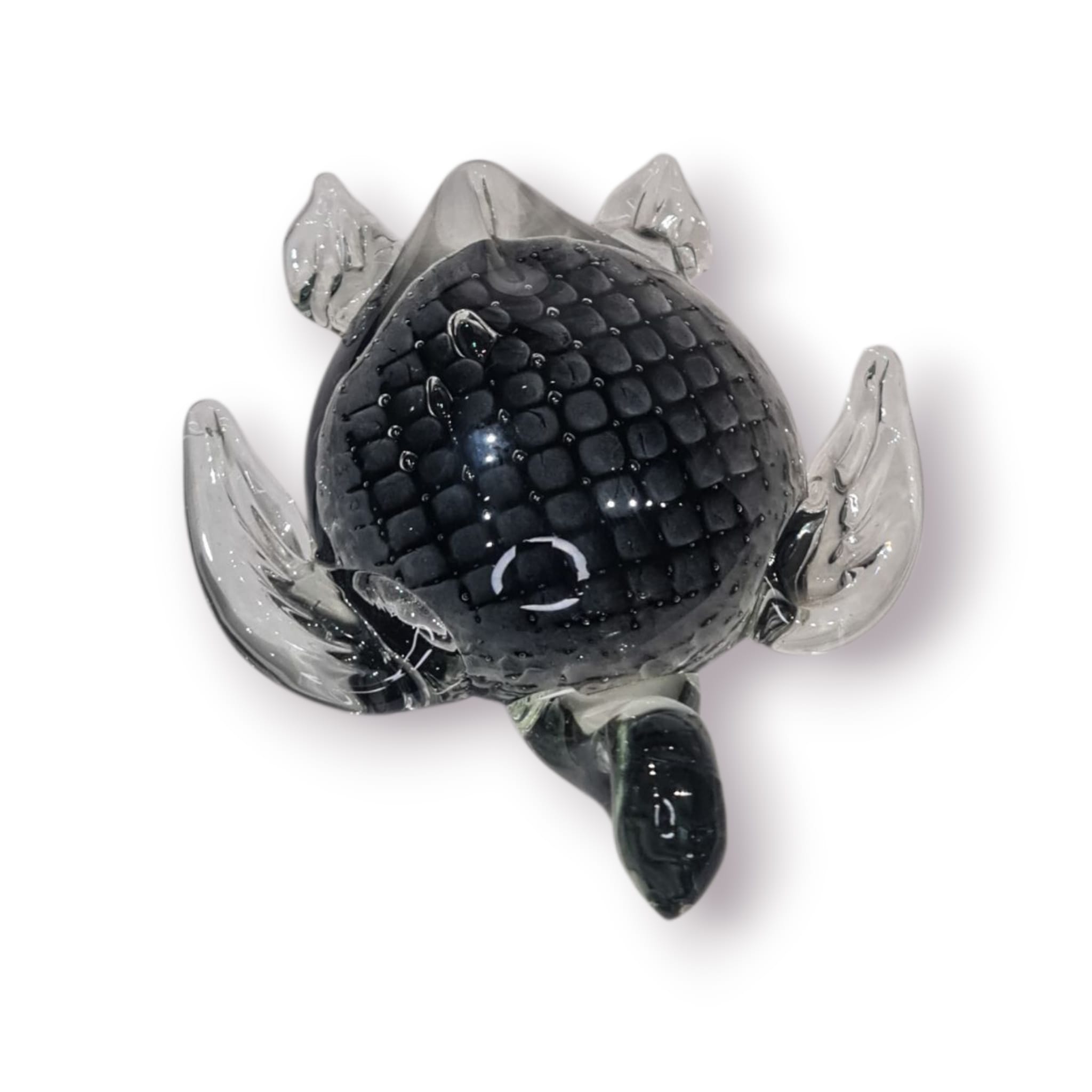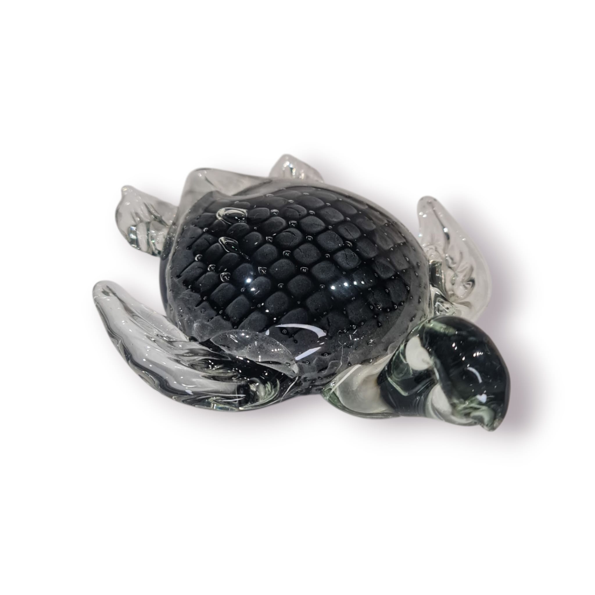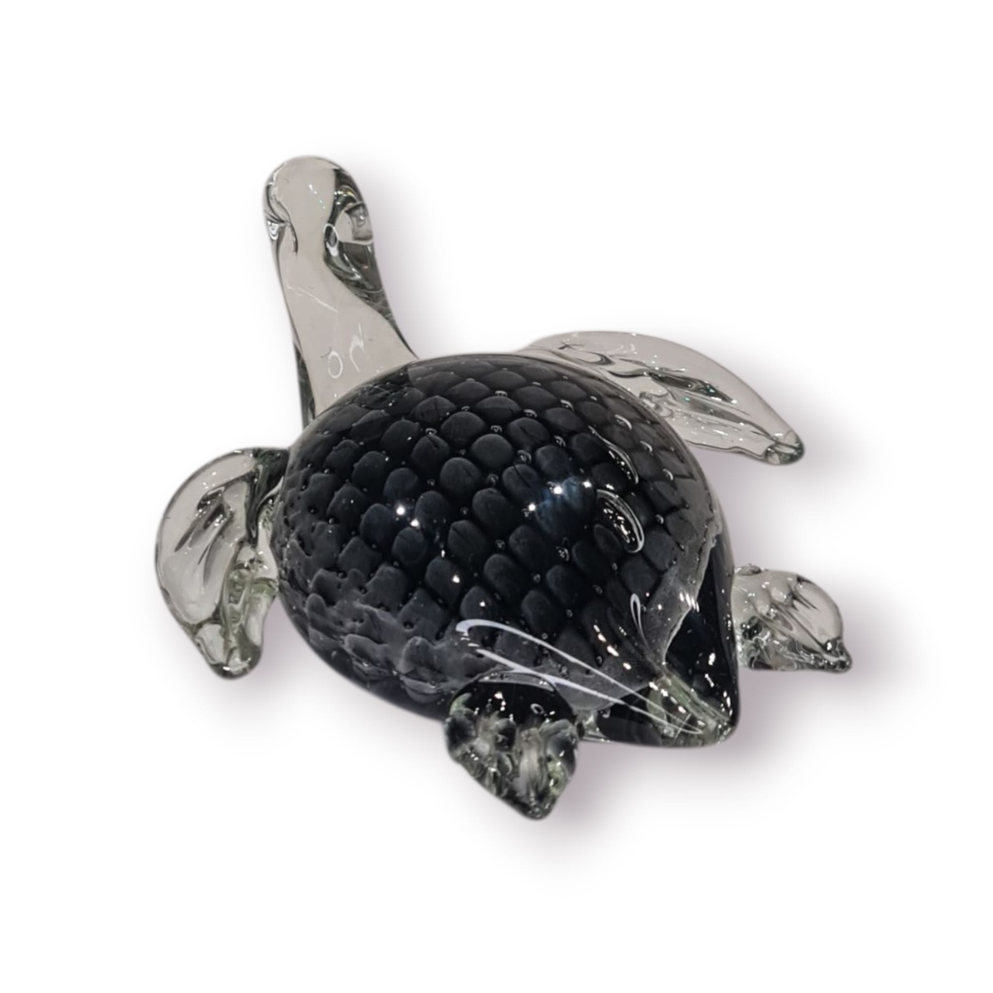 Este elegante pesa-papéis em forma de tartaruga é feito em vidro soprado maciço, combinando peso, brilho e detalhe artesanal. A carapaça preta texturada cria um efeito visual profundo, enquanto as barbatanas translúcidas dão o toque artístico típico do vidro trabalhado à mão.