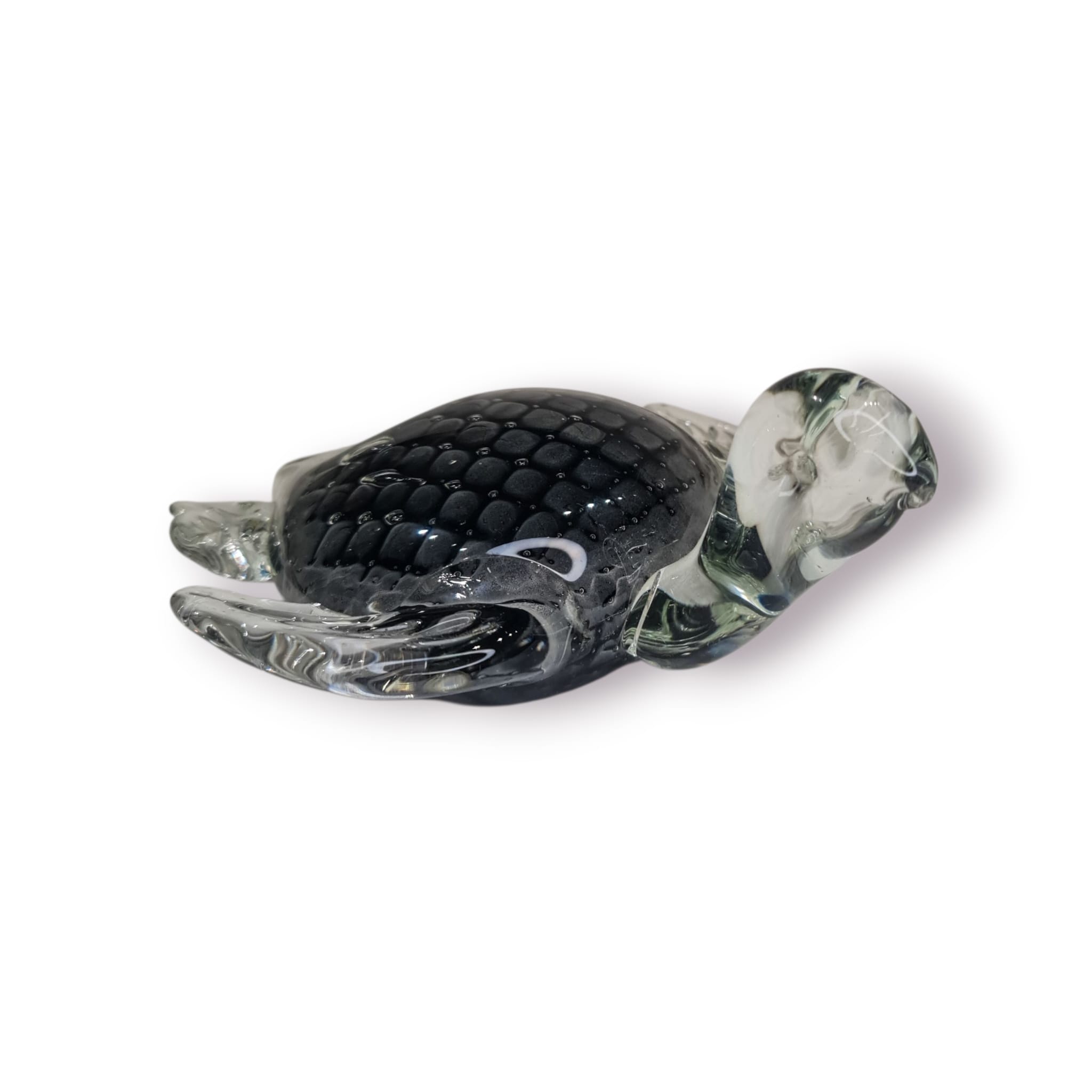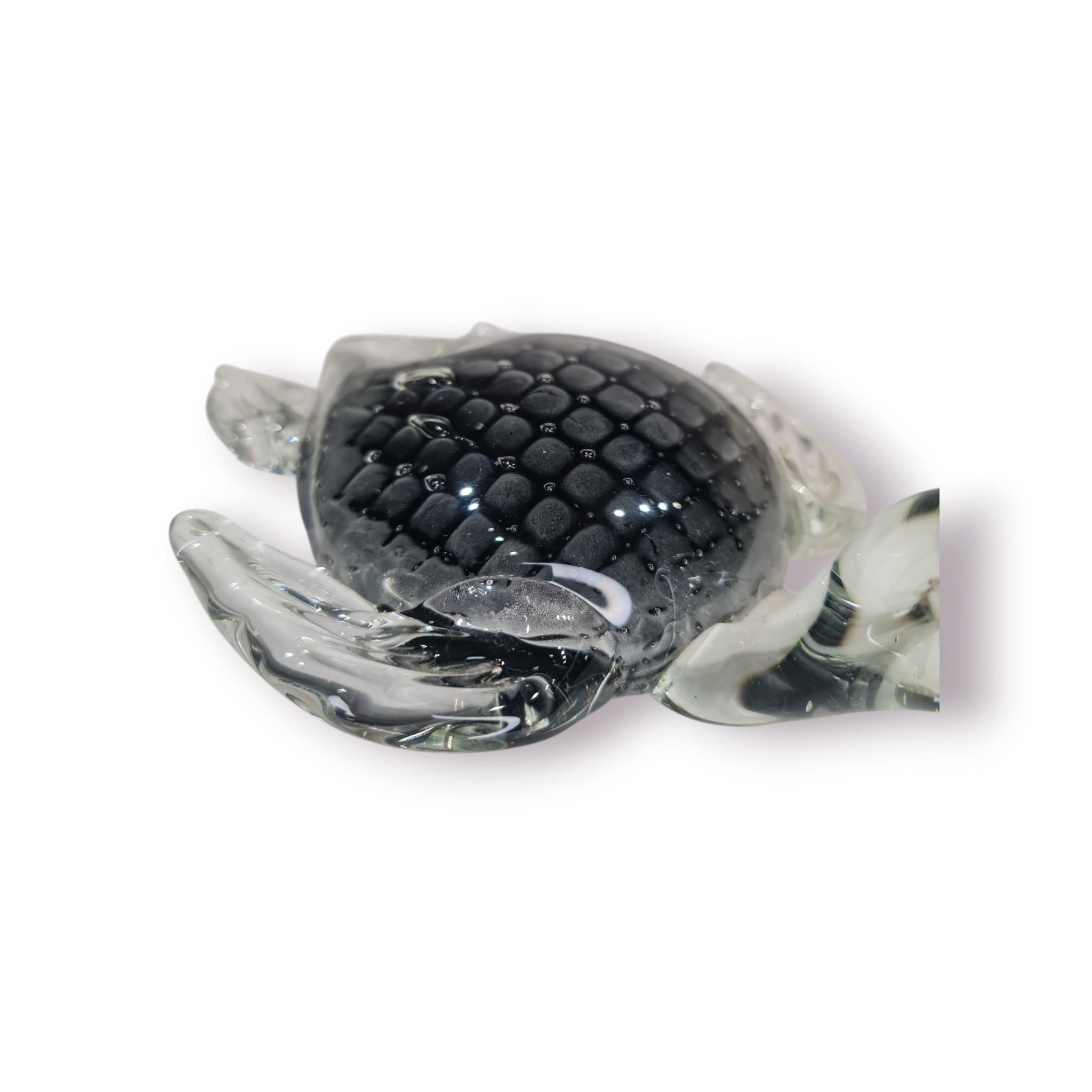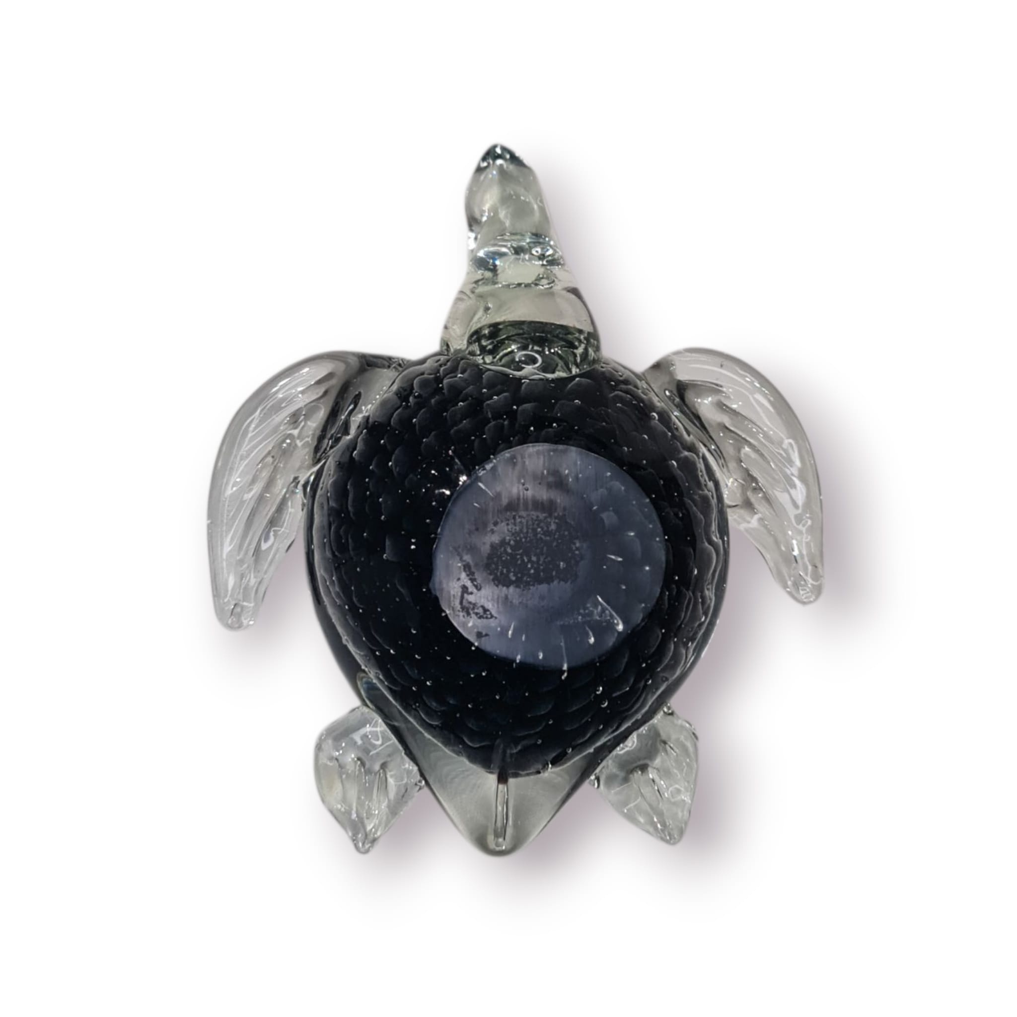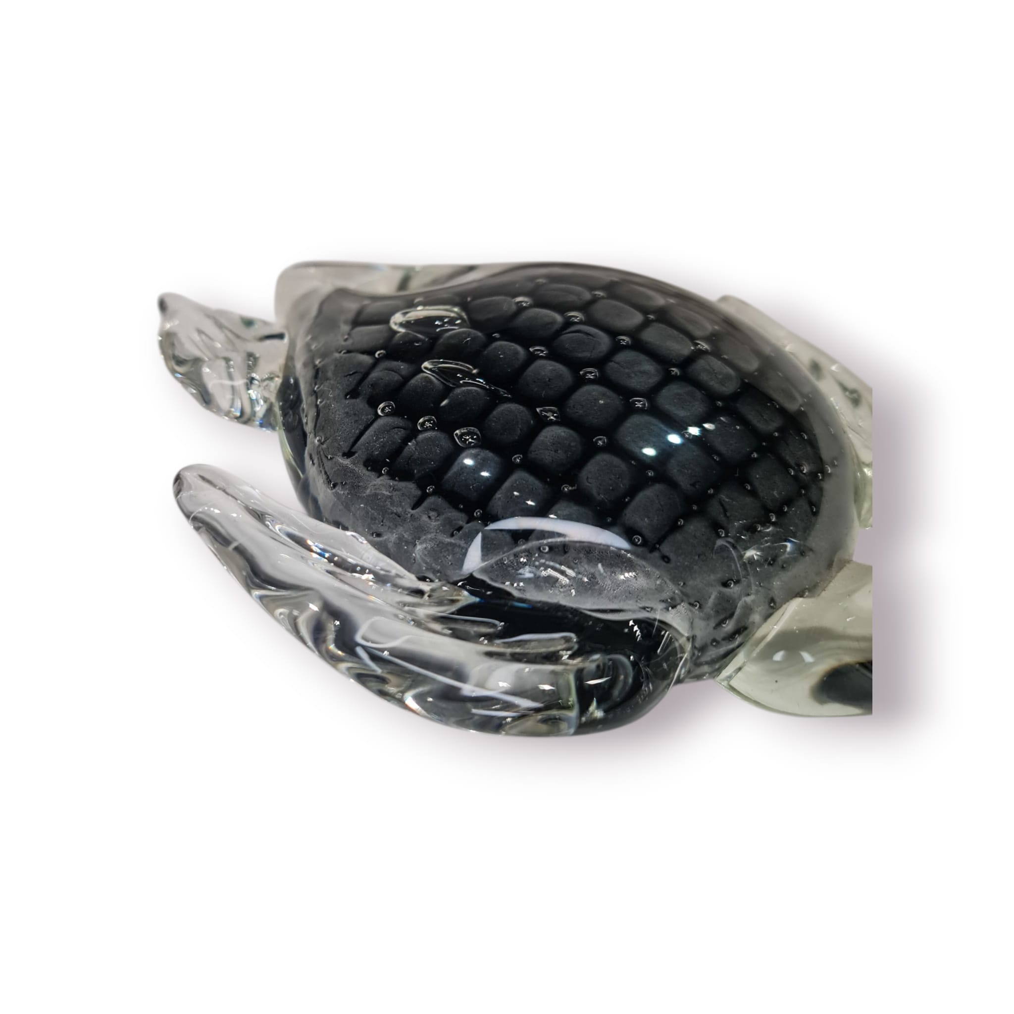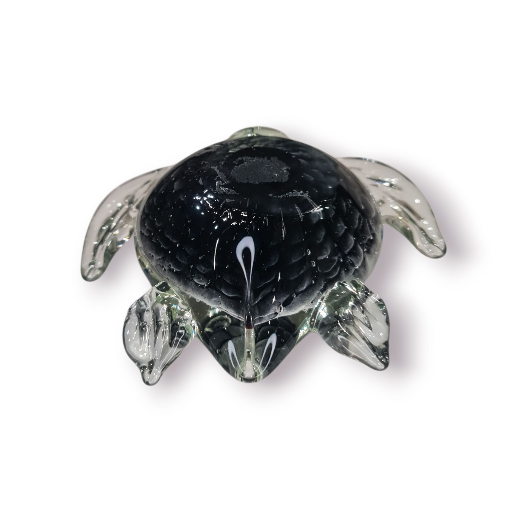 Este elegante pesa-papéis em forma de tartaruga é feito em vidro soprado maciço, combinando peso, brilho e detalhe artesanal. A carapaça preta texturada cria um efeito visual profundo, enquanto as barbatanas translúcidas dão o toque artístico típico do vidro trabalhado à mão.