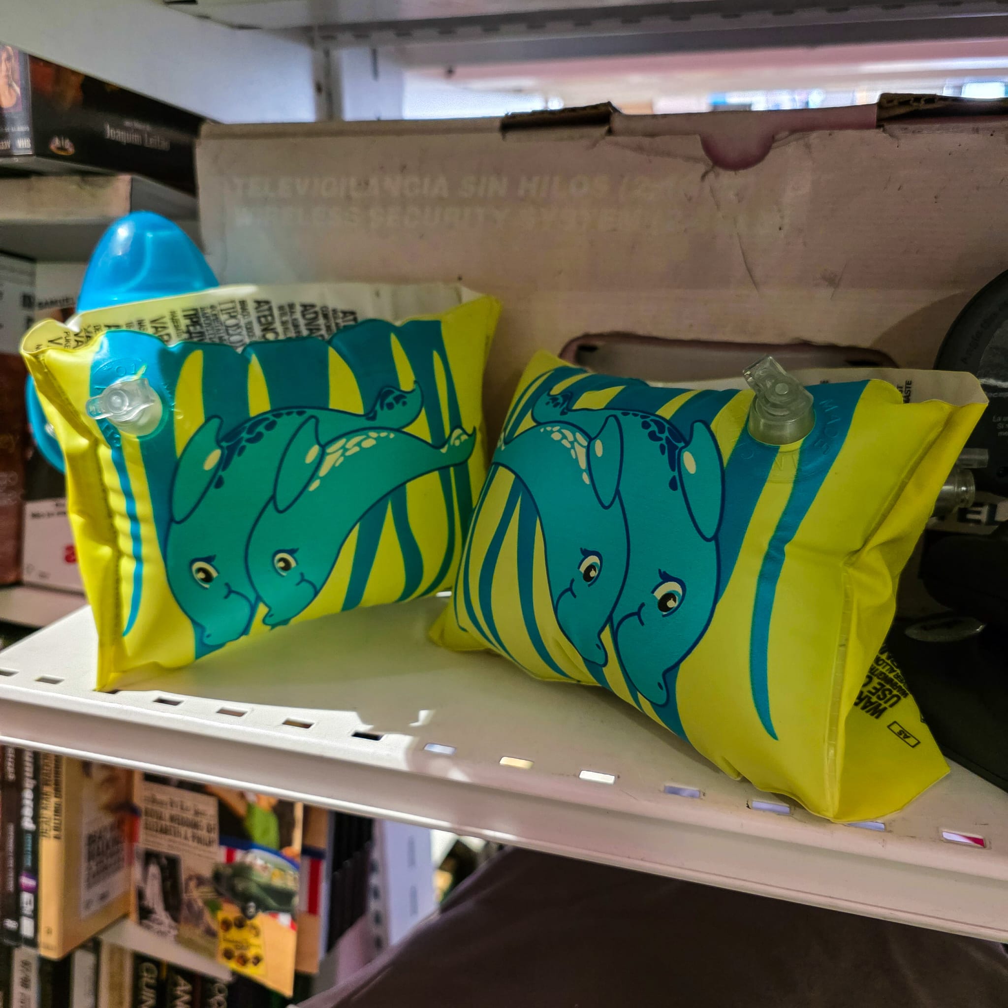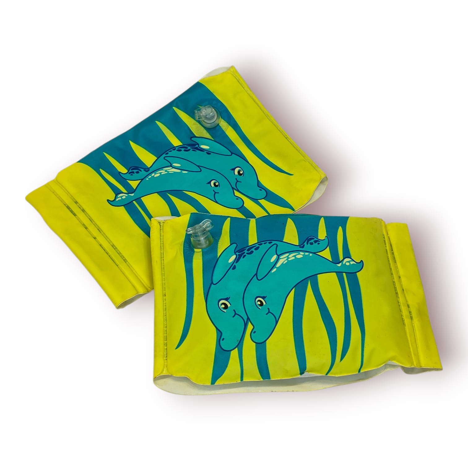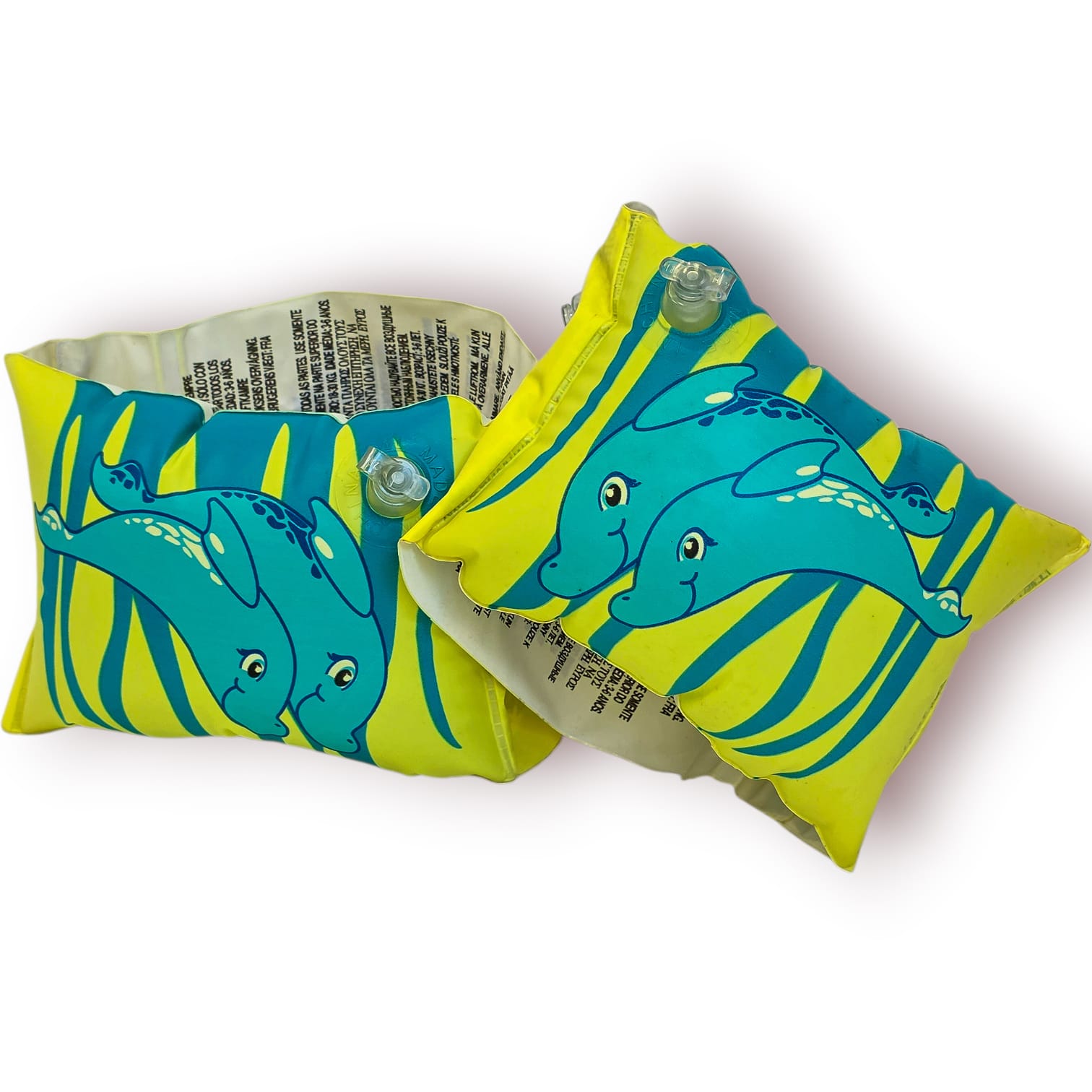 Fabricadas em PVC resistente e decoradas com um alegre motivo de golfinhos azuis sobre fundo amarelo, estas braçadeiras são pensadas para proporcionar estabilidade e flutuação durante a aprendizagem de natação ou momentos de diversão na piscina ou na praia.