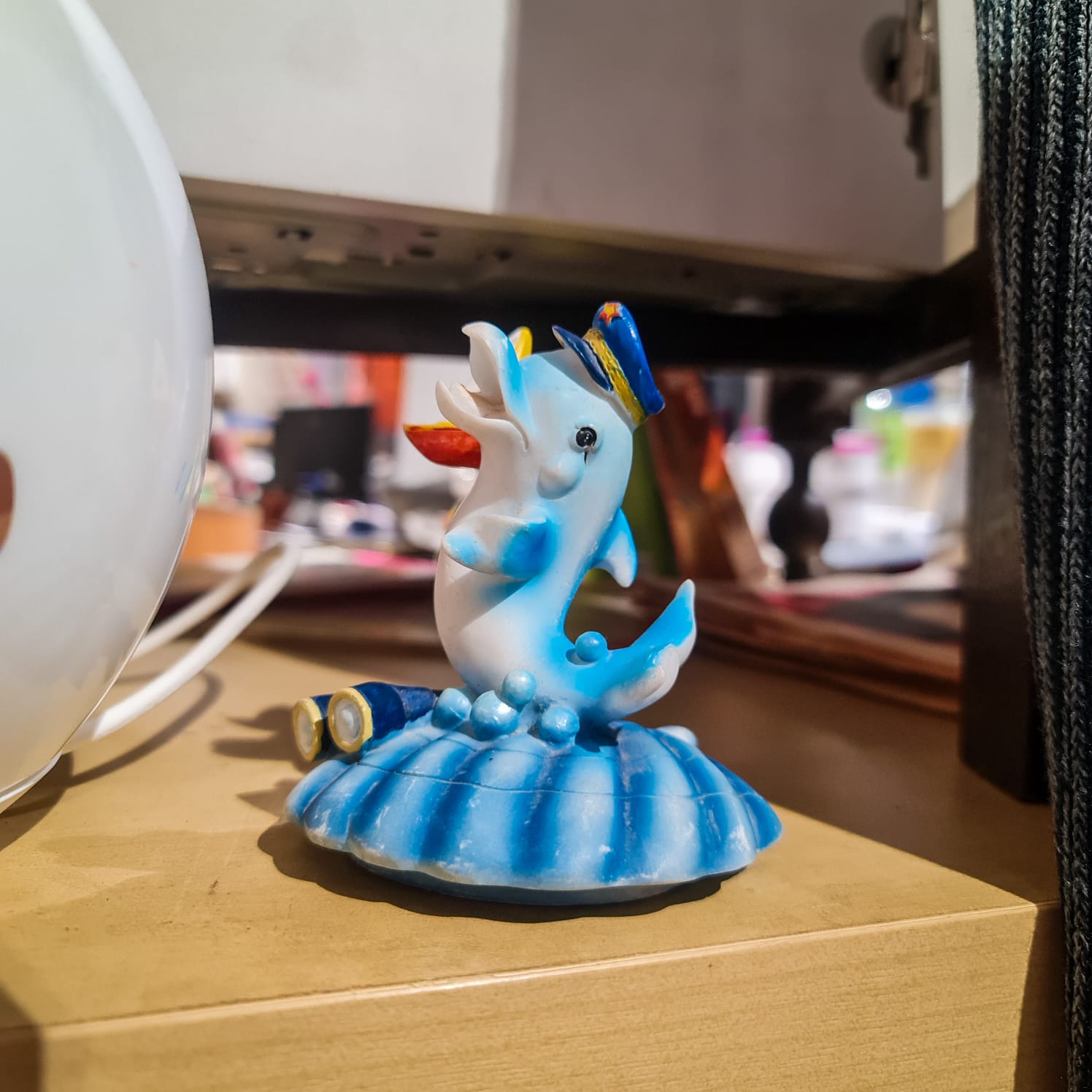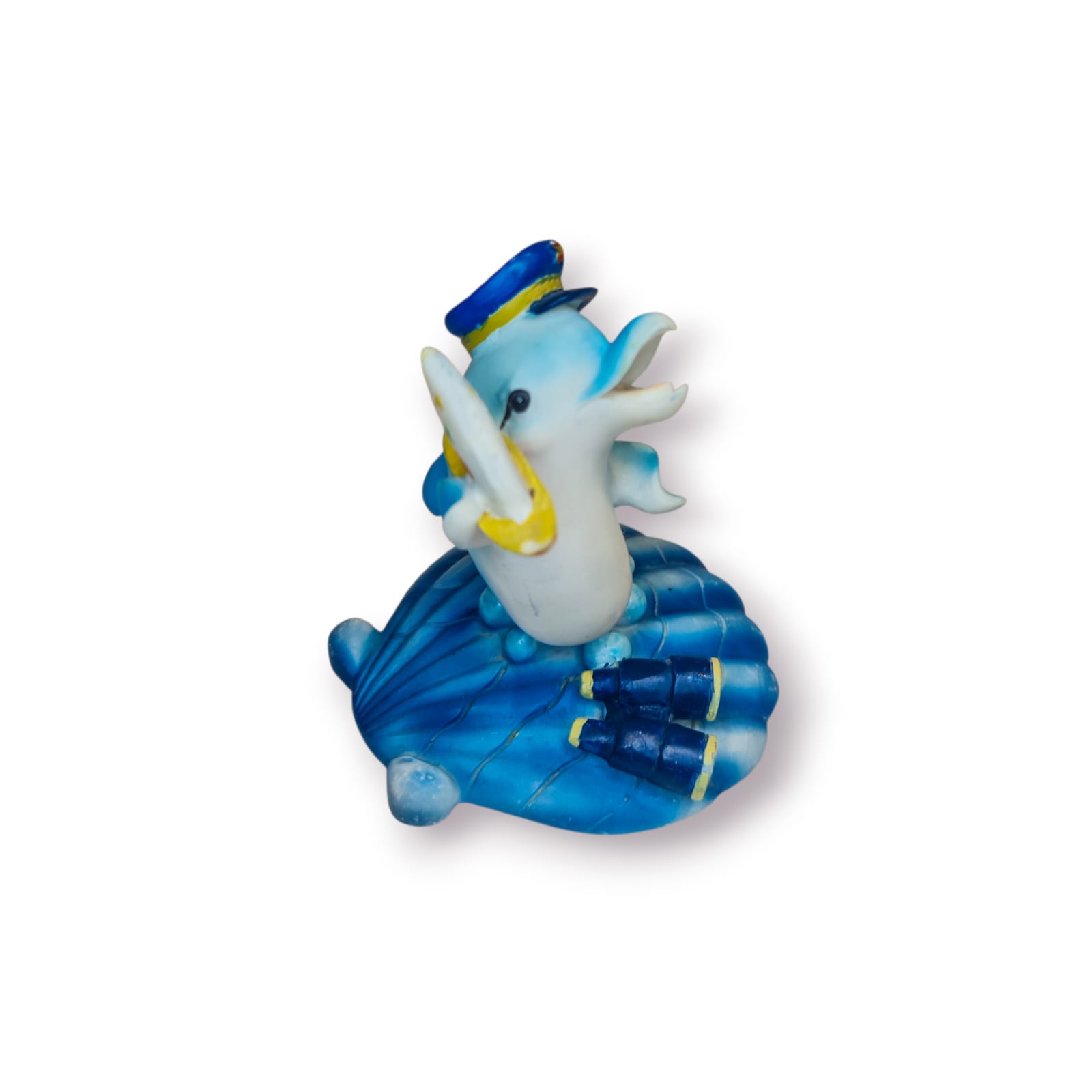 Estatueta decorativa em resina representando um golfinho marinheiro, com chapéu náutico e pequenos detalhes marítimos, pousado sobre uma concha estilizada. Uma peça cheia de charme e expressão, ideal para decoração temática de mar, praia ou ambiente infantil, mas também muito procurada por colecionadores de peças decorativas náuticas.