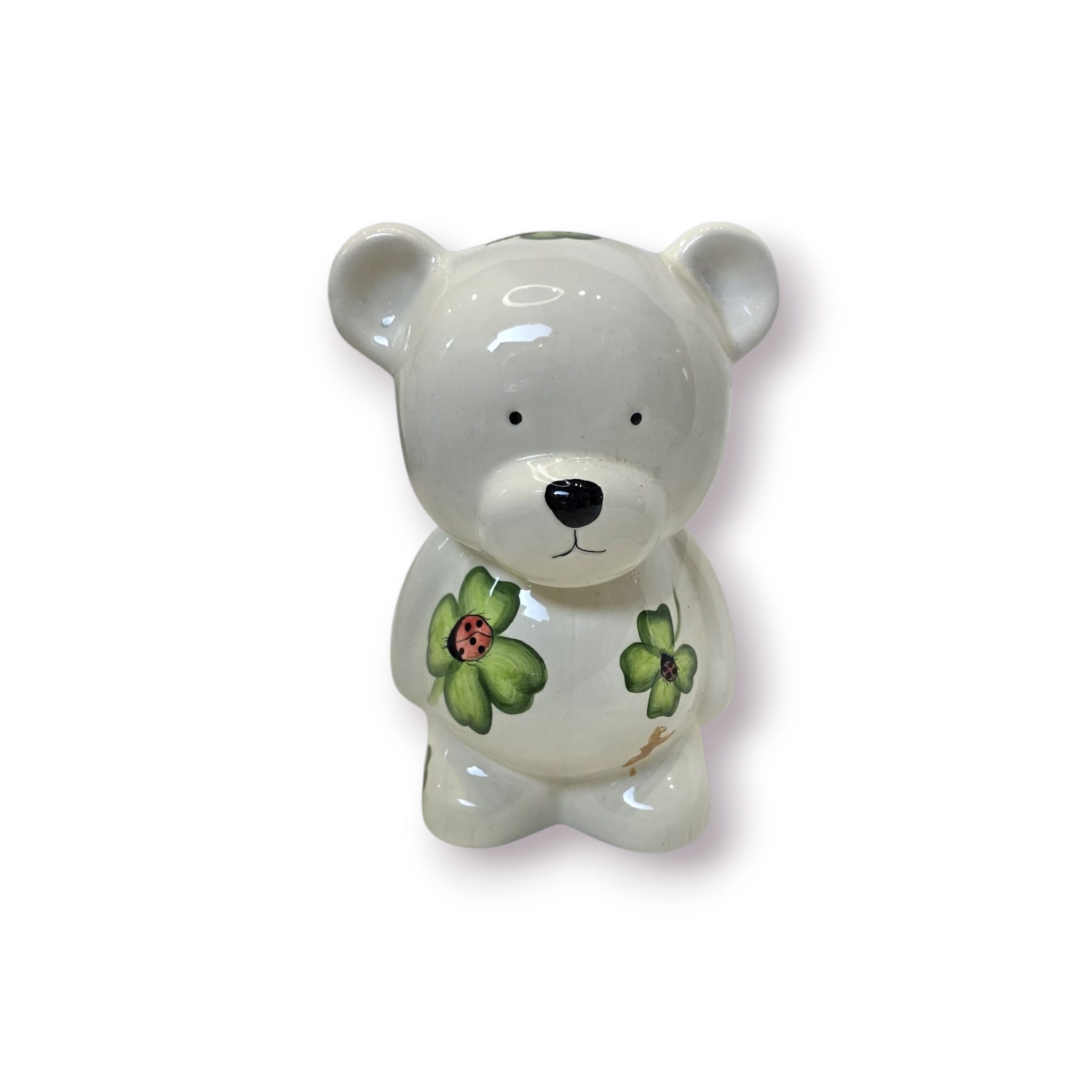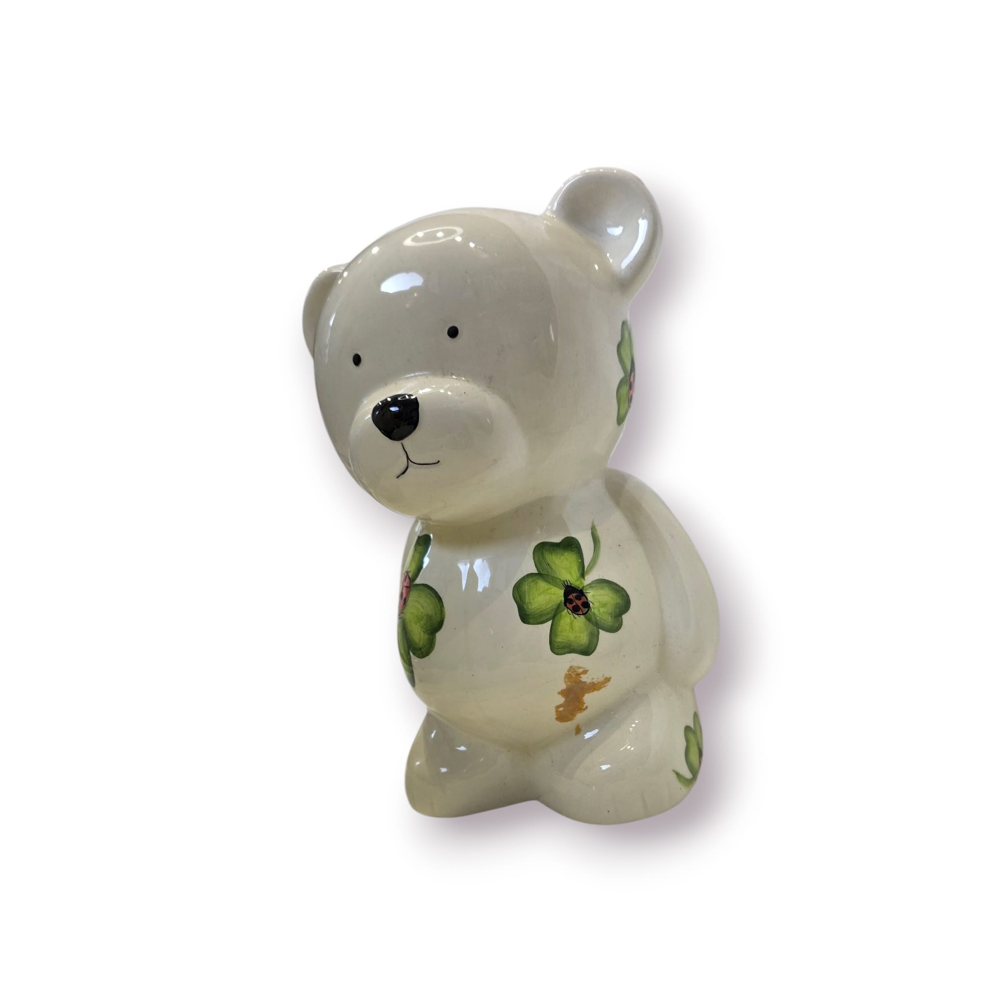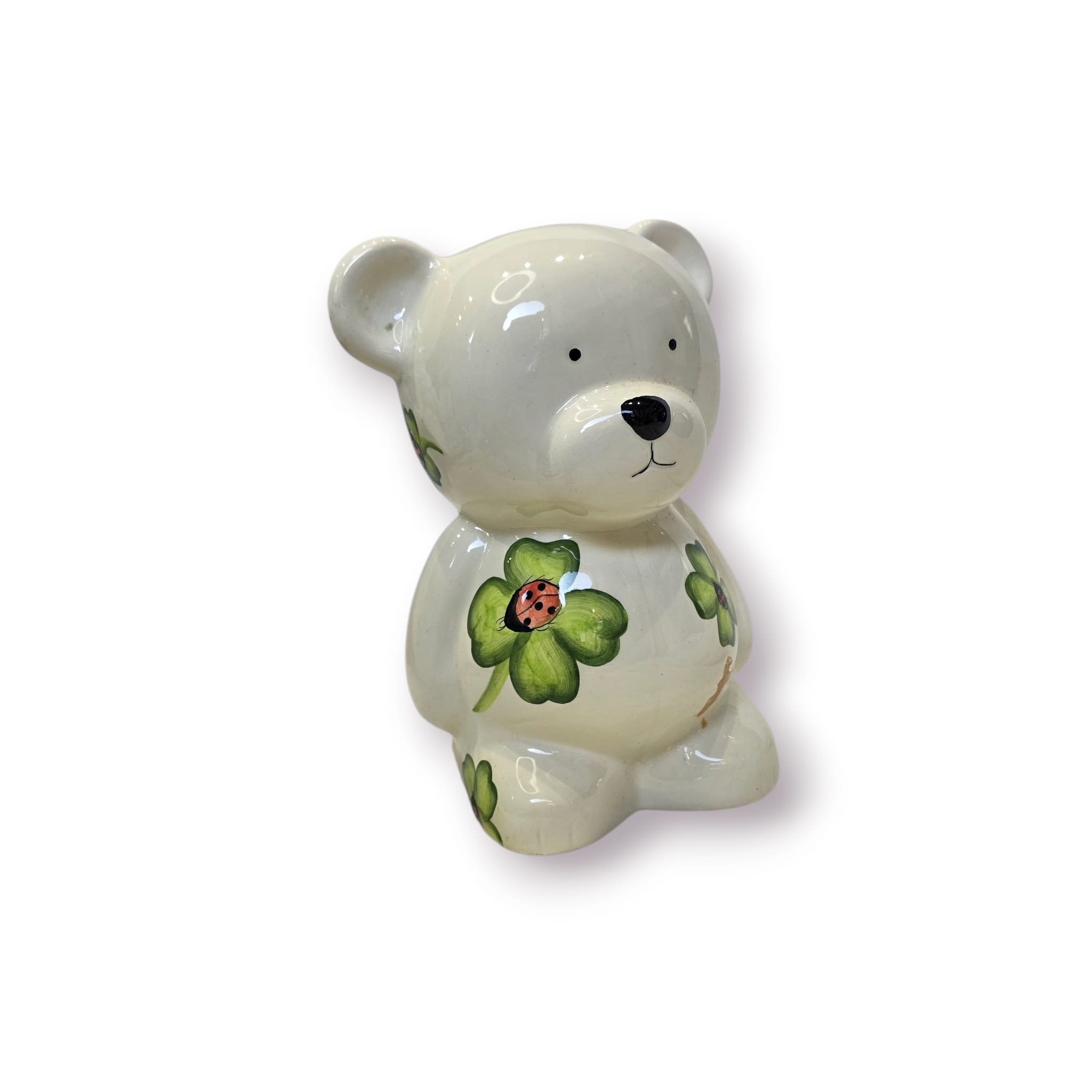 Cofre decorativo em cerâmica vidrada, em formato de ursinho, decorado com trevos verdes e joaninhas pintadas à mão.