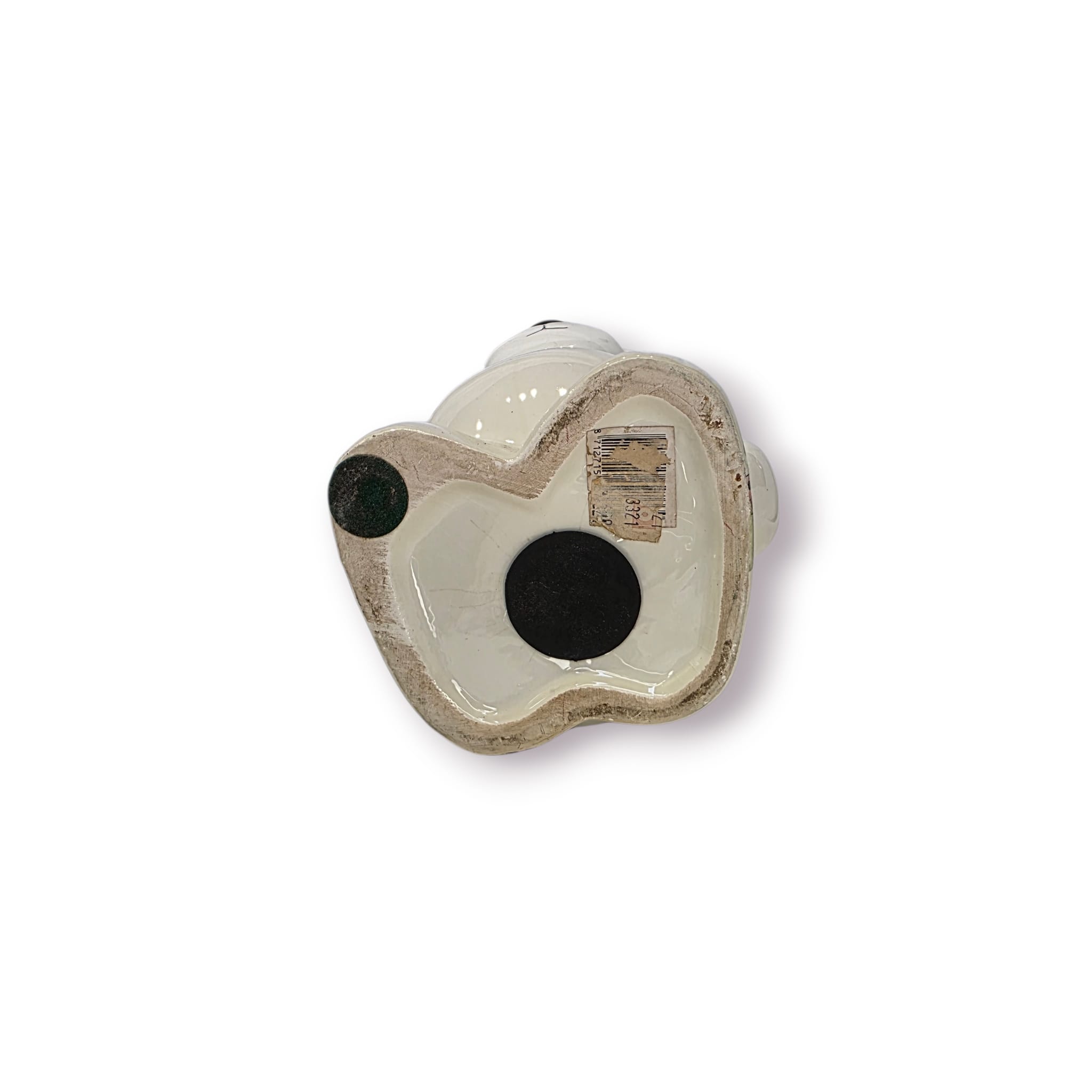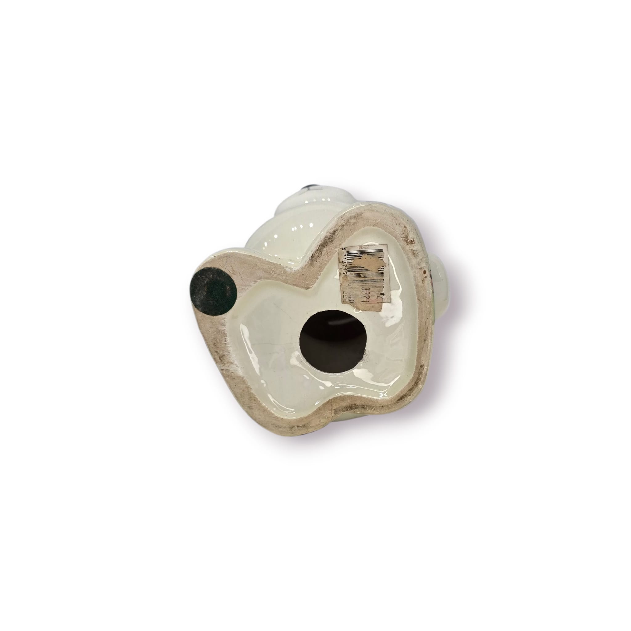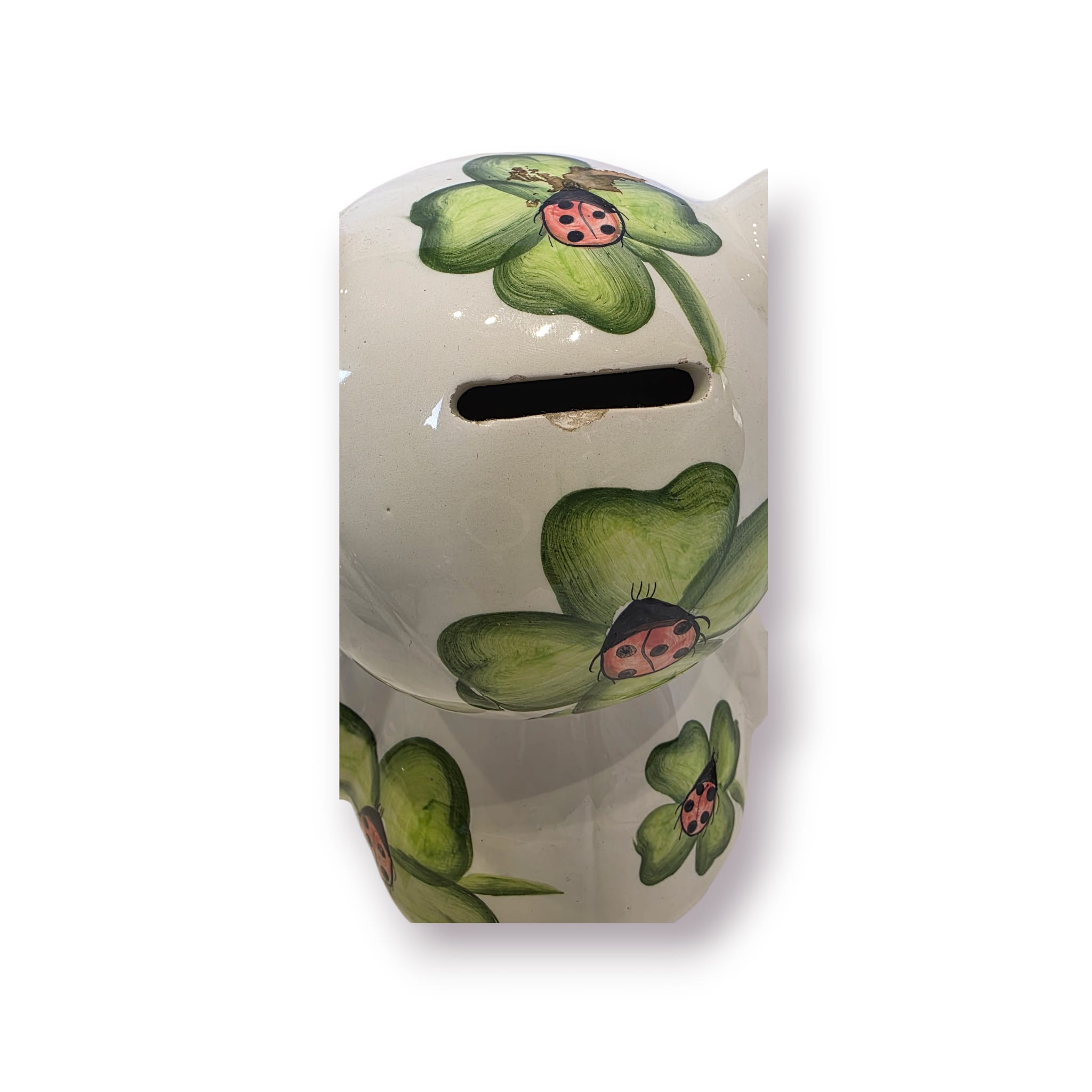 Cofre decorativo em cerâmica vidrada, em formato de ursinho, decorado com trevos verdes e joaninhas pintadas à mão.