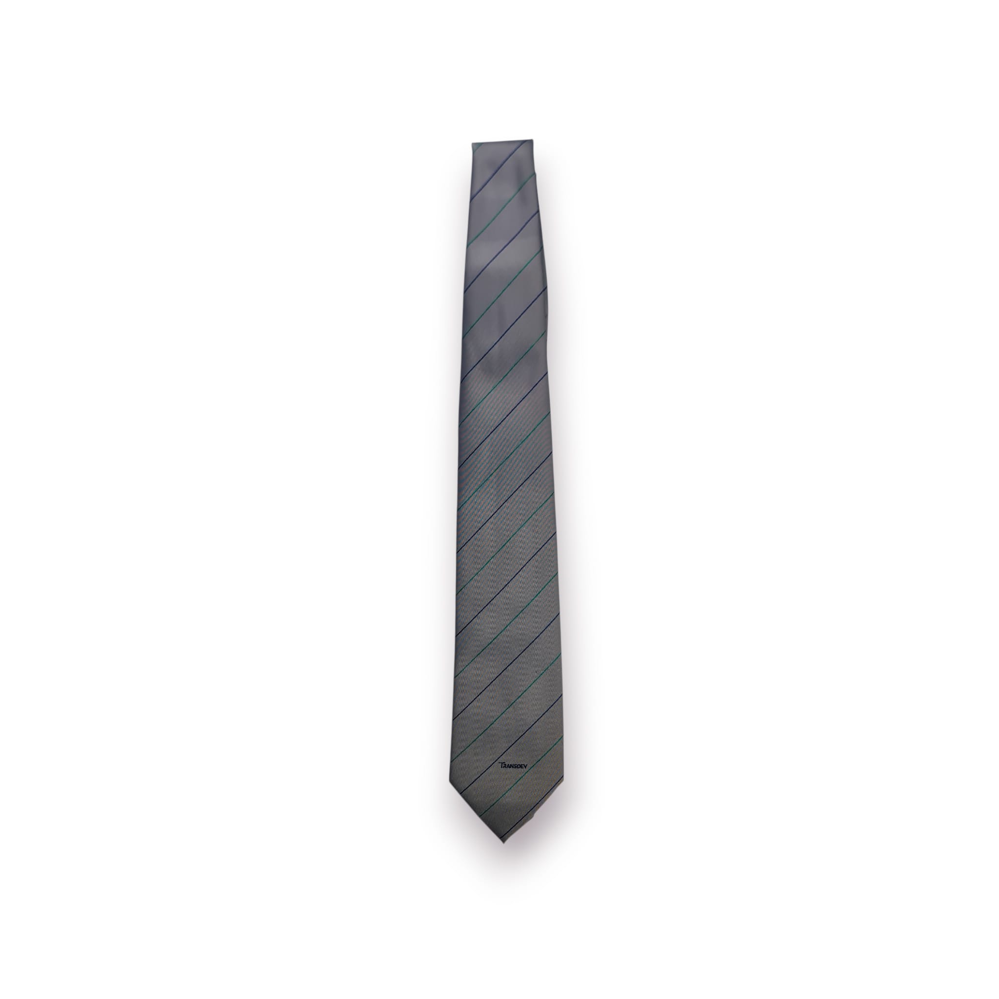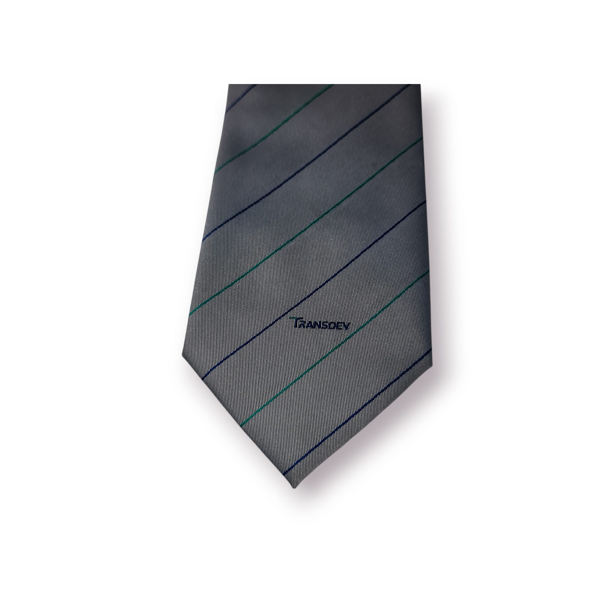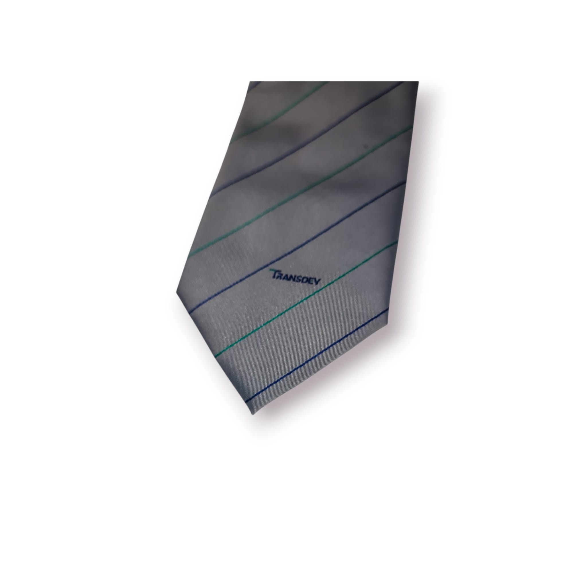 Gravata clássica de fabrico italiano da prestigiada Mariani Milano, com padrão de riscas diagonais em tons discretos e assinatura “Transdev”, conferindo-lhe um carácter institucional e corporativo muito próprio.