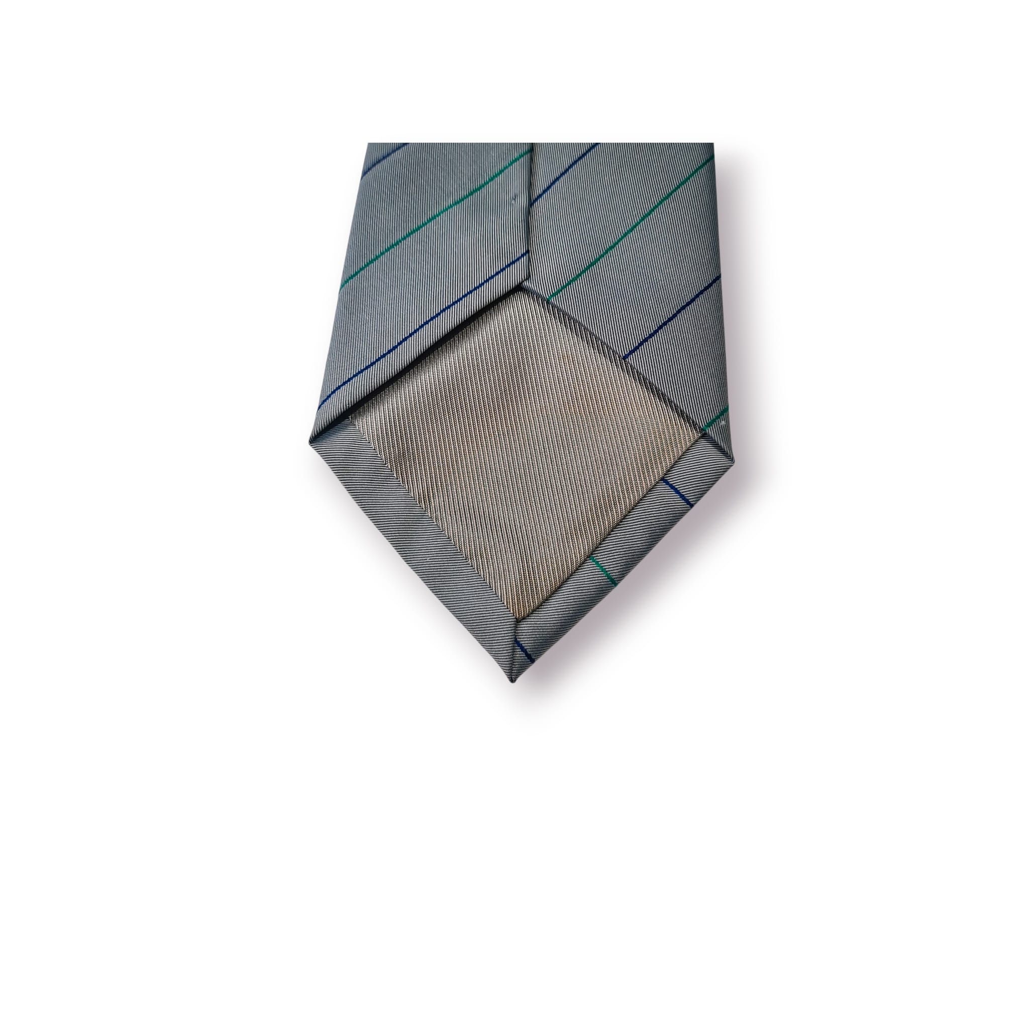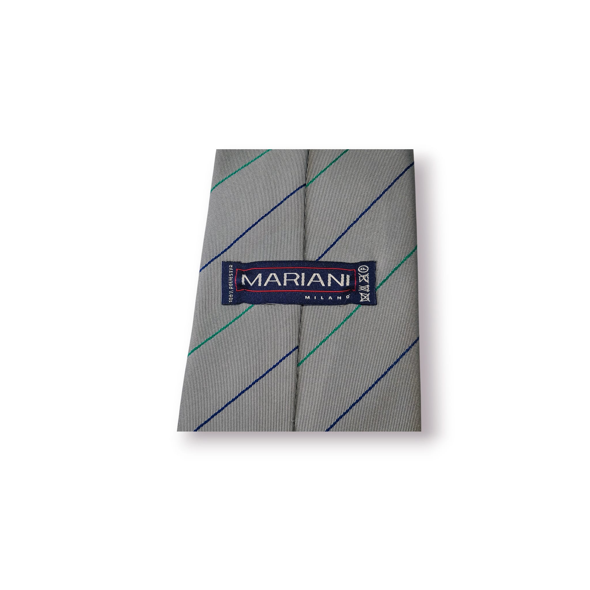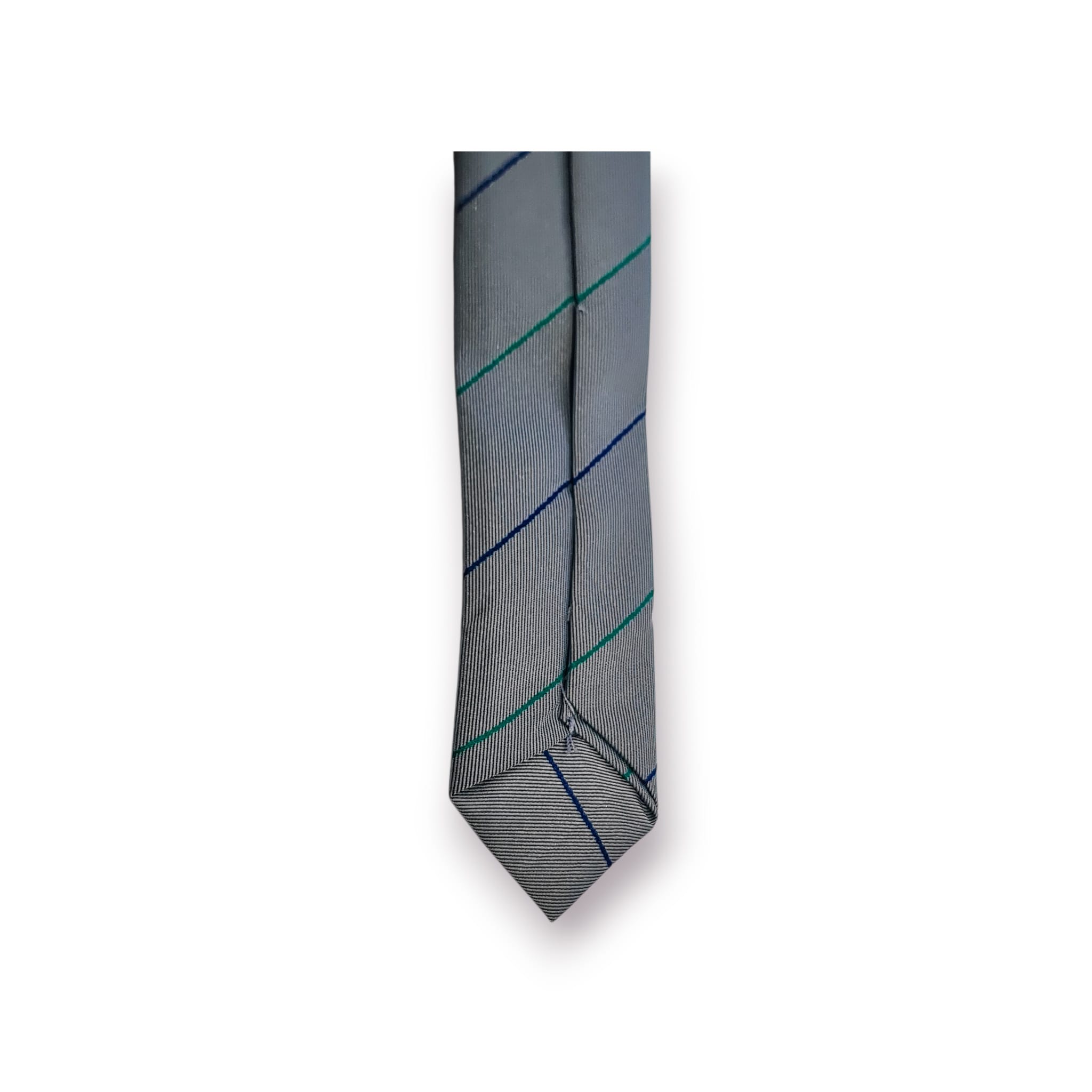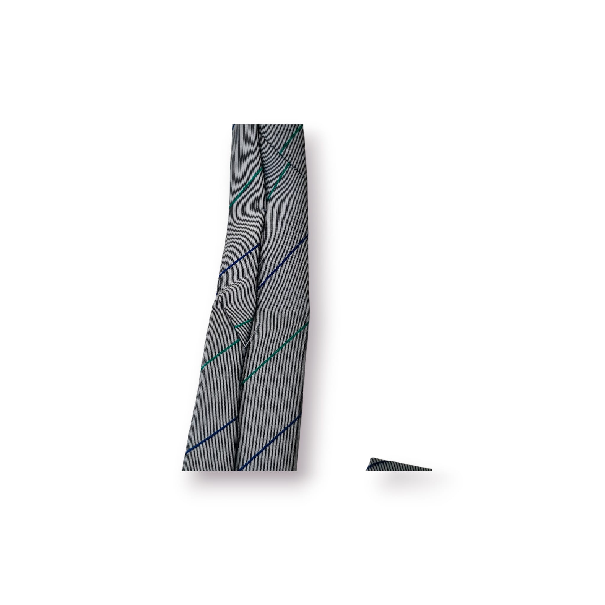 Gravata clássica de fabrico italiano da prestigiada Mariani Milano, com padrão de riscas diagonais em tons discretos e assinatura “Transdev”, conferindo-lhe um carácter institucional e corporativo muito próprio.