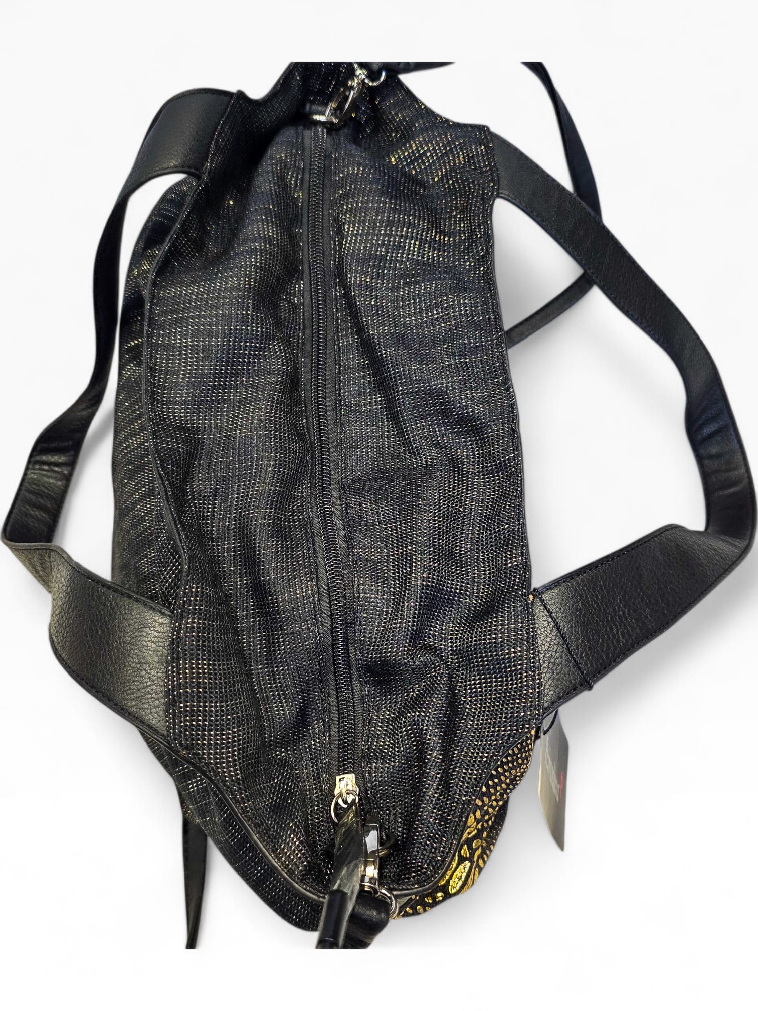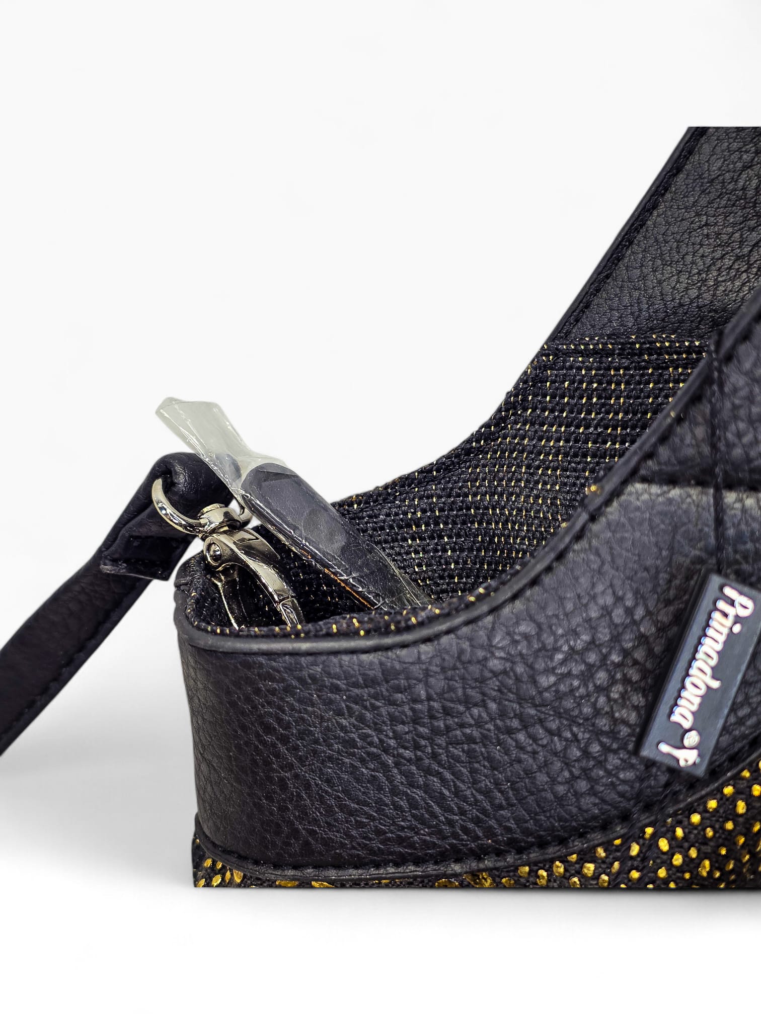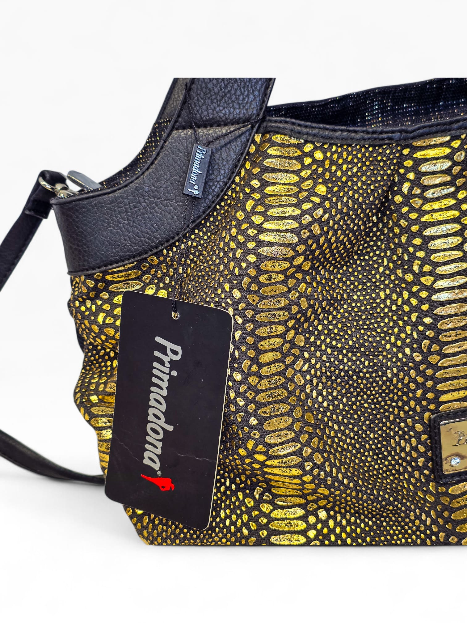 Mala da marca Primadonna, com padrão animal print em preto e dourado metalizado, criando um efeito sofisticado e marcante.