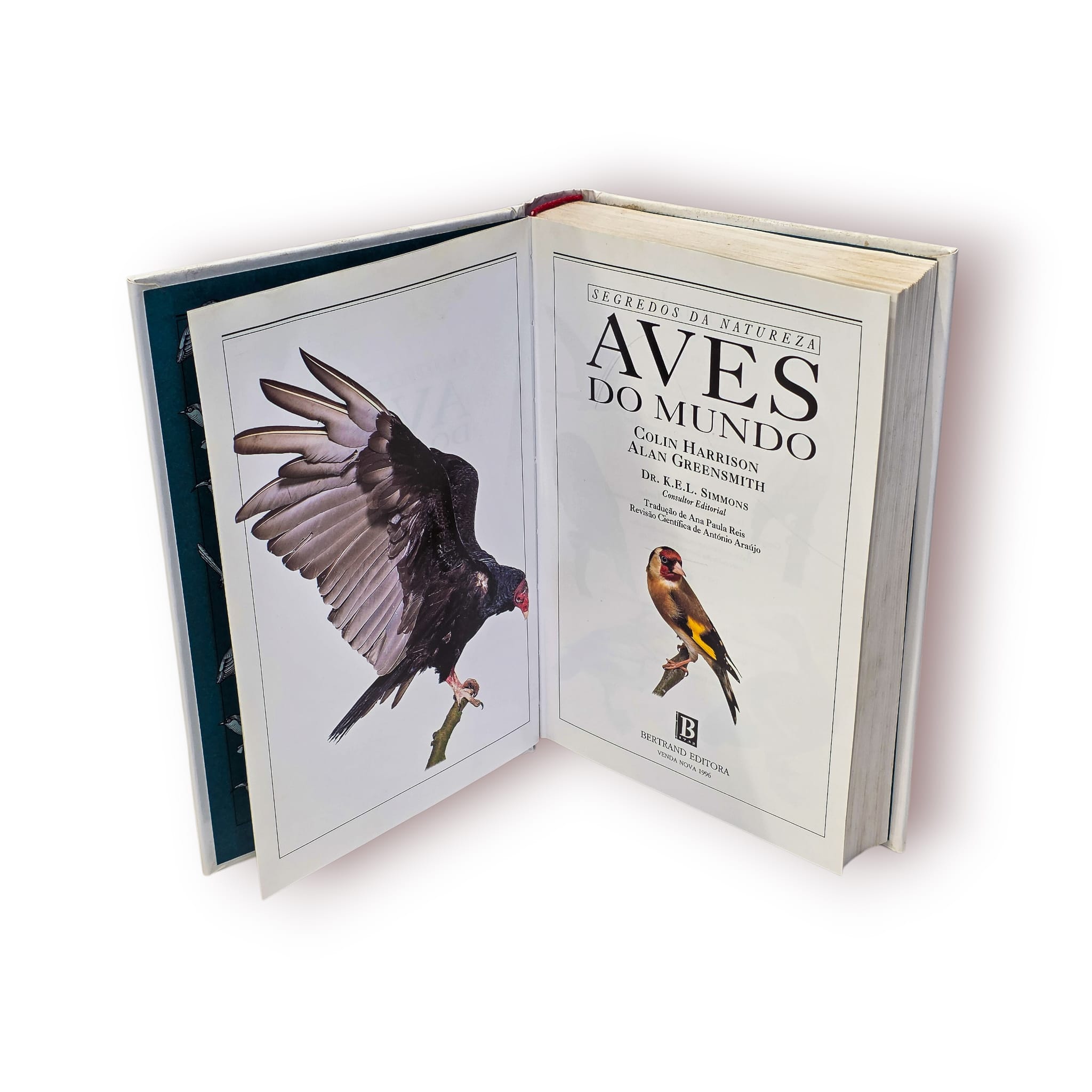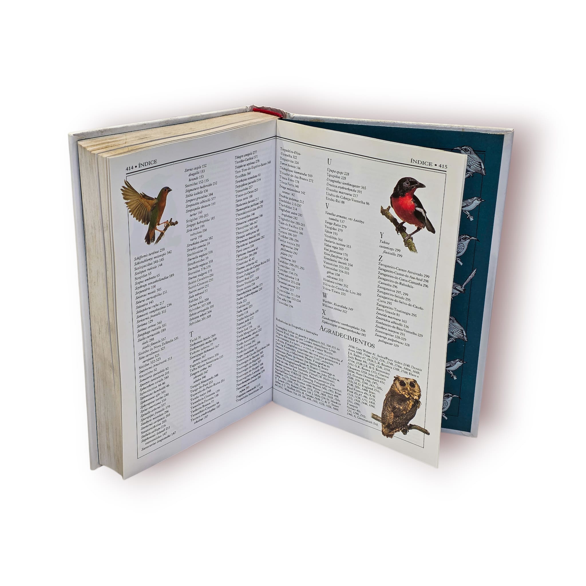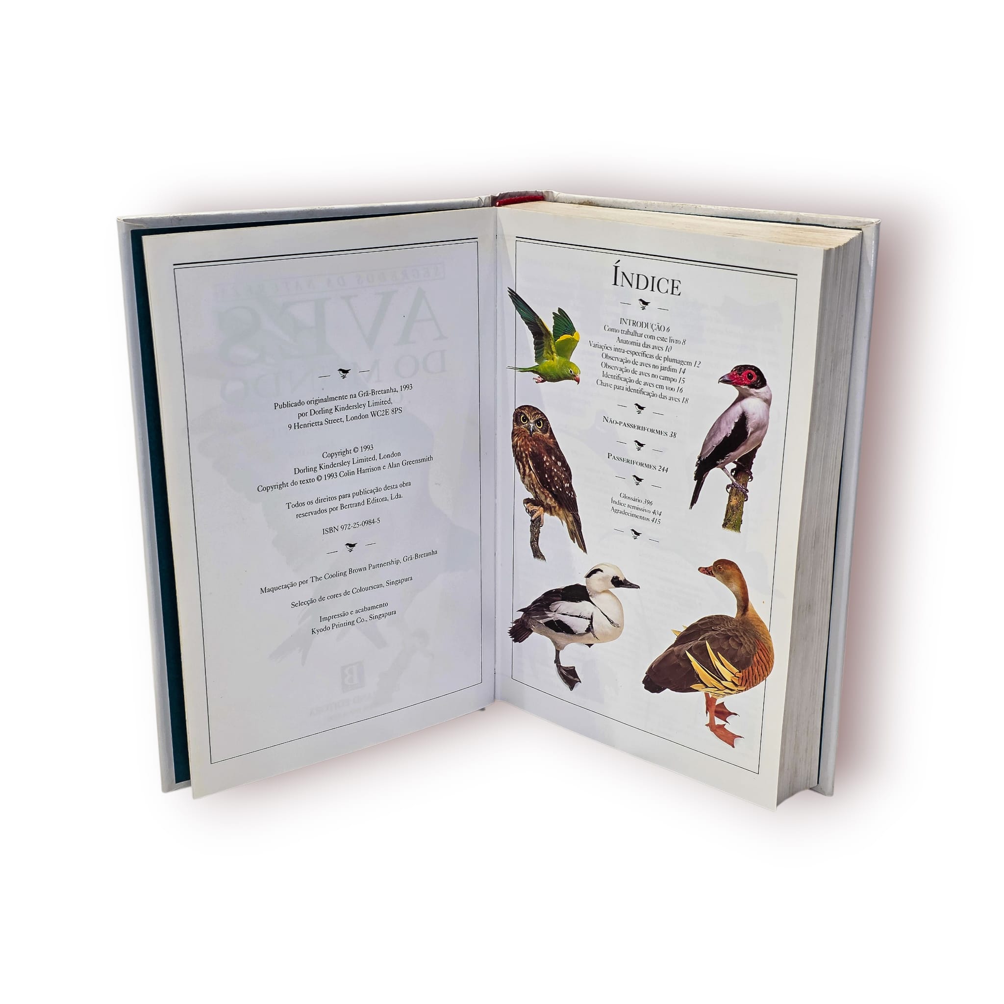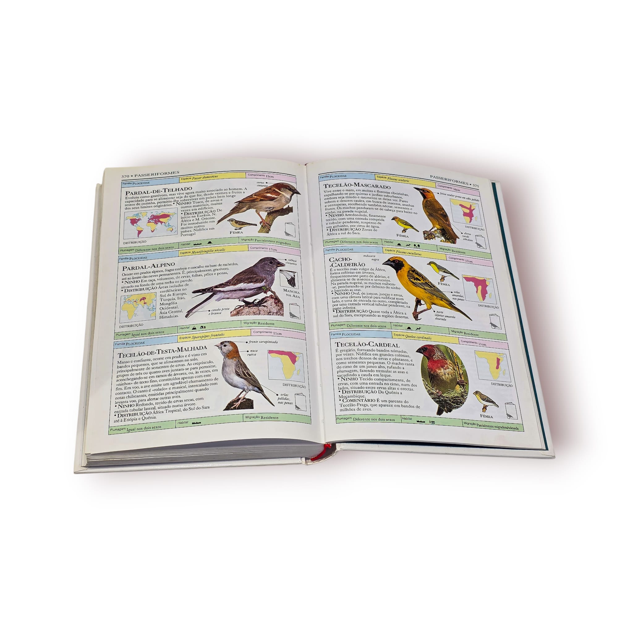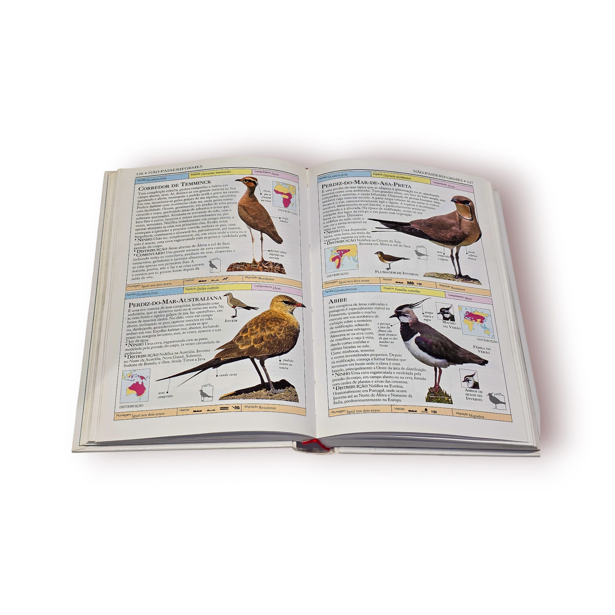 A obra apresenta organização clara por espécies, com fotografias, ilustrações e mapas que facilitam a identificação rápida das aves em diferentes regiões do mundo.