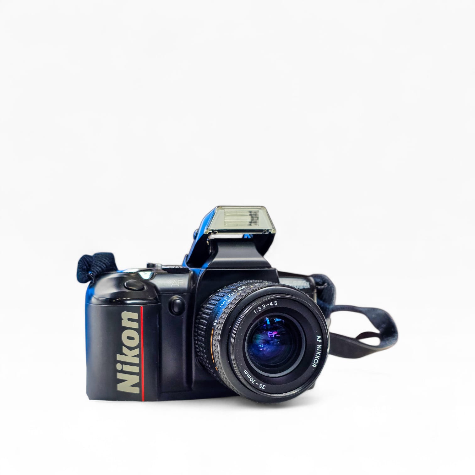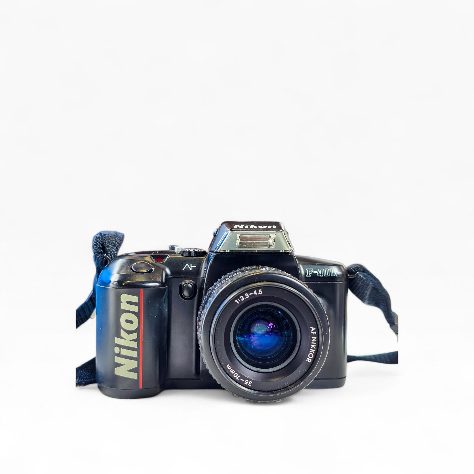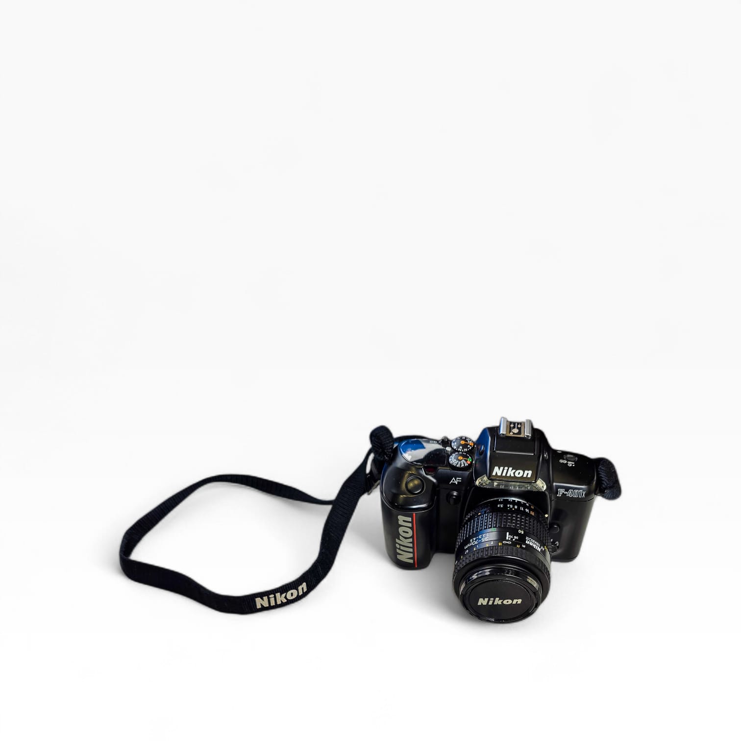 Câmara reflex analógica Nikon F-401x equipada com lente AF Nikkor 35-70mm f/3.3-4.5.