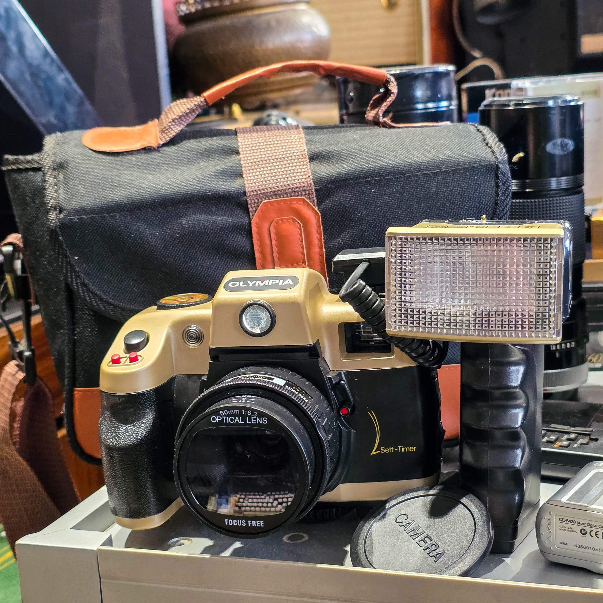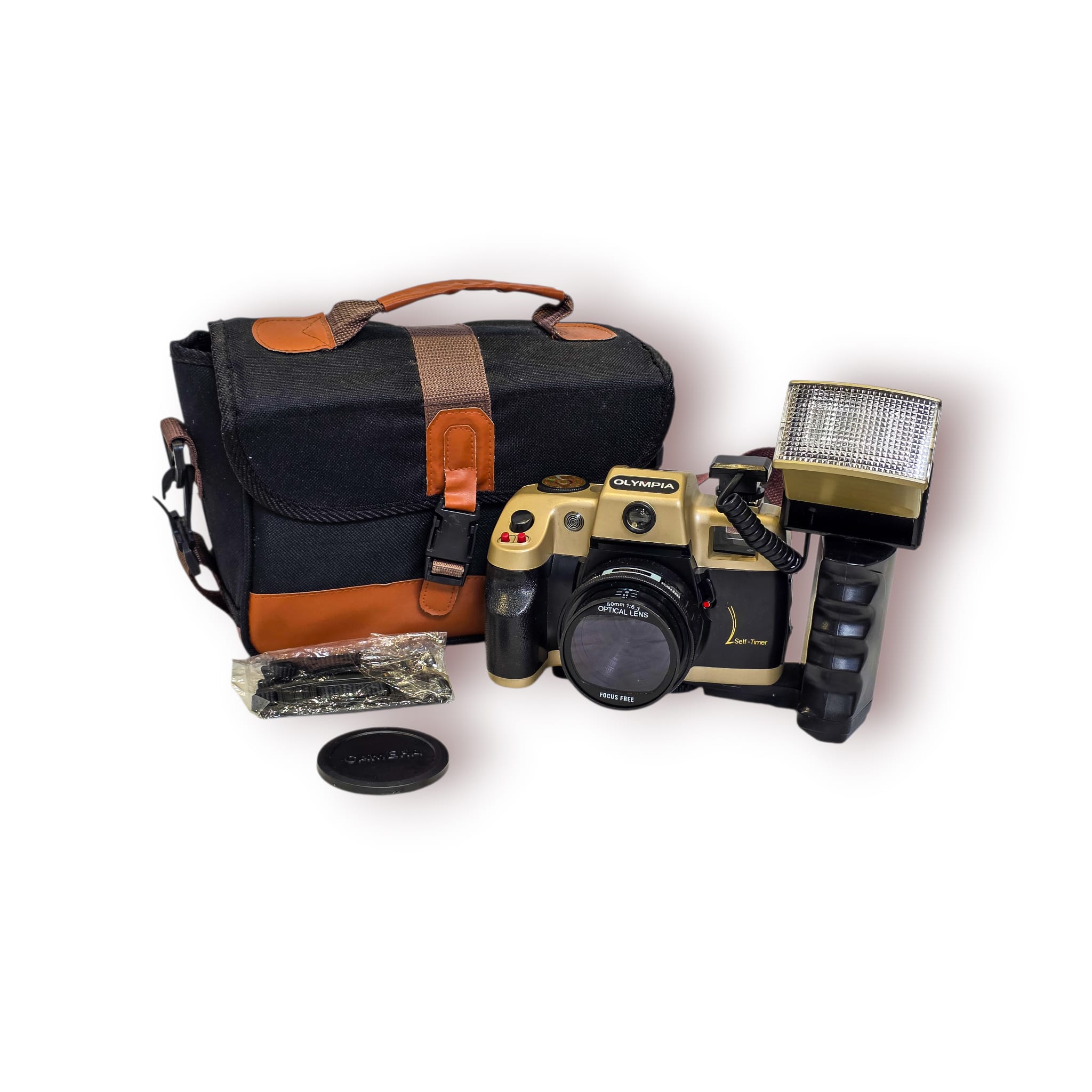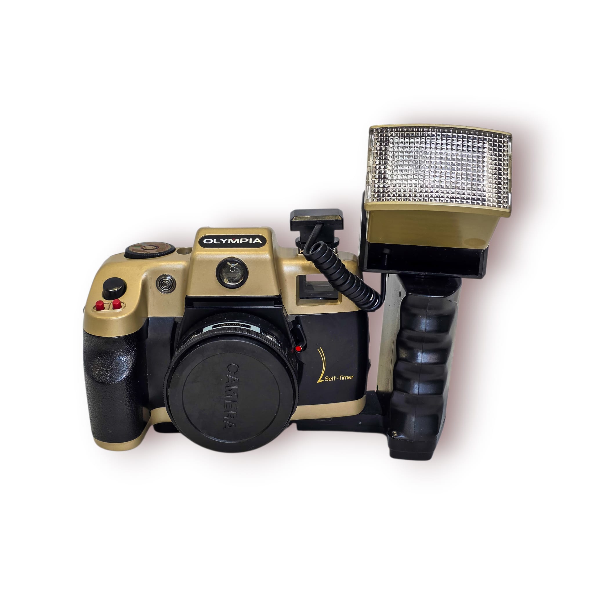 Uma peça imponente e cheia de personalidade! Esta máquina fotográfica Olympia NK4040 destaca-se pelo seu design robusto e pelo conjunto completo com flash integrado e punho ergonómico — uma verdadeira representação da fotografia analógica dos anos 80/90.