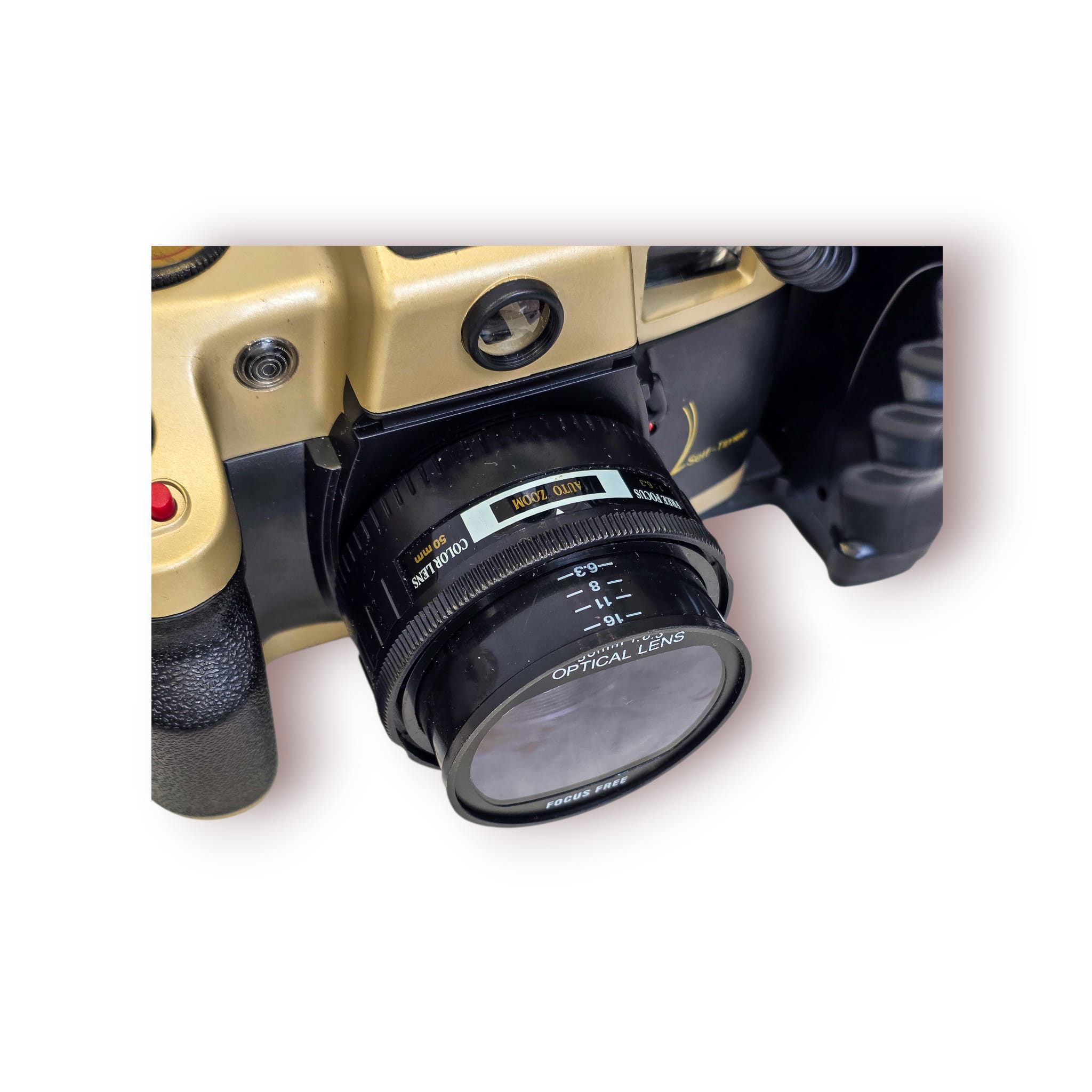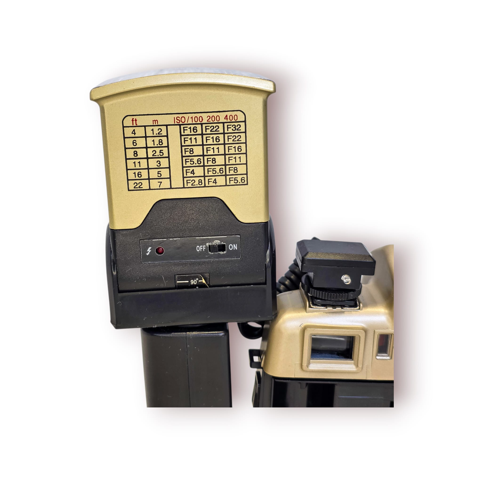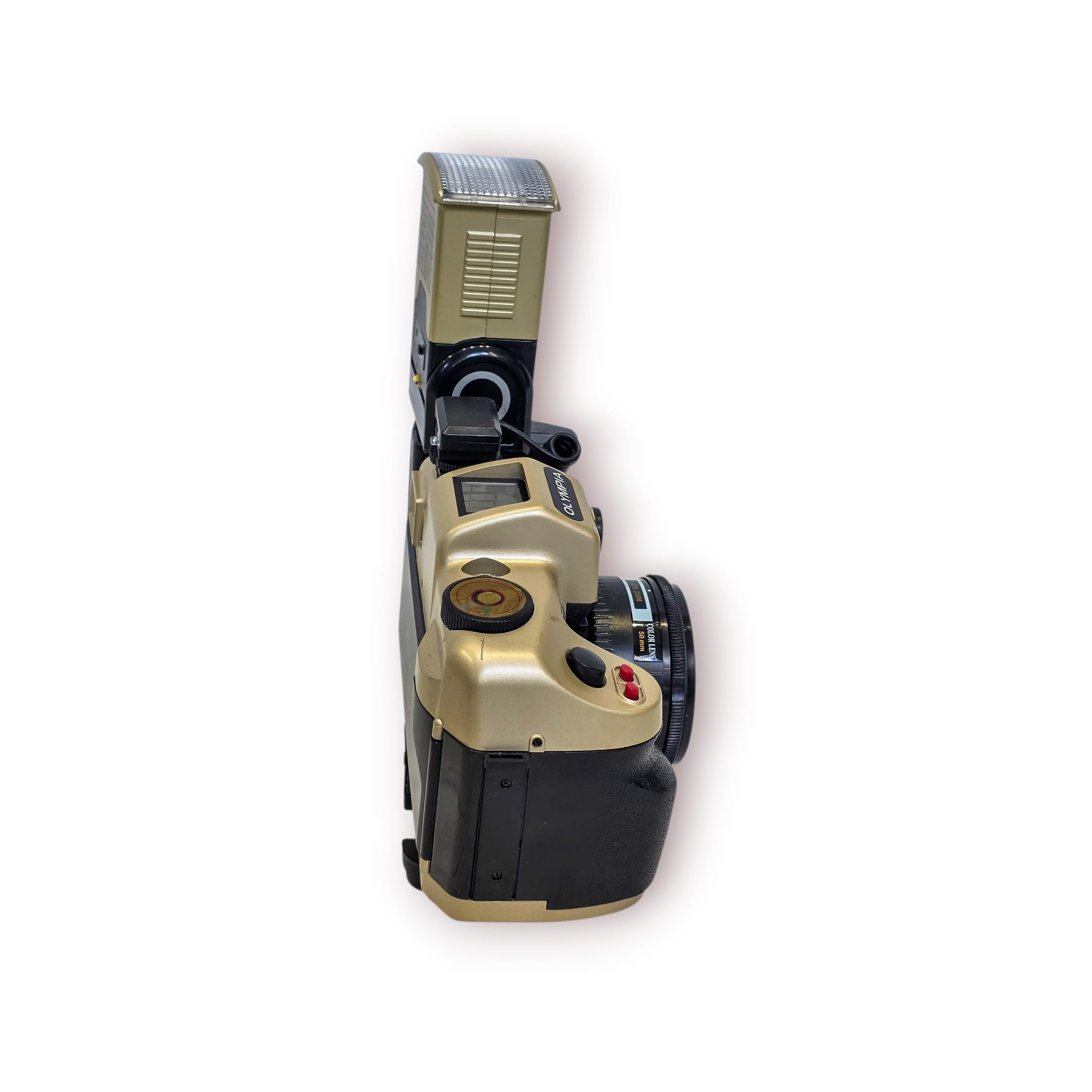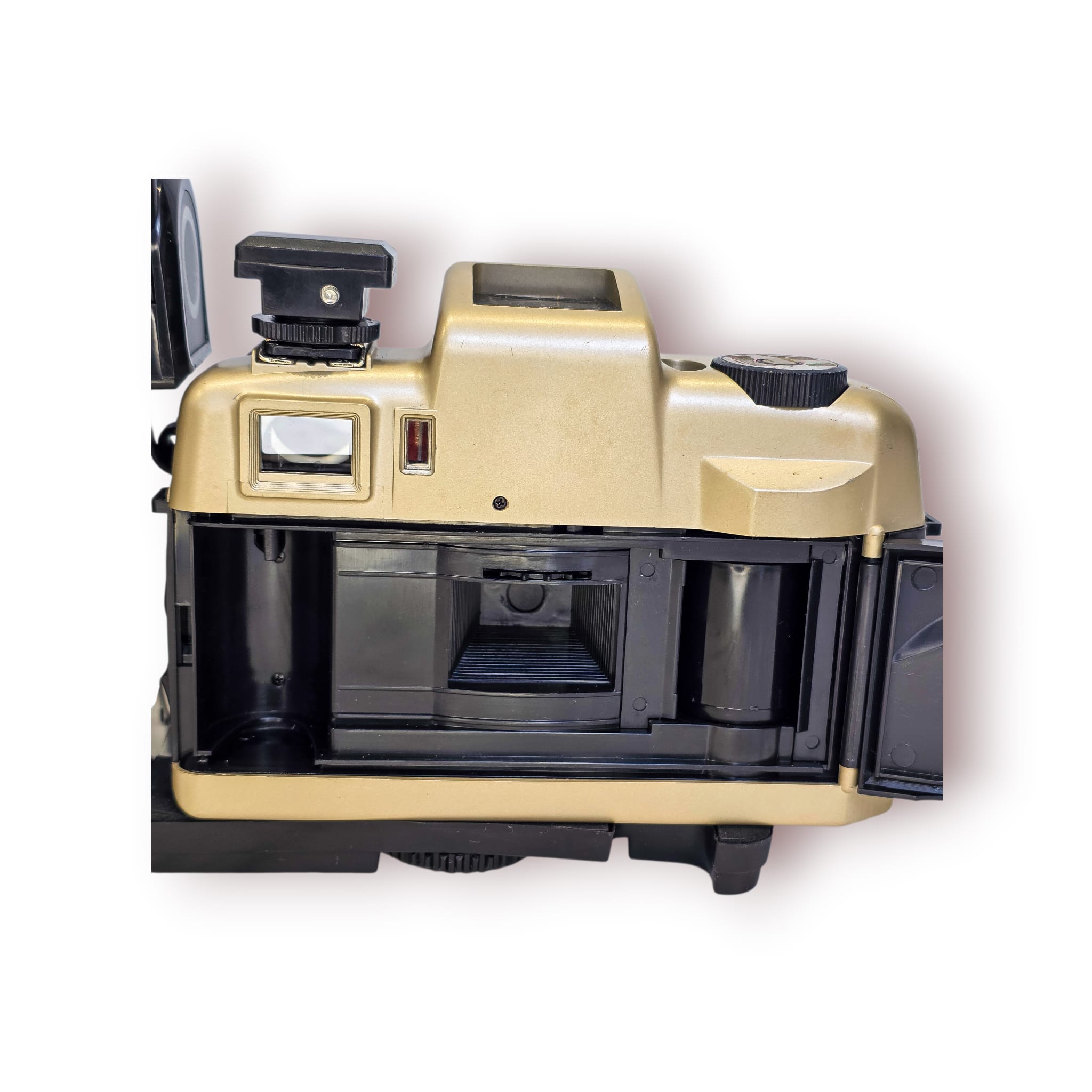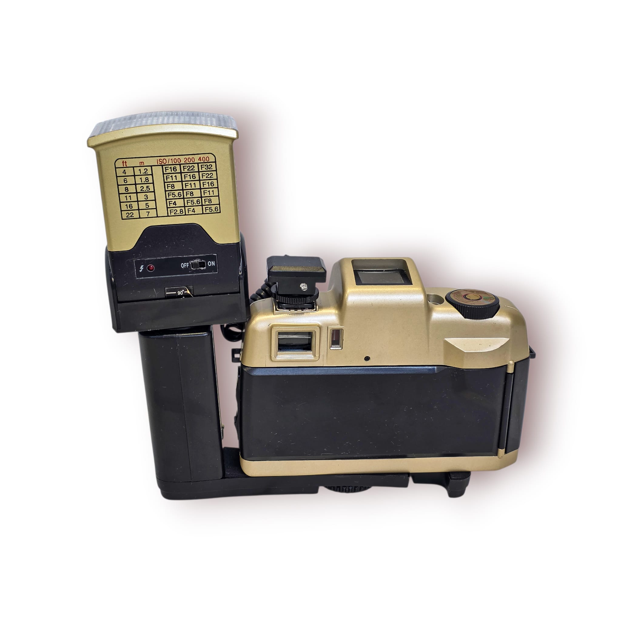 Equipada com lente 50mm f/6.3, sistema focus free e self-timer funcional, esta câmara encontra-se testada e pronta a utilizar. O flash com braço articulado e o grip lateral conferem-lhe não só funcionalidade, mas também um visual marcante que a torna perfeita para coleção ou decoração.