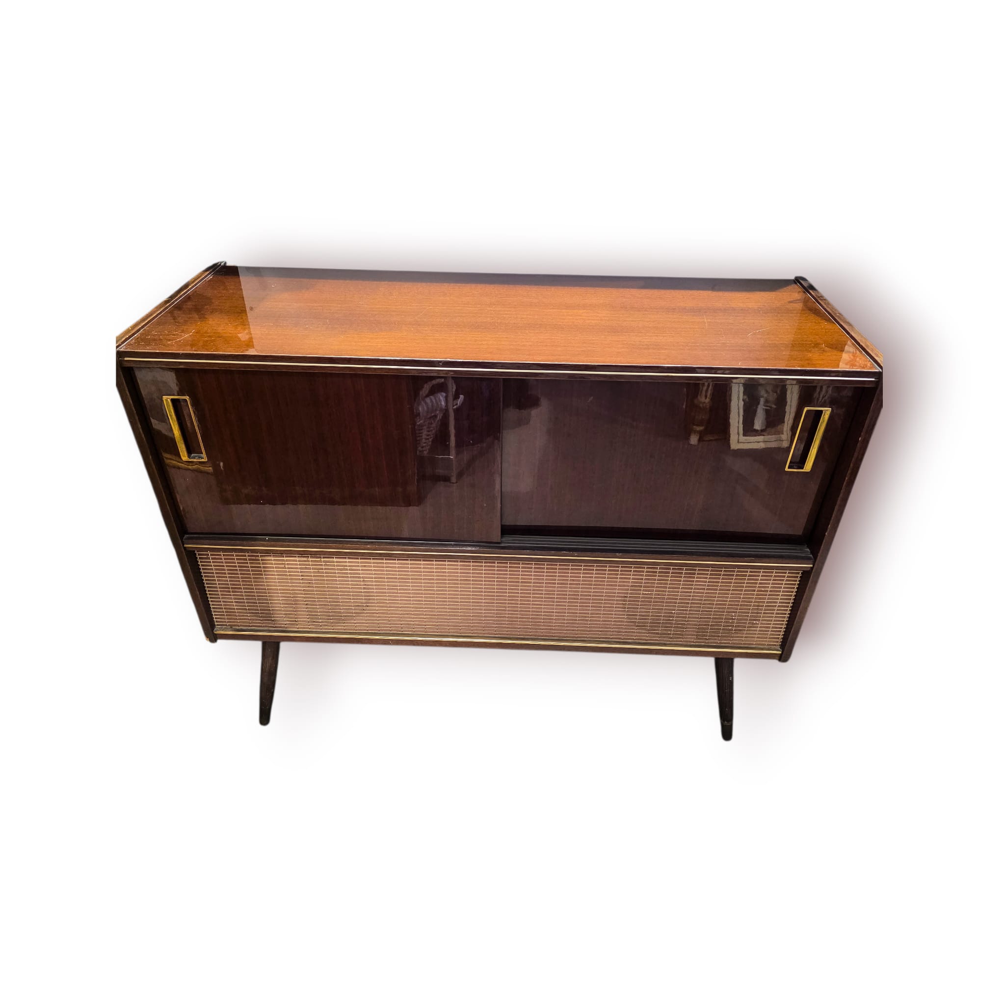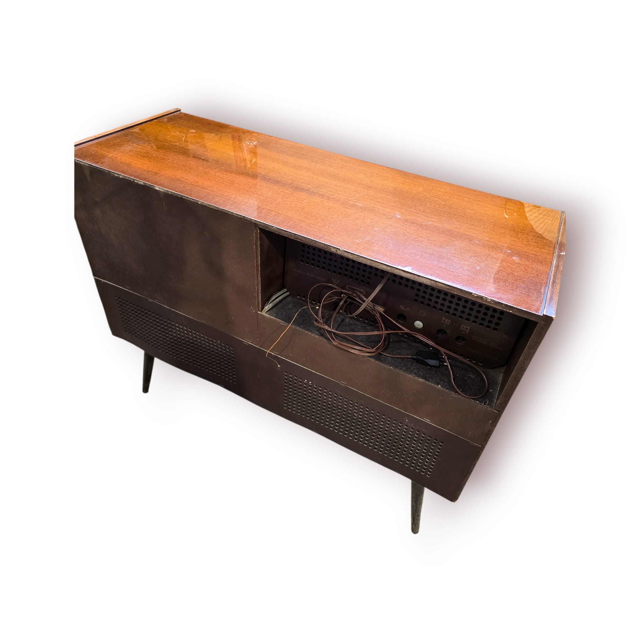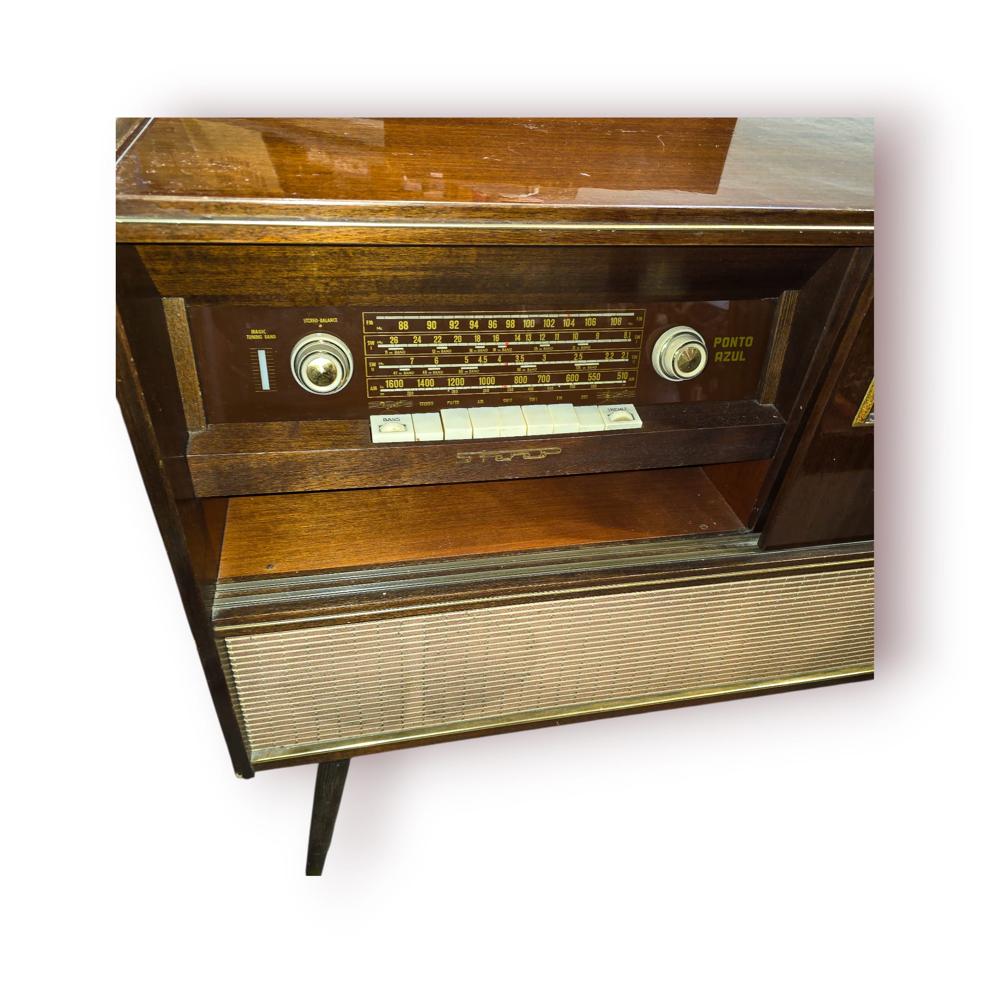 Uma peça decorativa marcante e funcional, ideal para salas vintage, bares ou colecionadores de equipamentos áudio clássicos.