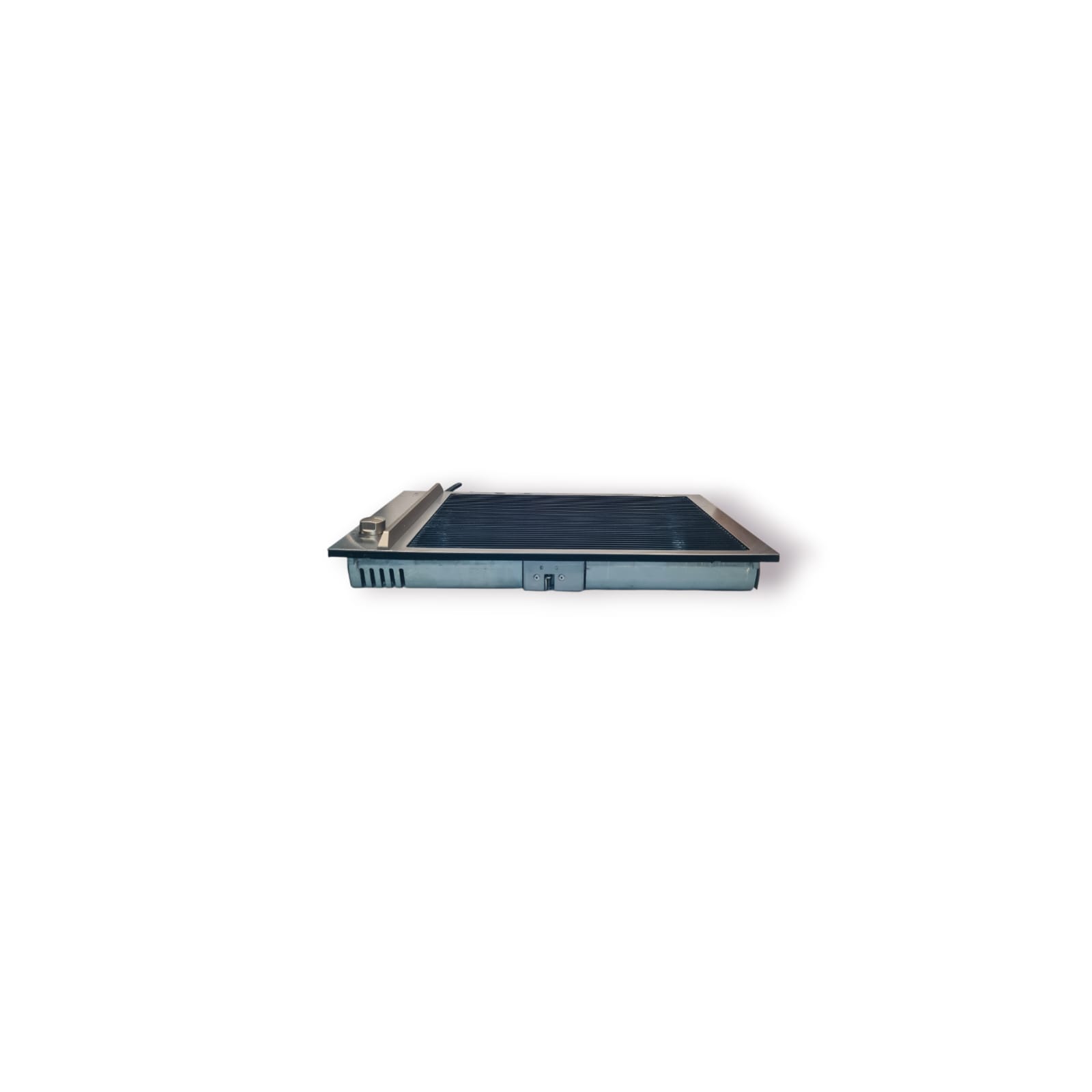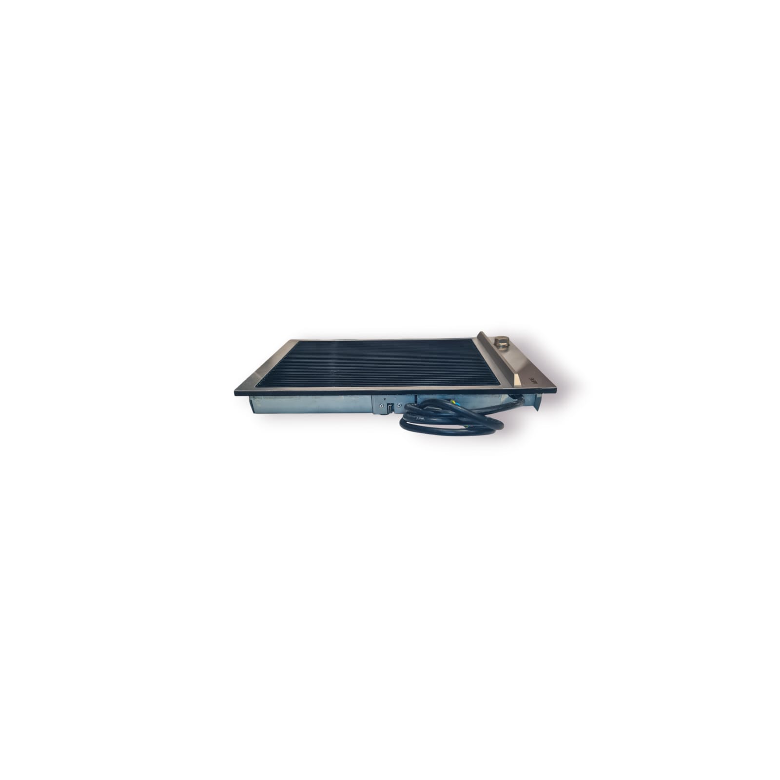 Grelhador elétrico de encastre da AEG, com acabamento em aço inoxidável escovado e grelha em vidro estriado resistente ao calor. Um equipamento robusto e elegante, ideal para integração em cozinhas modulares ou bancadas técnicas, permitindo grelhar carnes, peixes e legumes de forma prática e controlada.