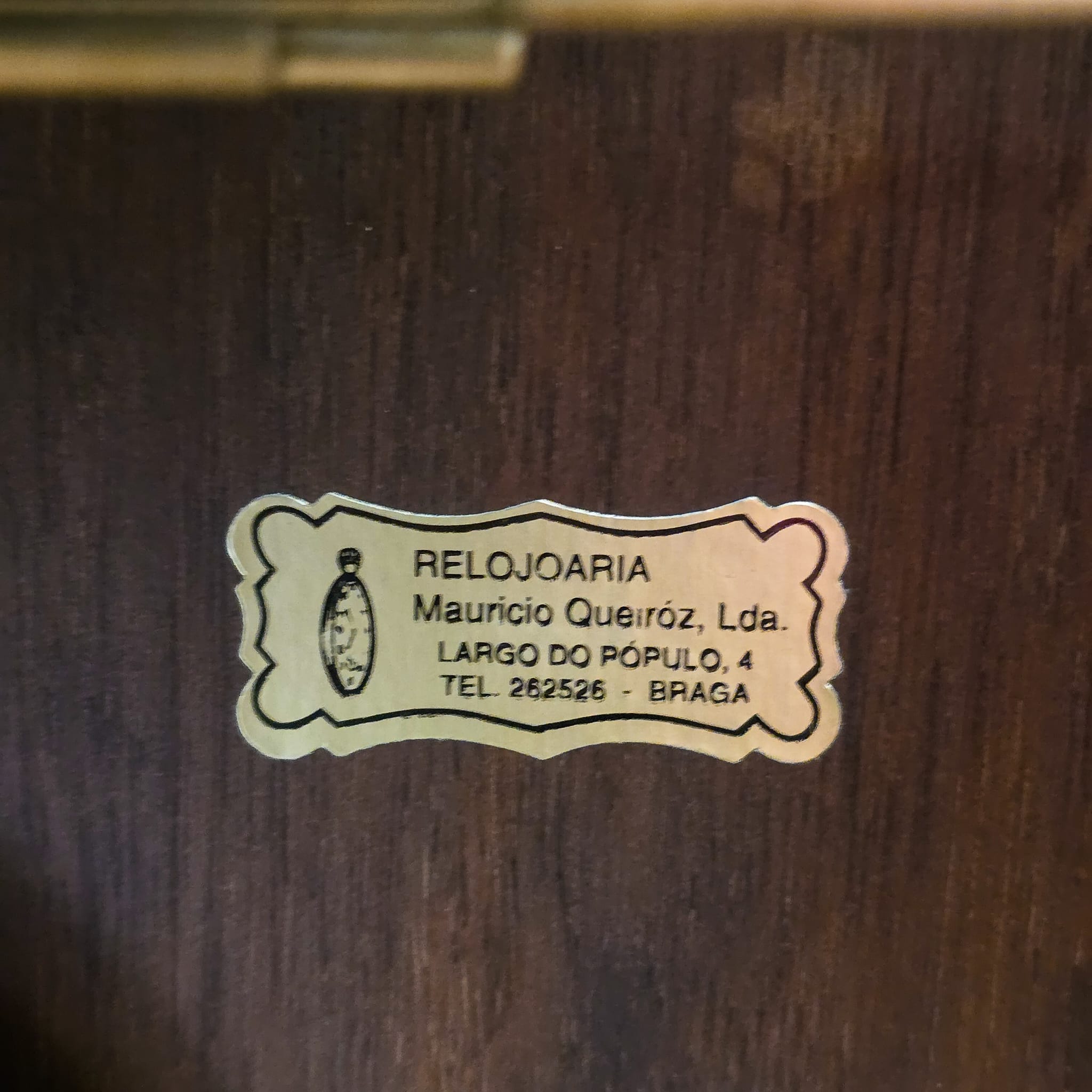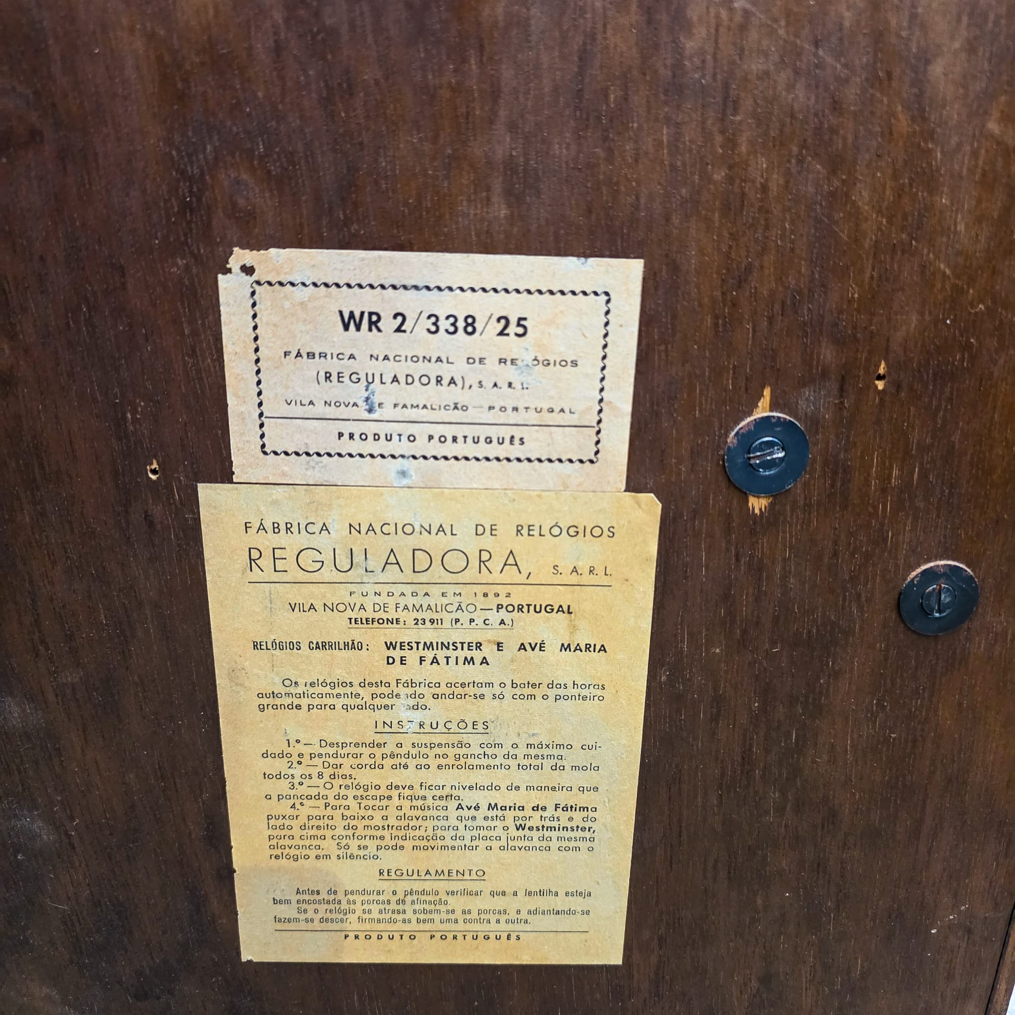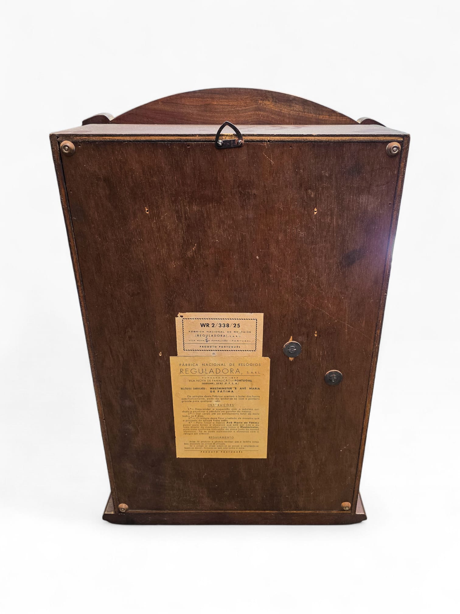 Elegante relógio de parede vintage da prestigiada marca portuguesa Reguladora, produzido em Vila Nova de Famalicão. Uma peça clássica de relojoaria tradicional, com caixa em madeira maciça e mecanismo mecânico de corda, equipada com carrilhão musical.