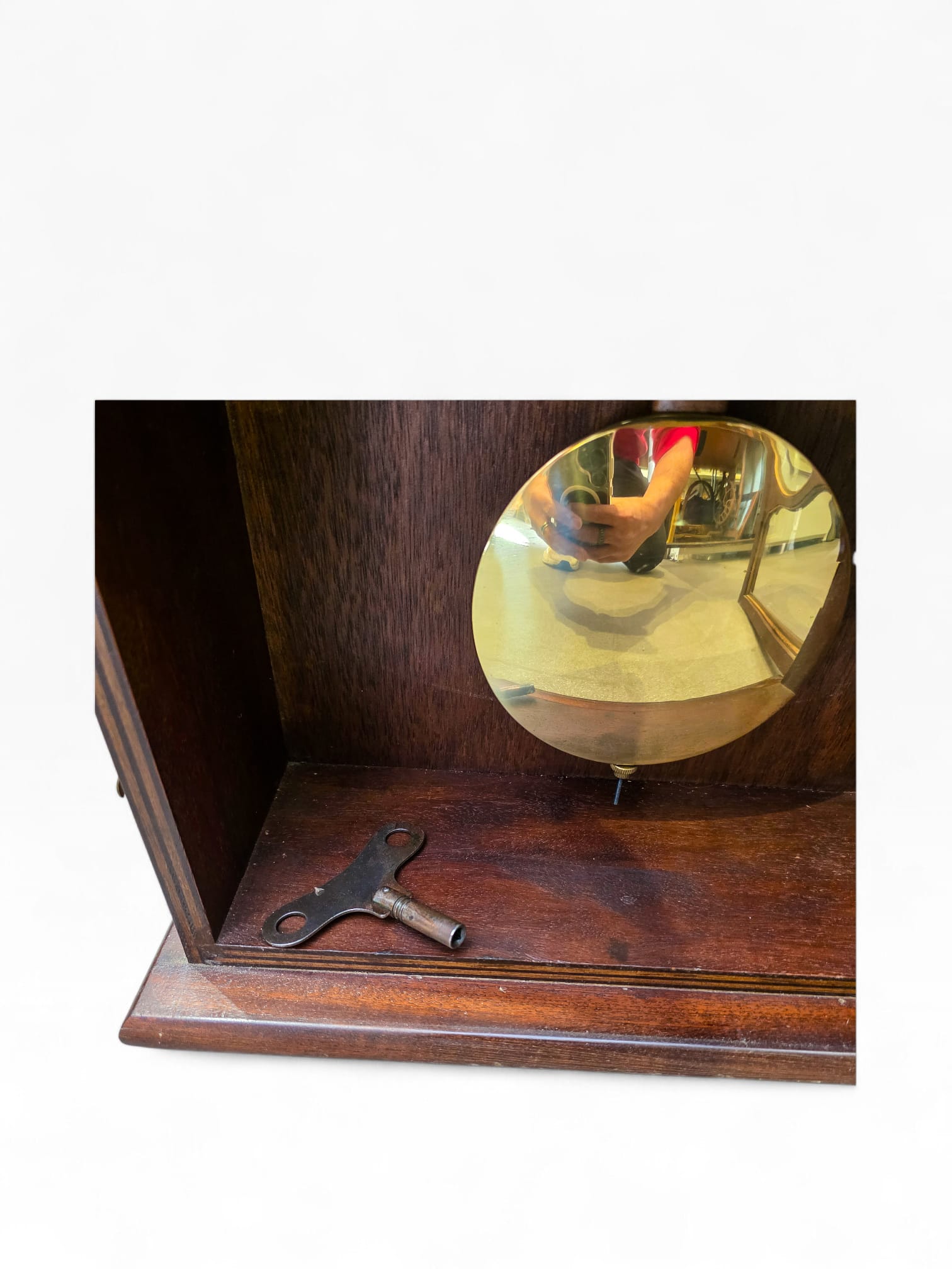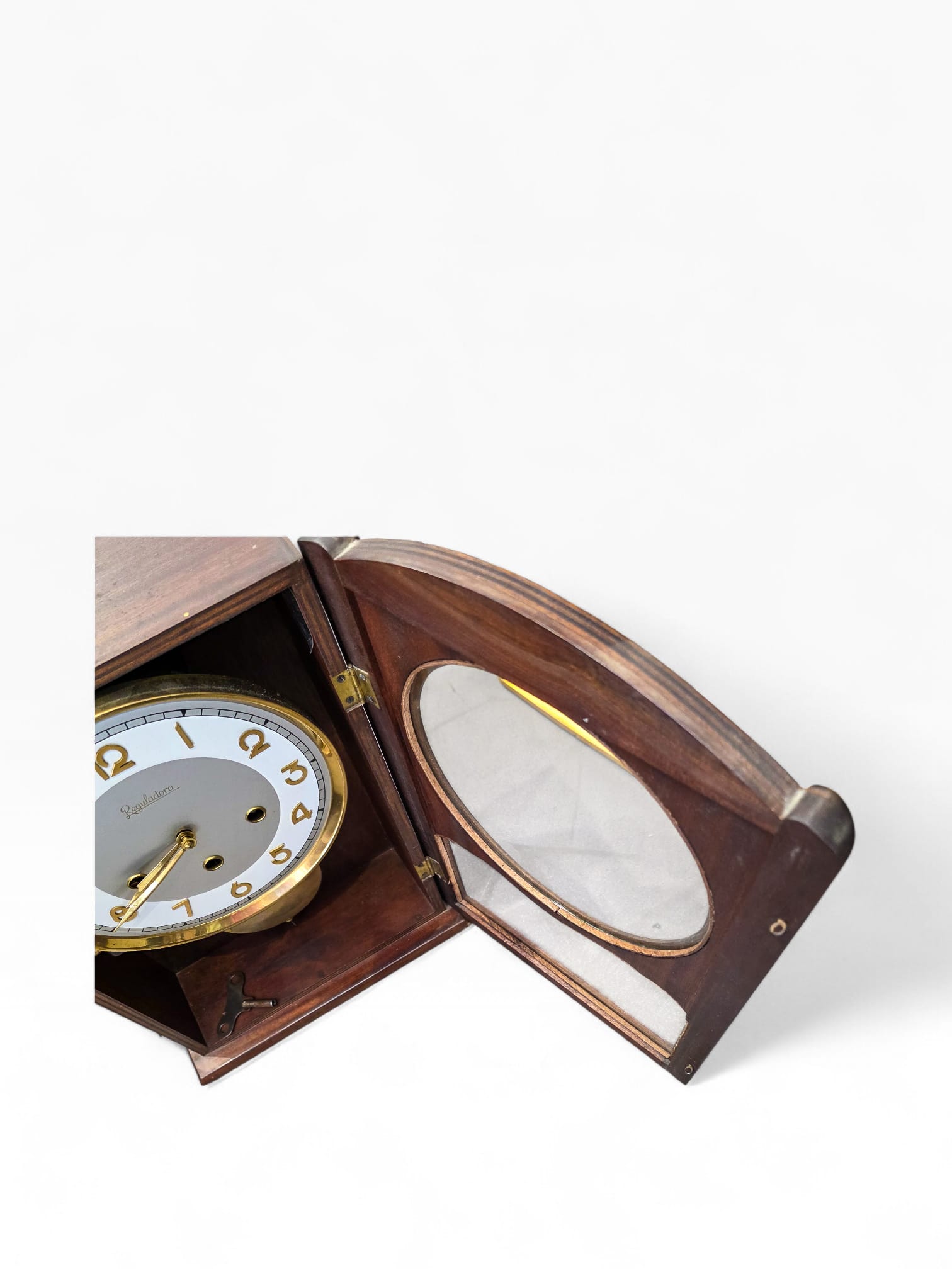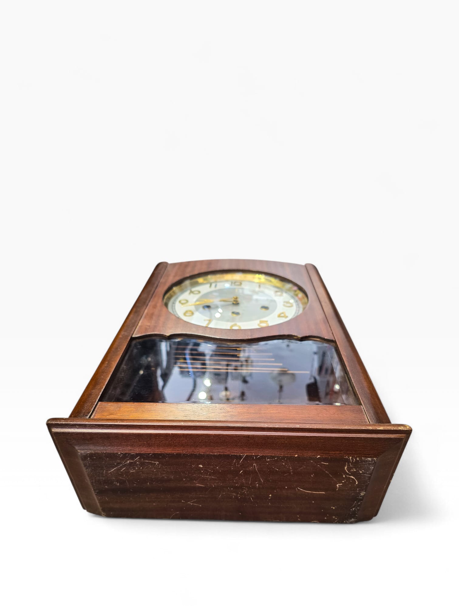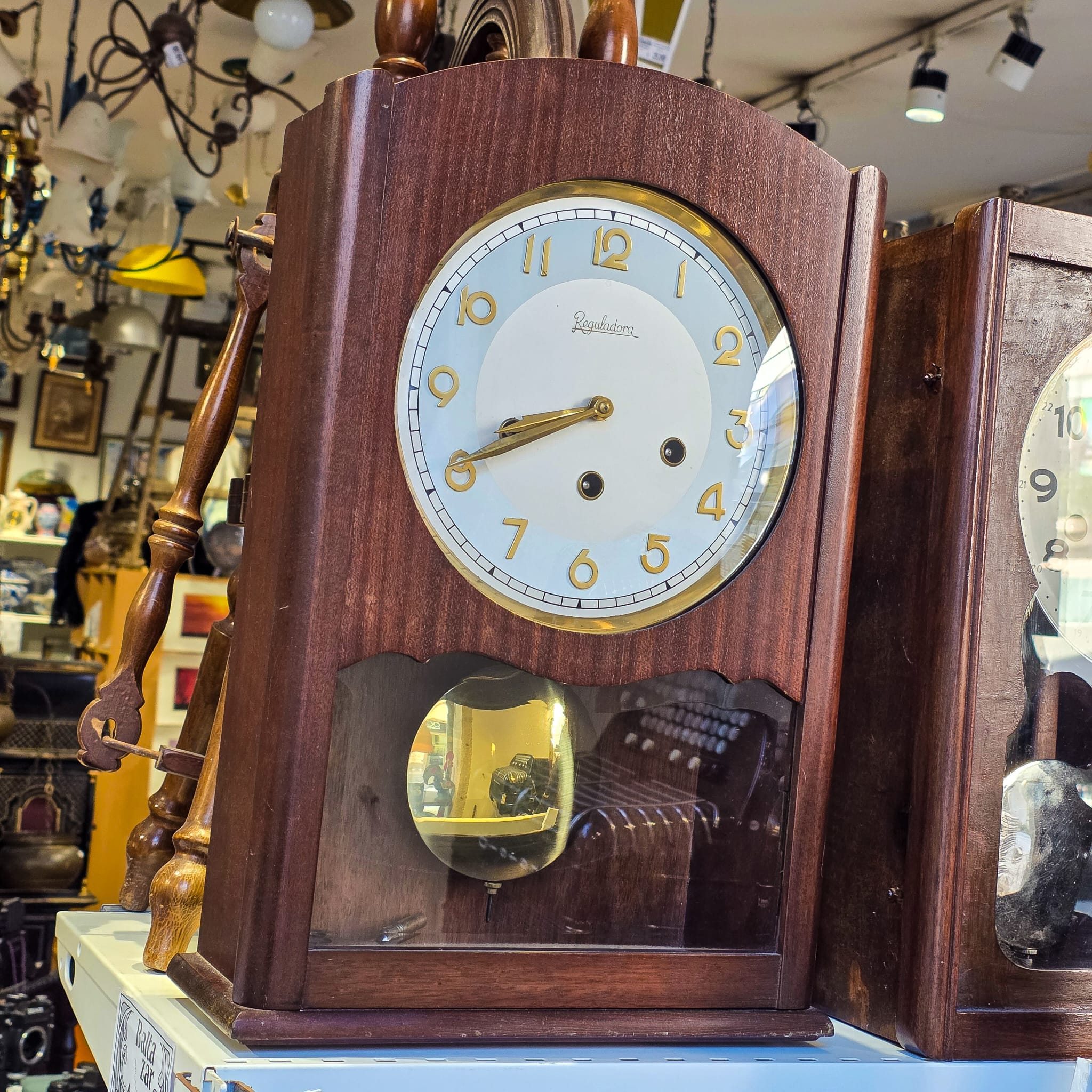 Elegante relógio de parede vintage da prestigiada marca portuguesa Reguladora, produzido em Vila Nova de Famalicão. Uma peça clássica de relojoaria tradicional, com caixa em madeira maciça e mecanismo mecânico de corda, equipada com carrilhão musical.