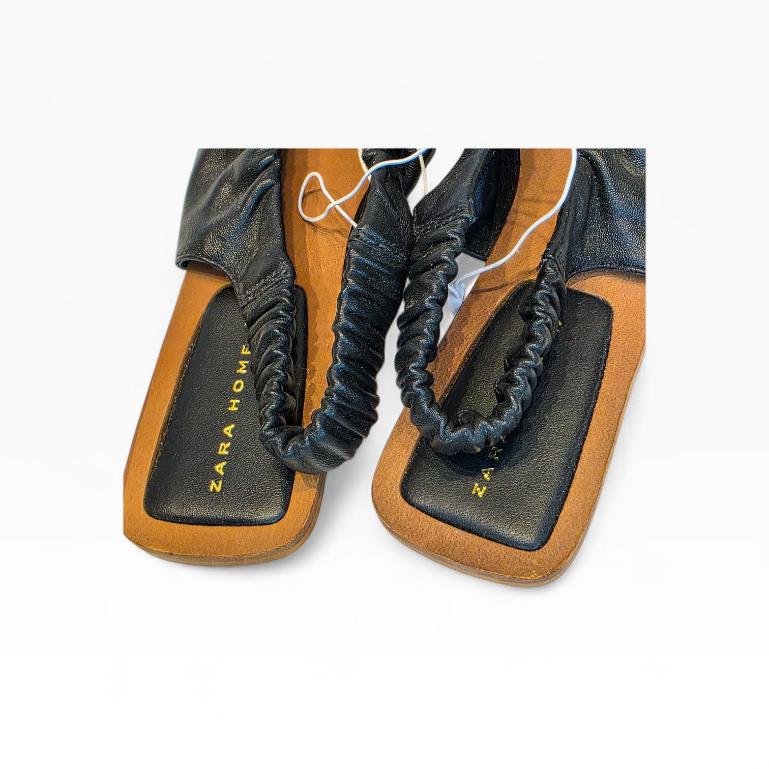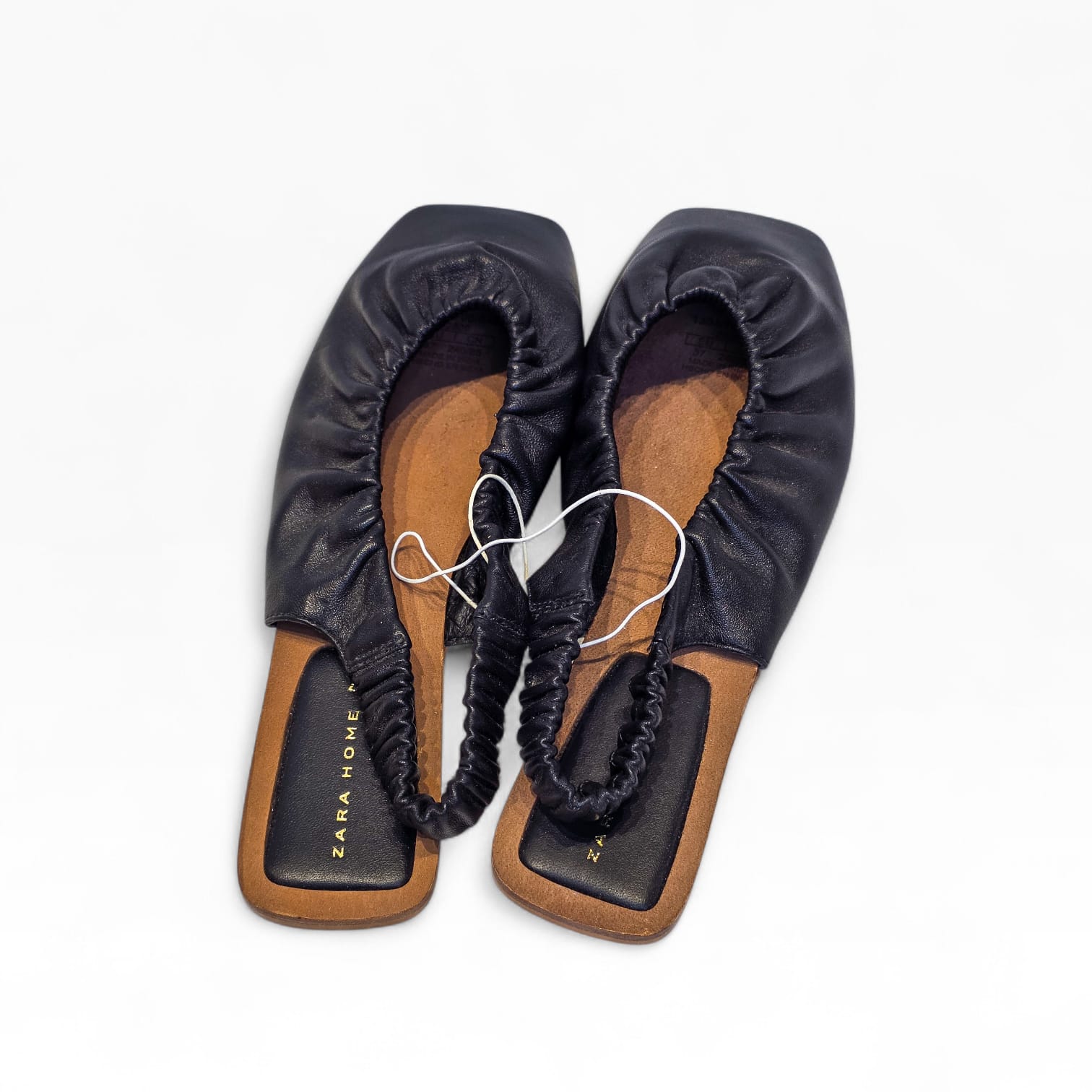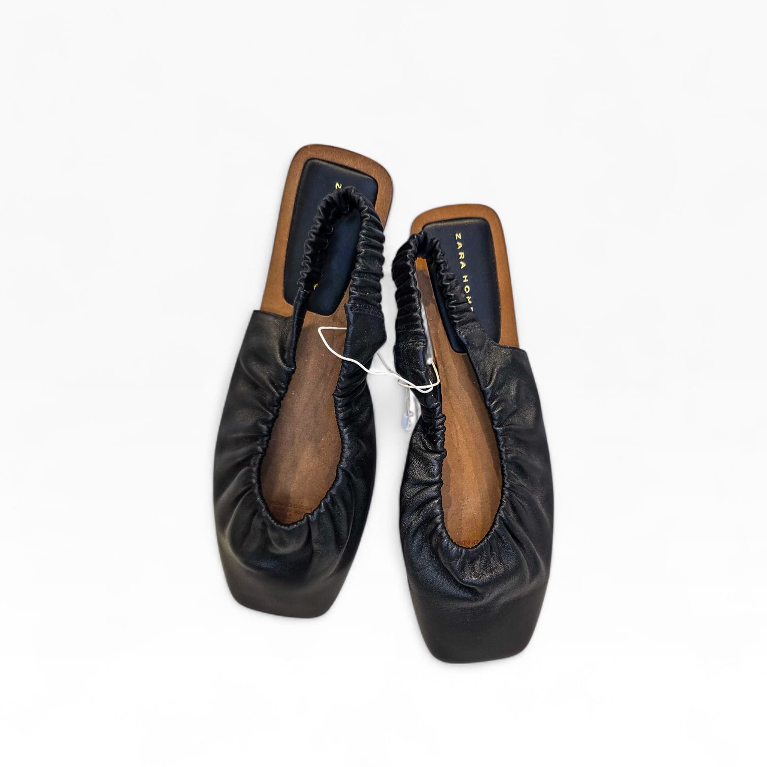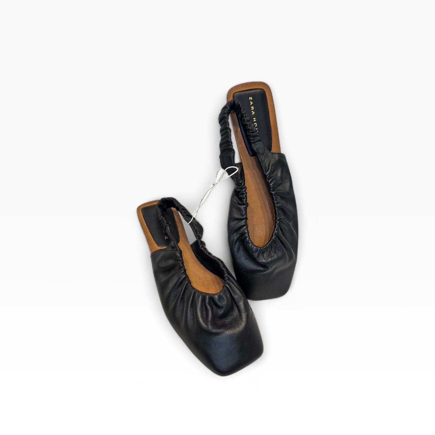 Elegância minimalista e conforto num só modelo. Estas sabatas slingback da Zara Home destacam-se pelo design moderno com acabamento franzido em pele preta e sola estruturada em tom natural.