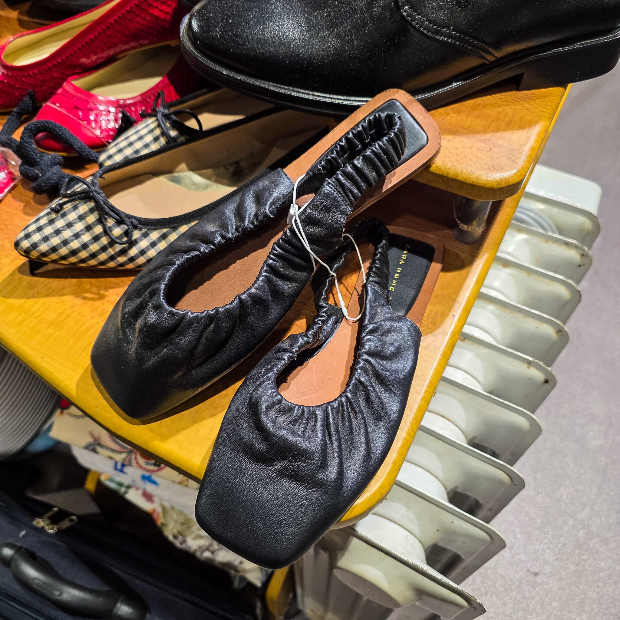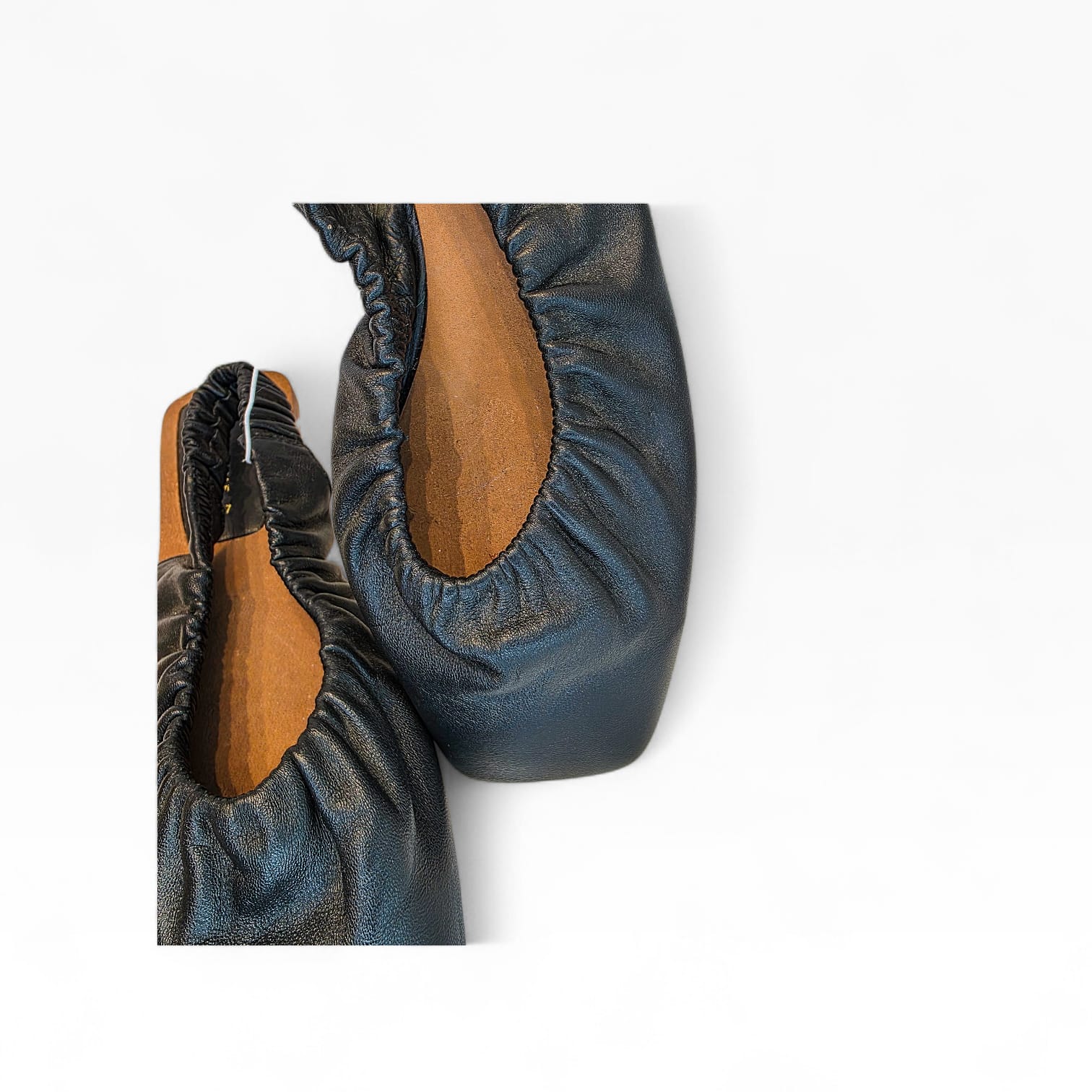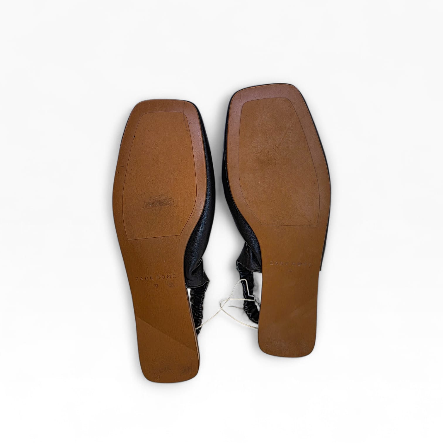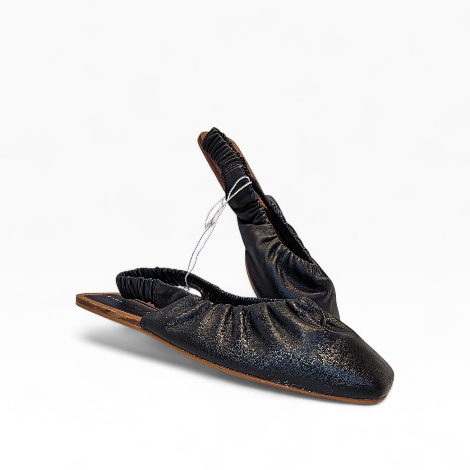 Elegância minimalista e conforto num só modelo. Estas sabatas slingback da Zara Home destacam-se pelo design moderno com acabamento franzido em pele preta e sola estruturada em tom natural.
