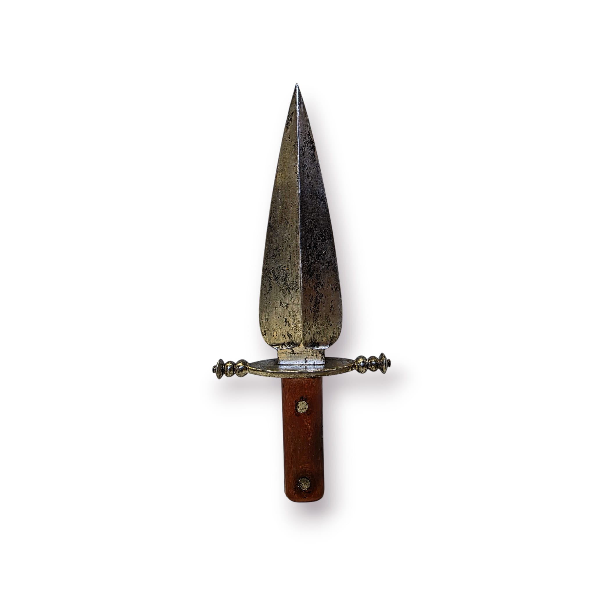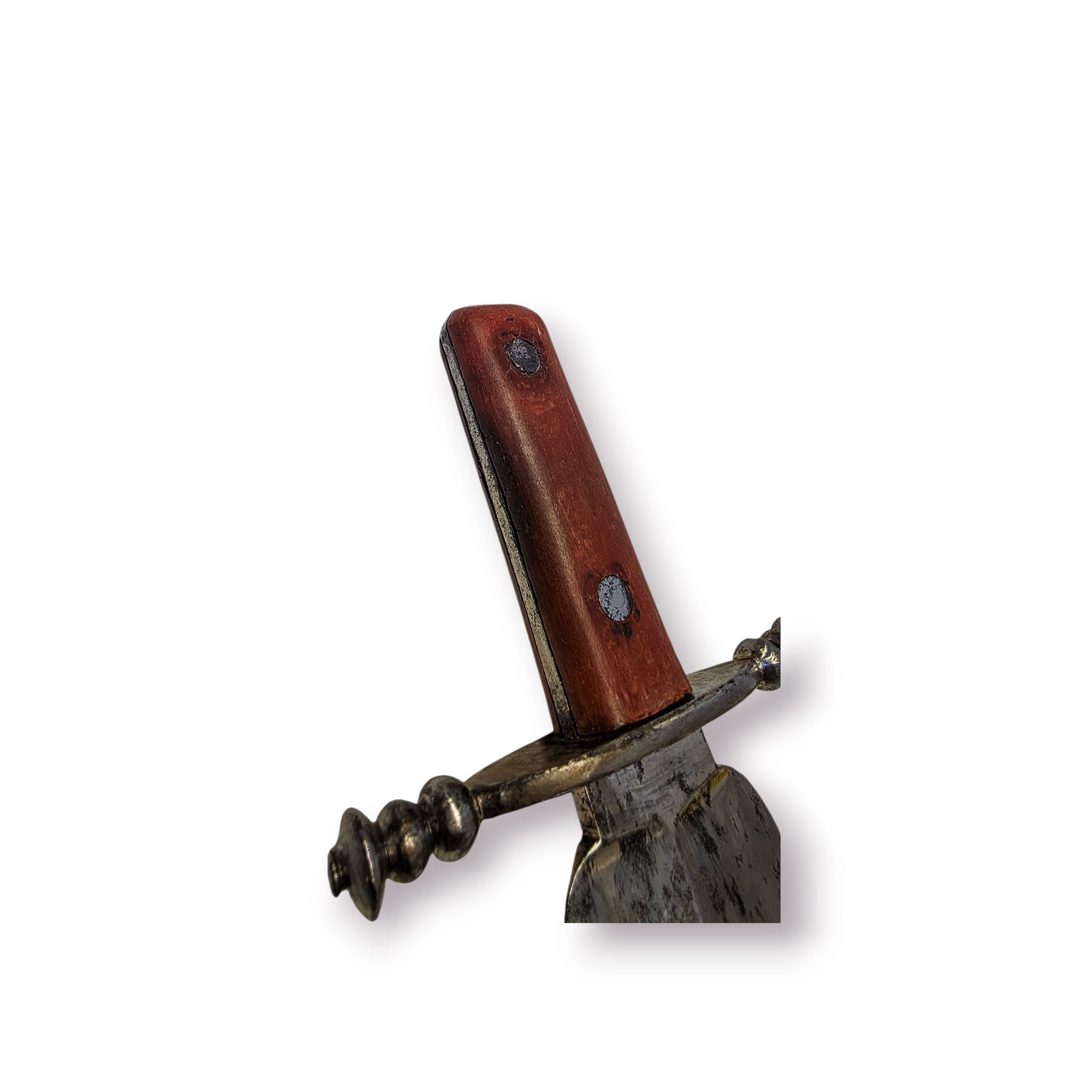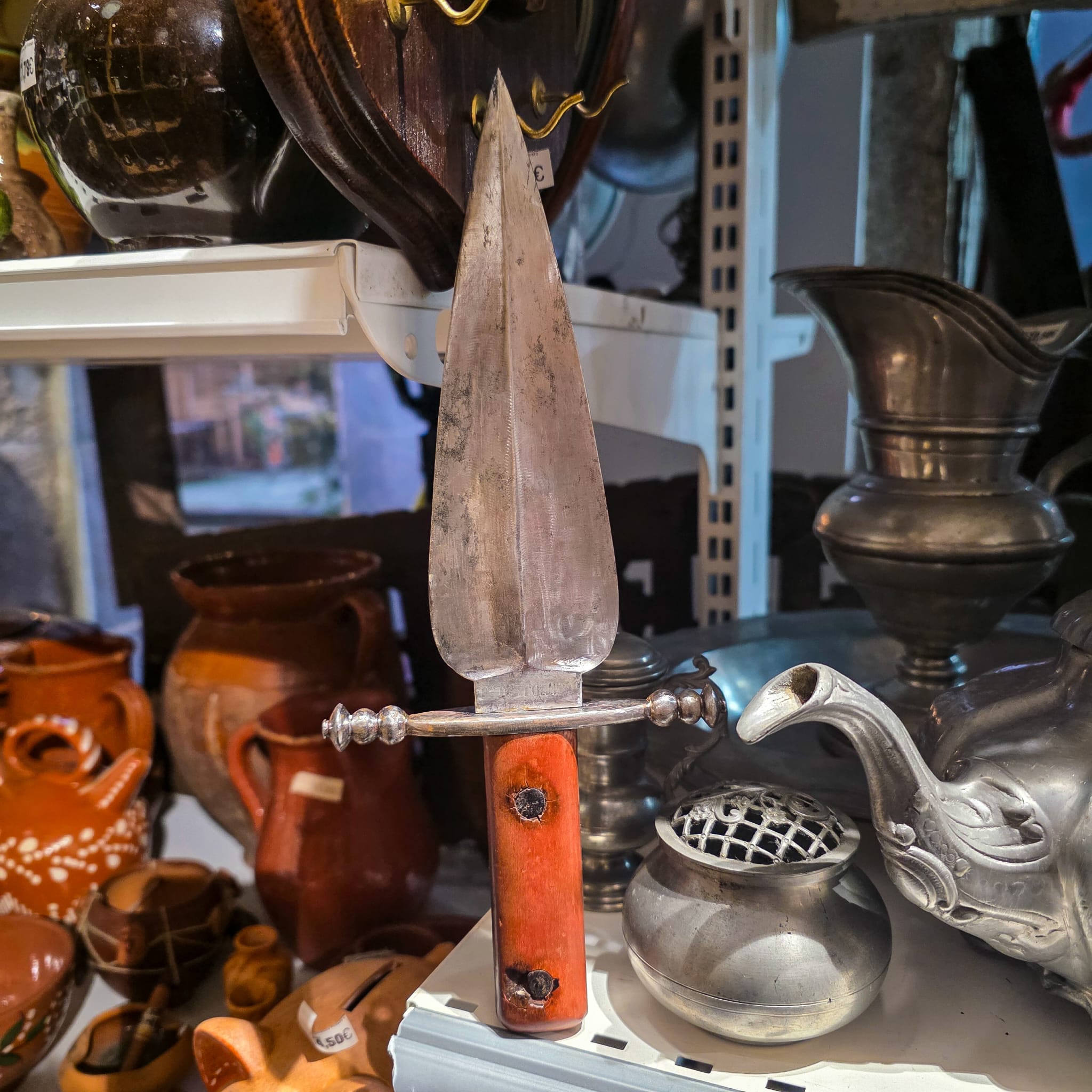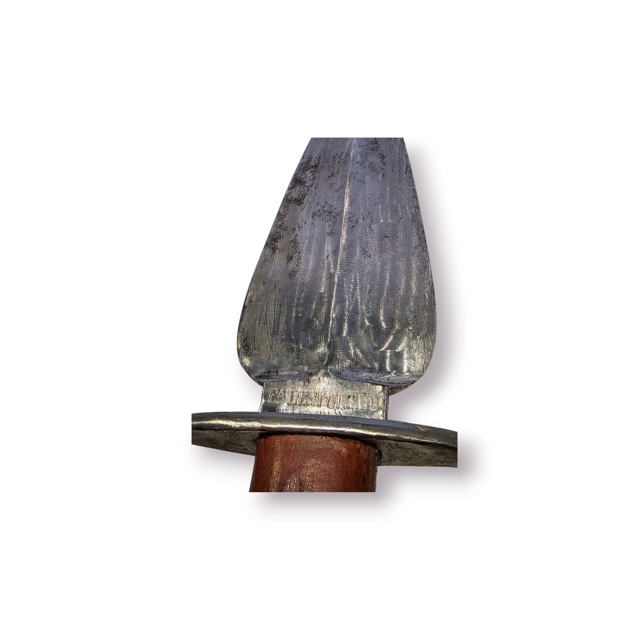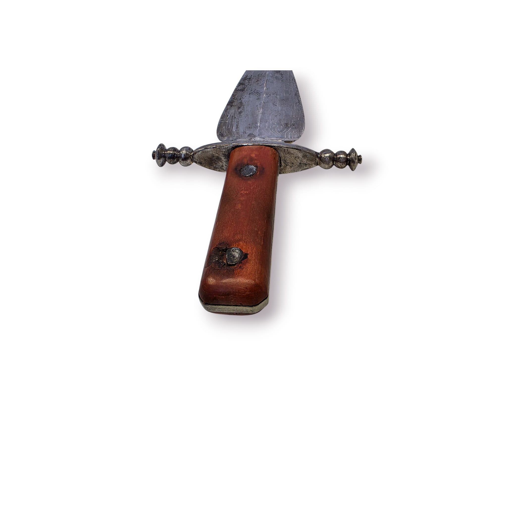 Com lâmina de perfil largo em forma de folha, guarda simples metálica e cabo em madeira fixado com rebites, apresenta pátina natural do tempo e sinais de uso compatíveis com a idade.