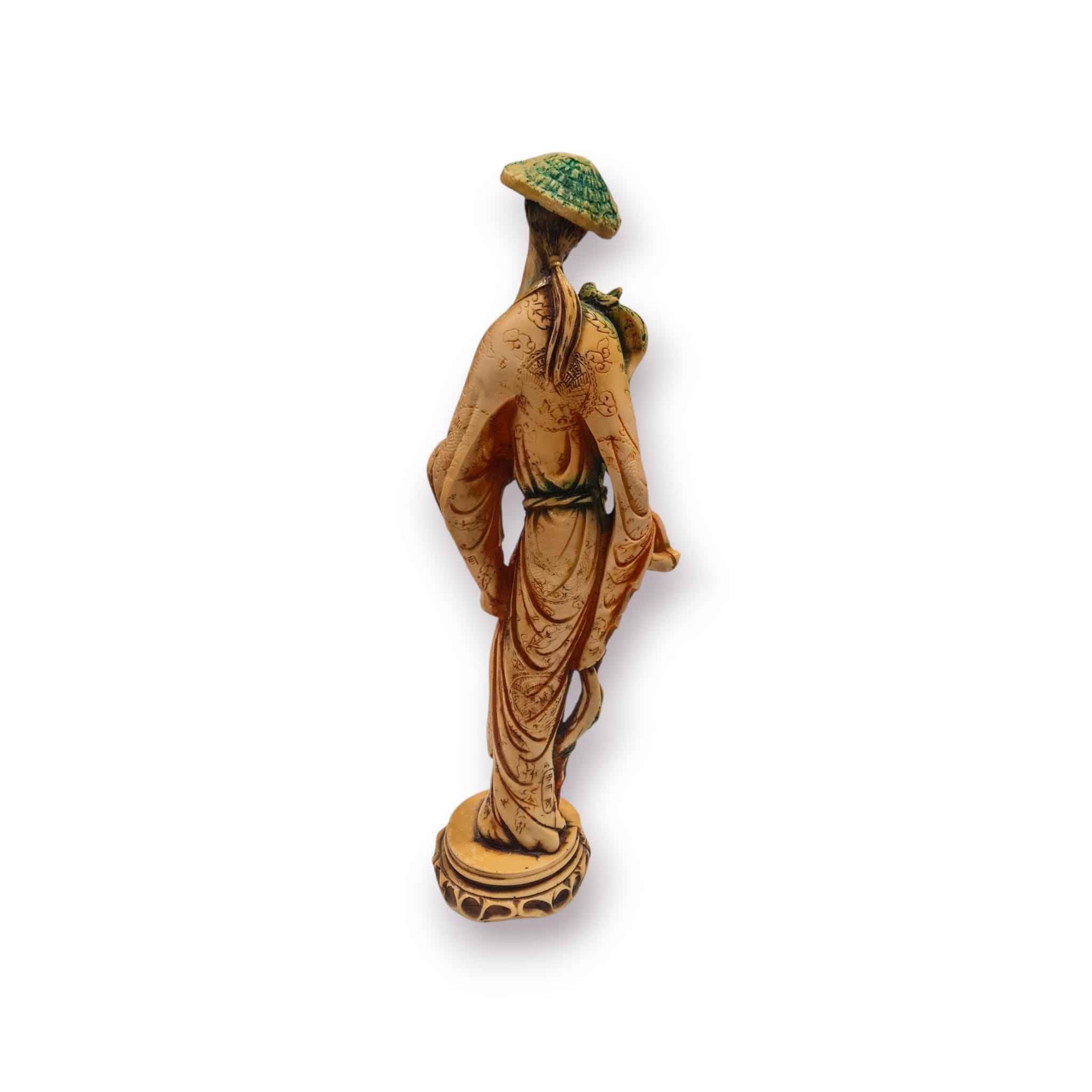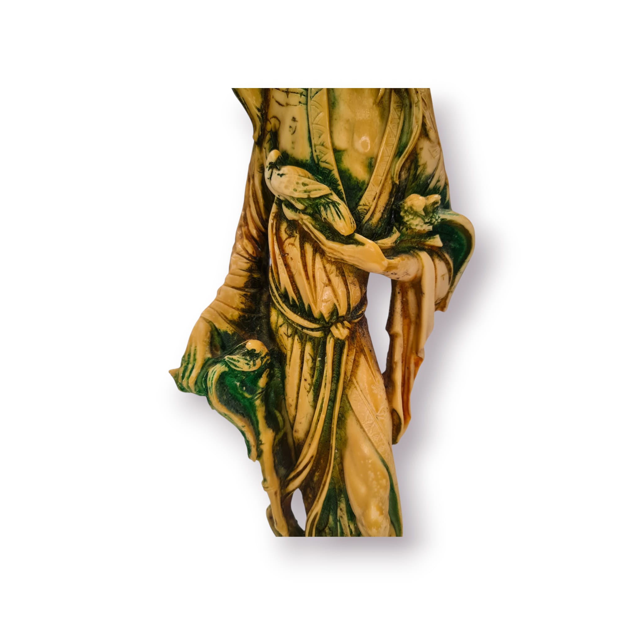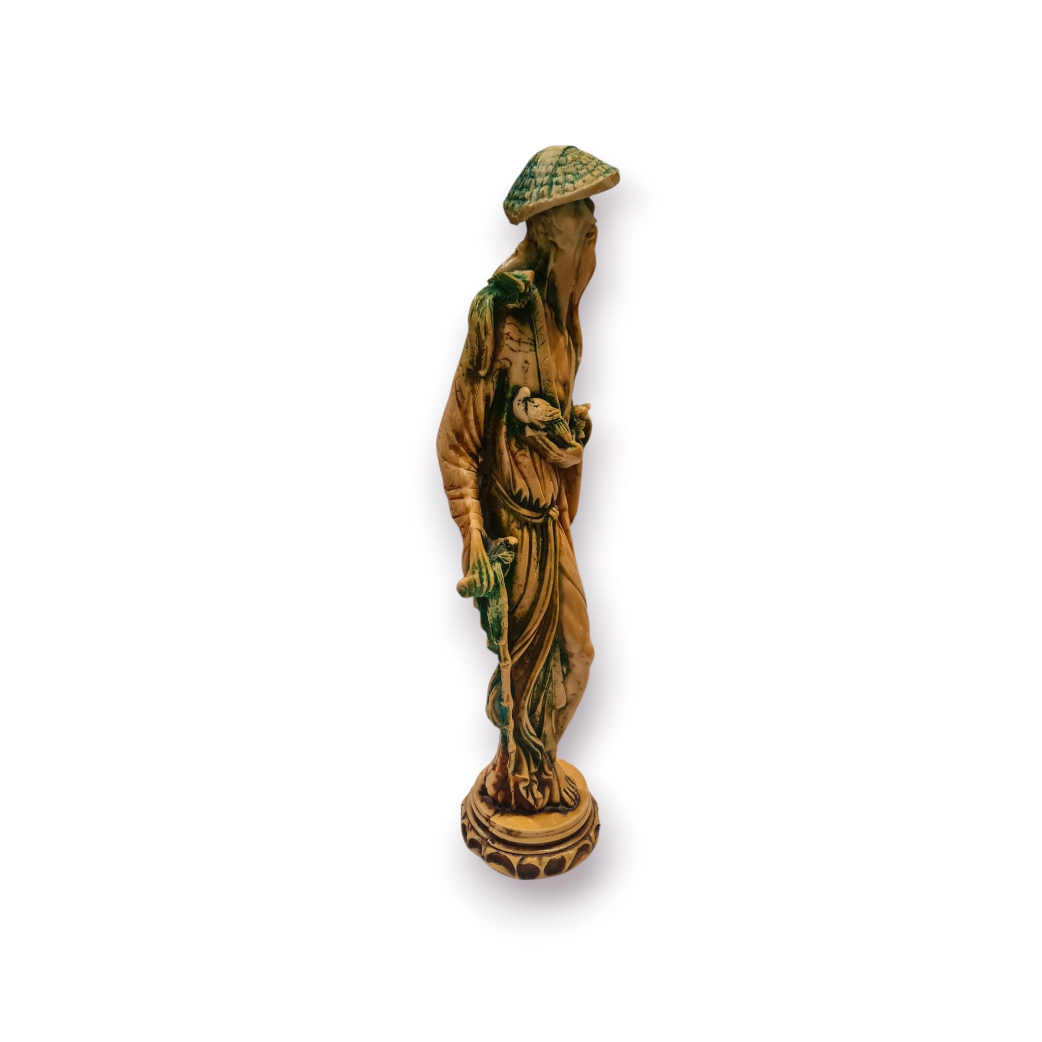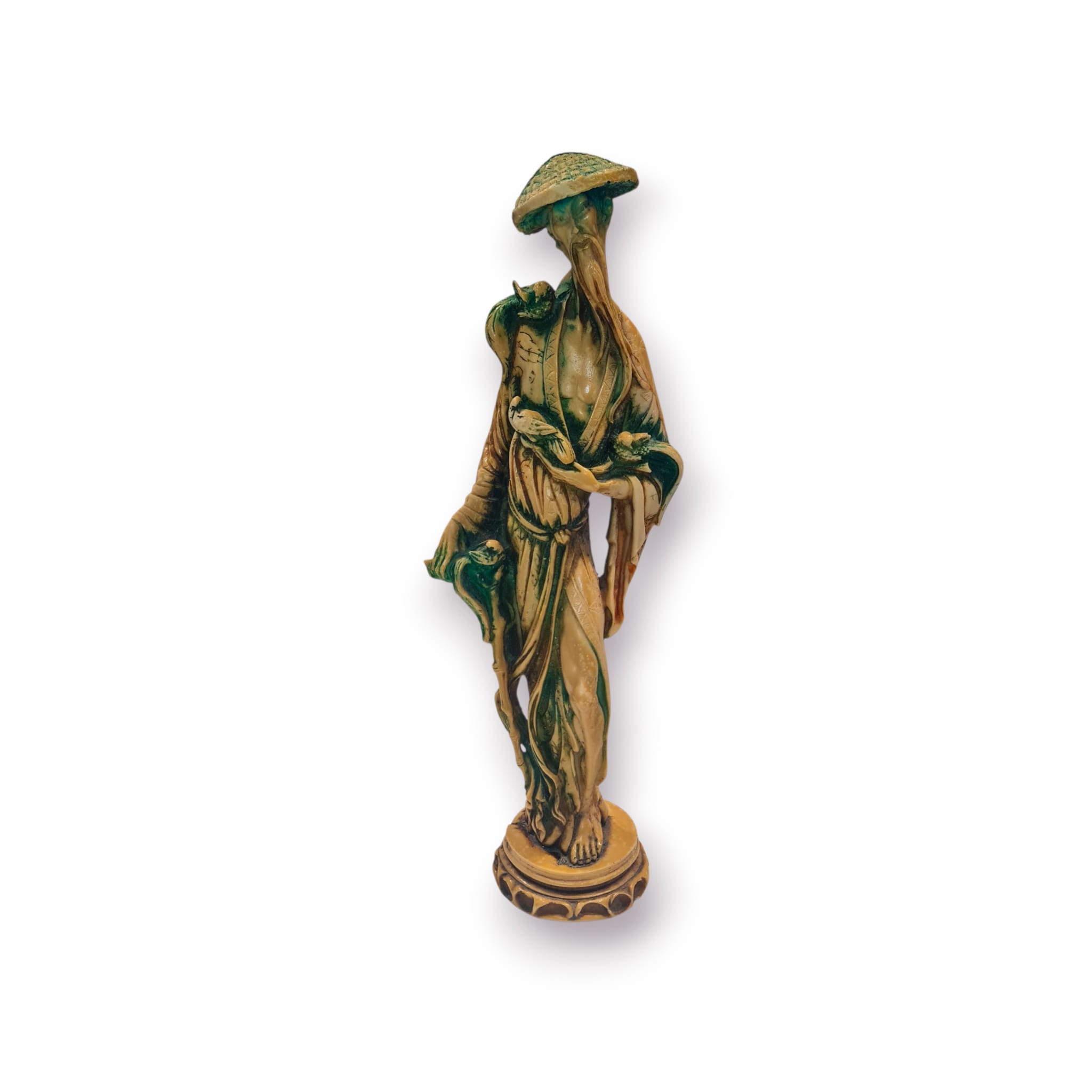Estátua decorativa em estilo oriental, representando um sábio ou viajante tradicional com chapéu cónico e aves pousadas nos ombros e braços. A peça apresenta um acabamento envelhecido em tons de marfim e verde, com detalhes gravados ao longo da túnica.