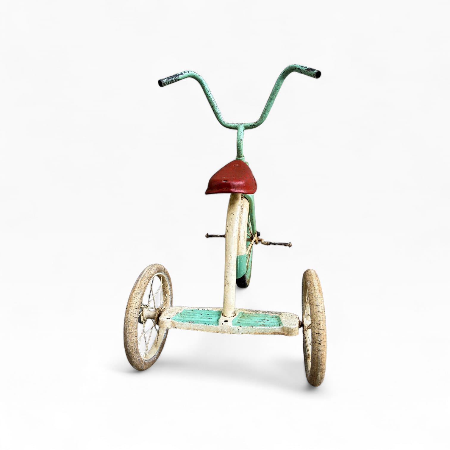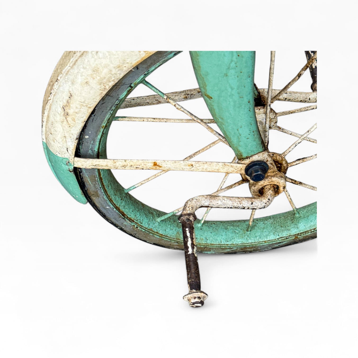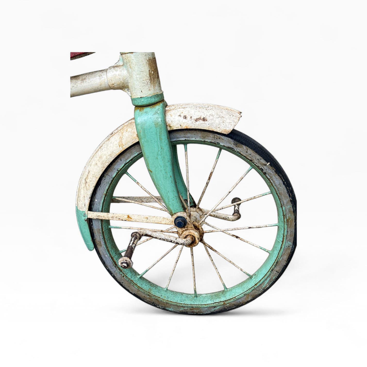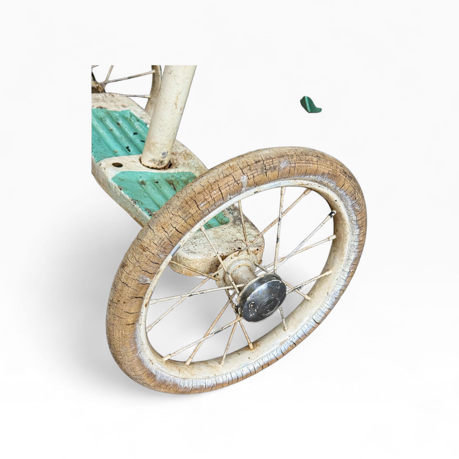 Peça vintage original e cheia de personalidade, este triciclo infantil duplo destaca-se pelo seu design clássico e pela combinação de cores em estilo “Tiffany”, muito procurada atualmente na decoração.