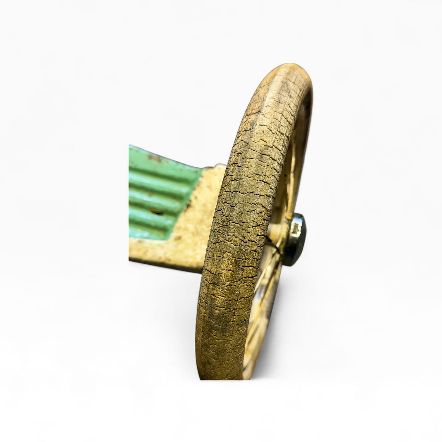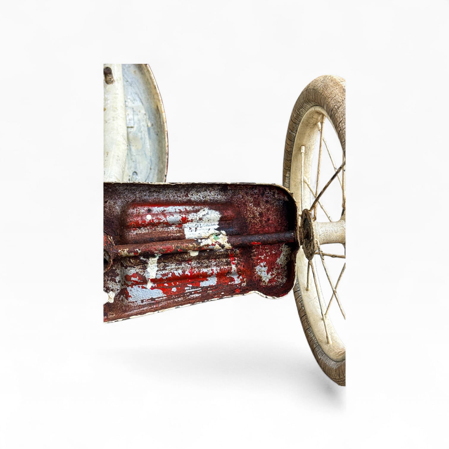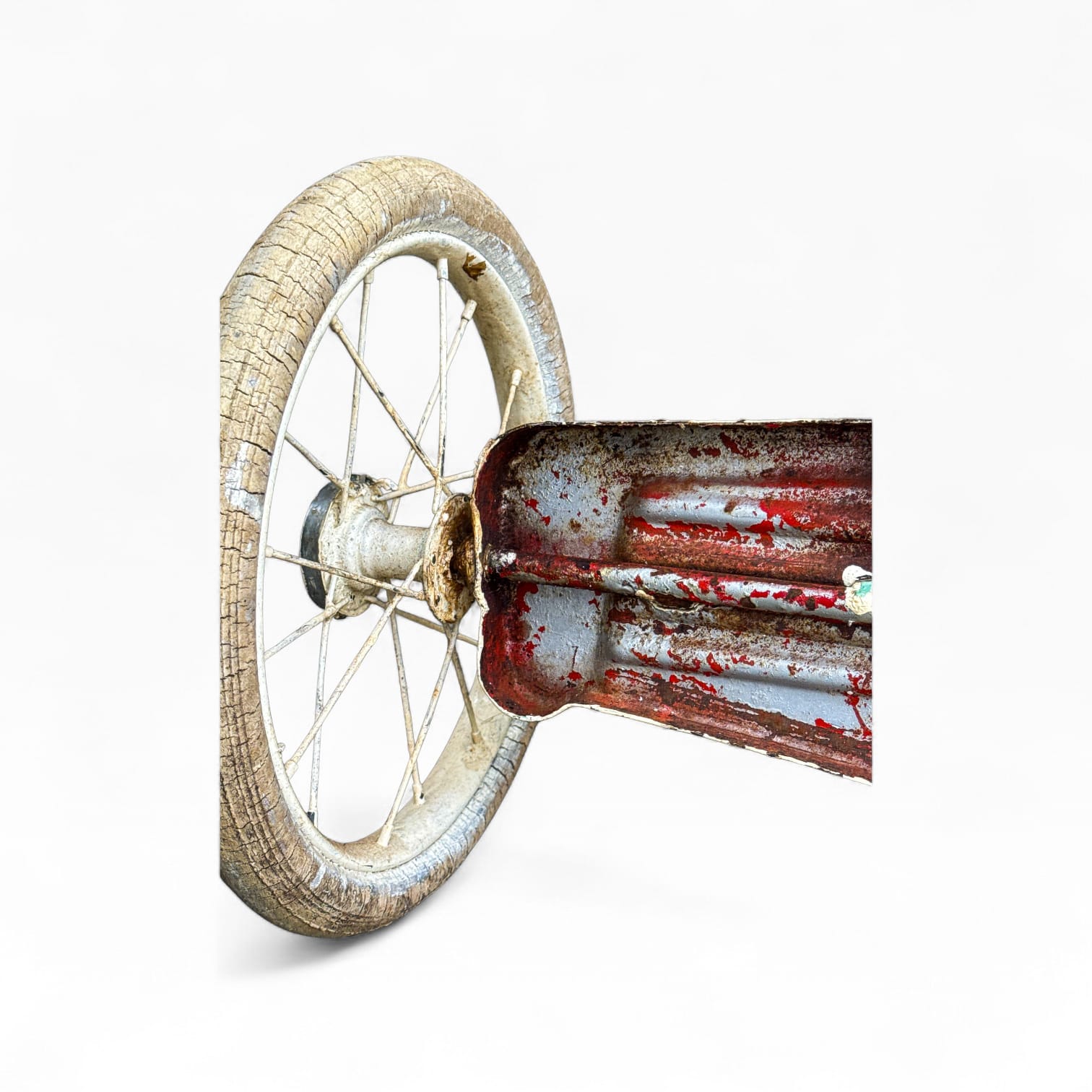 Com estrutura robusta em metal e configuração de duas rodas traseiras, este modelo permitia o uso por duas crianças, sendo hoje uma peça rara e altamente decorativa.