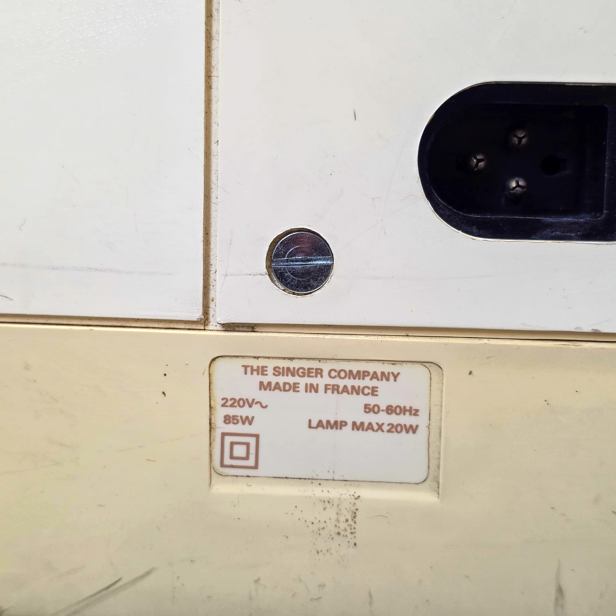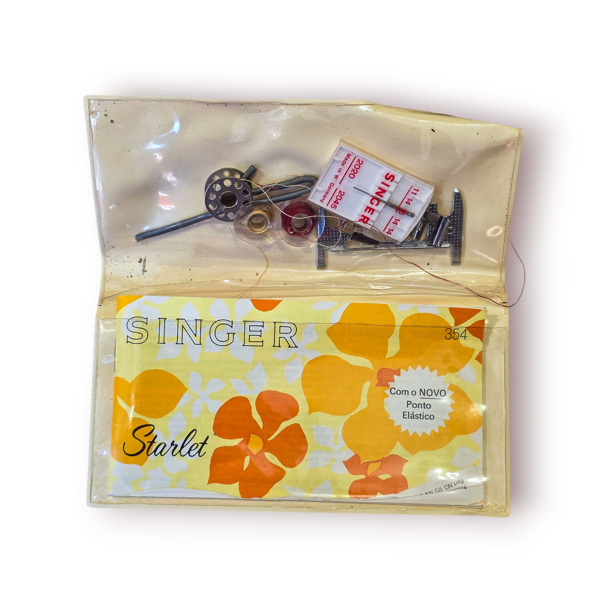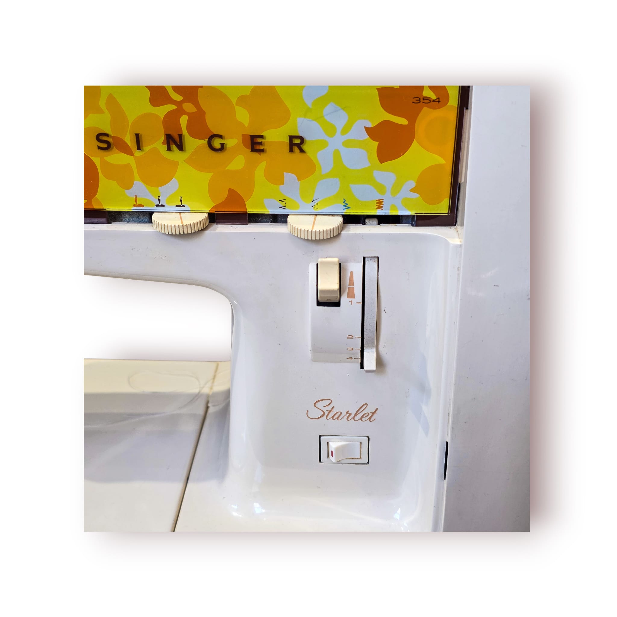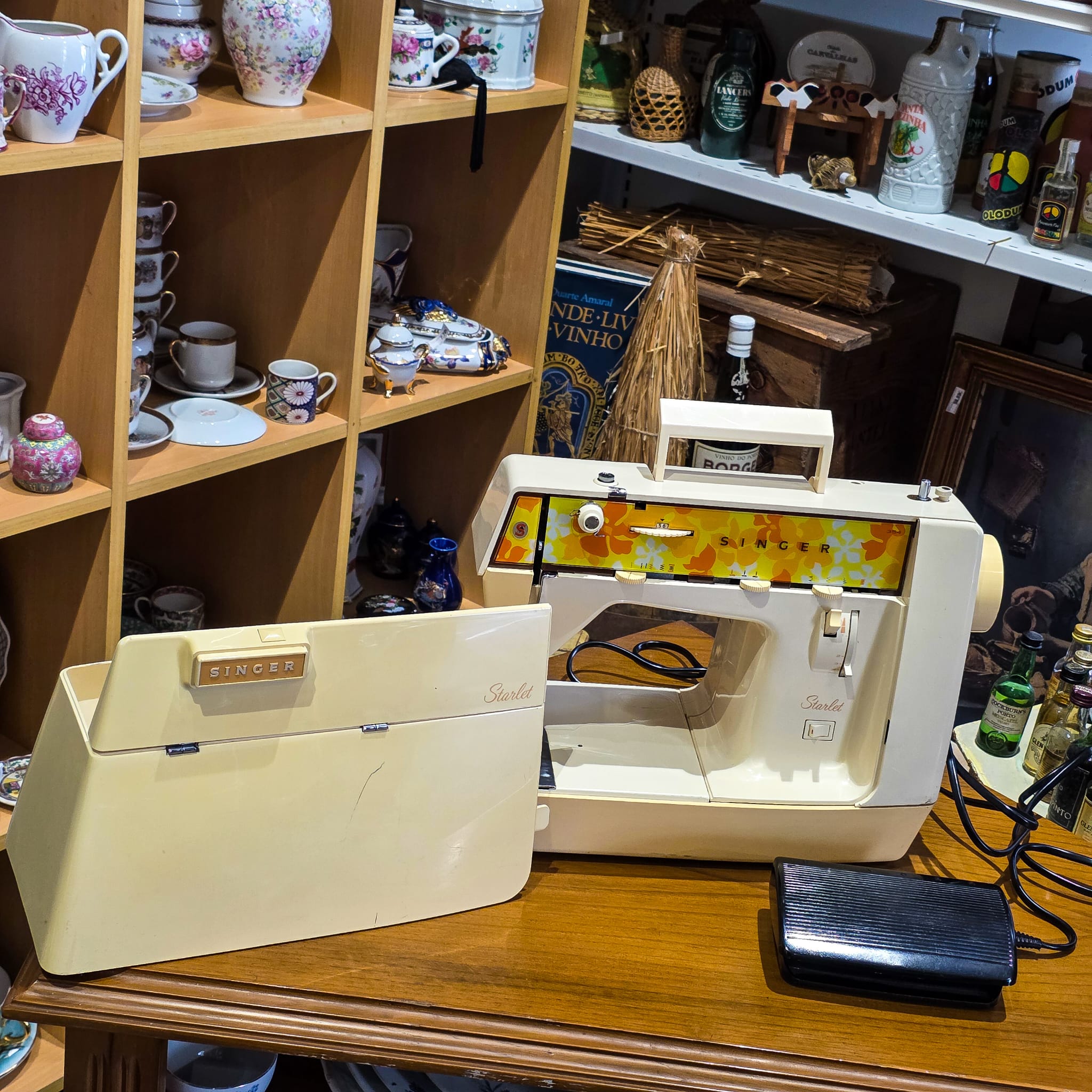 Máquina de costura Singer Starlet 354, um modelo clássico da década de 1970 com design floral característico da época. Produzida em França pela Singer, esta máquina combina robustez mecânica com simplicidade de utilização, sendo ideal tanto para iniciantes como para quem aprecia máquinas vintage de qualidade.