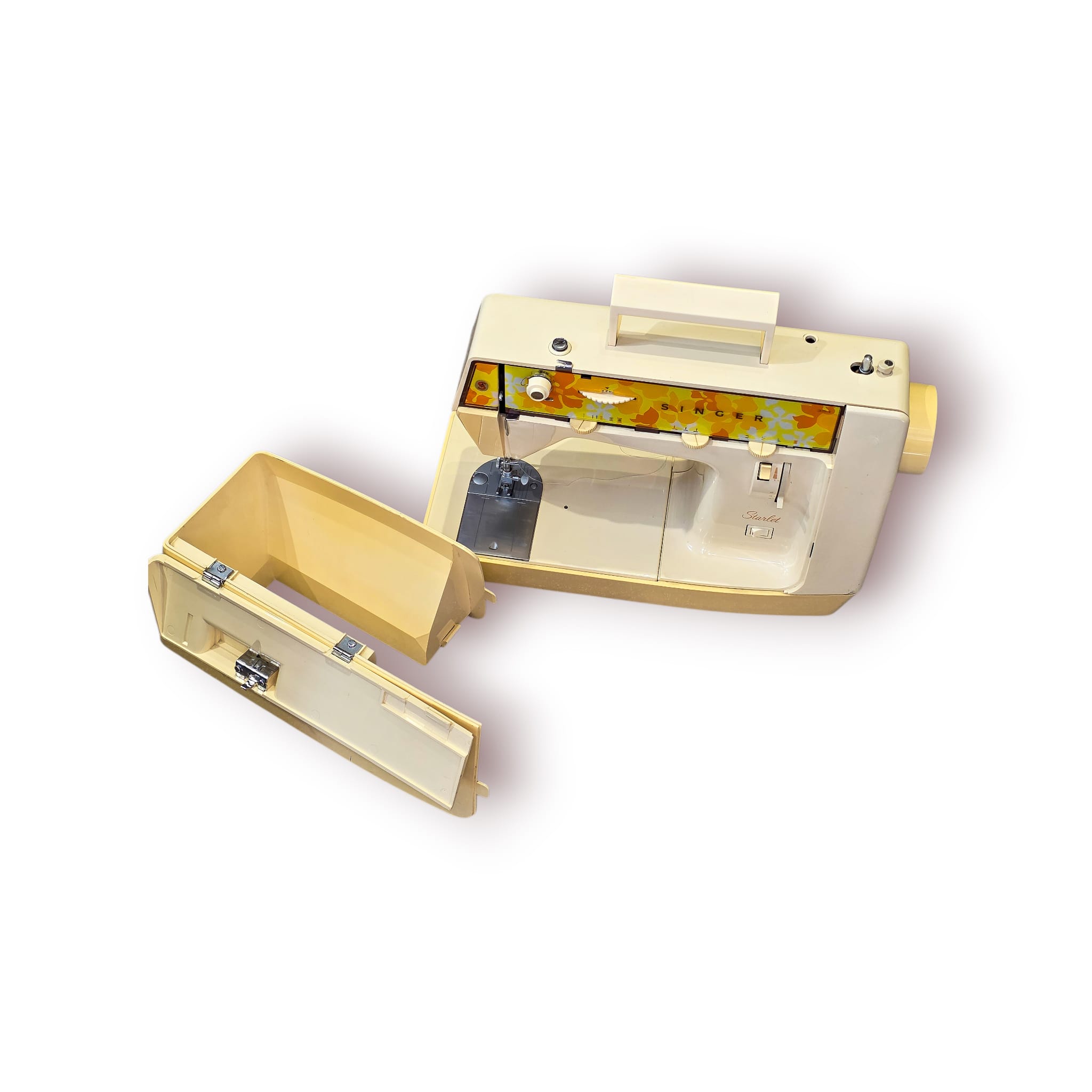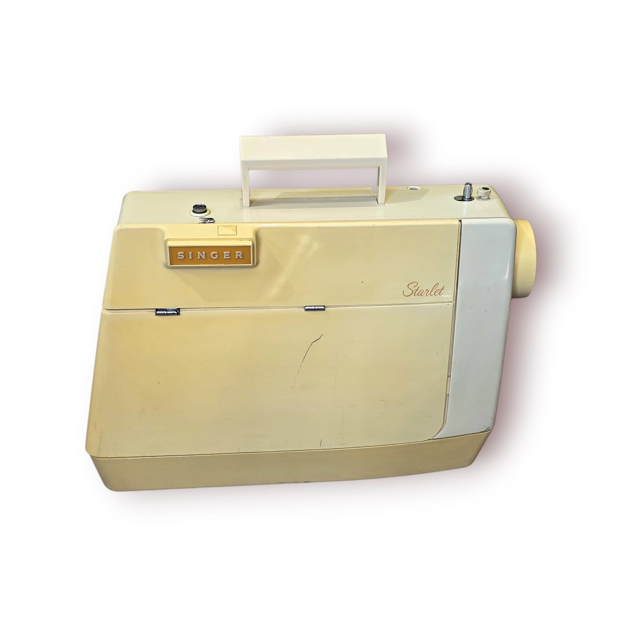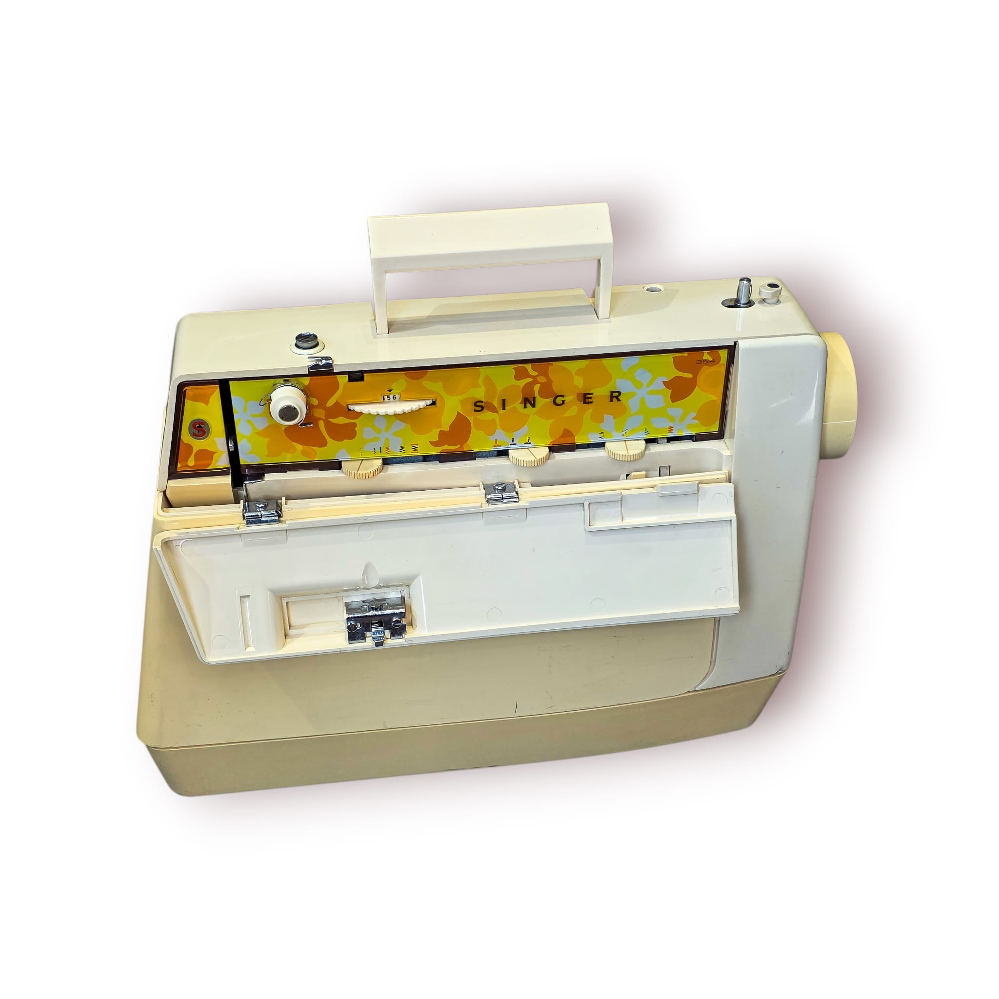 Máquina de costura Singer Starlet 354, um modelo clássico da década de 1970 com design floral característico da época. Produzida em França pela Singer, esta máquina combina robustez mecânica com simplicidade de utilização, sendo ideal tanto para iniciantes como para quem aprecia máquinas vintage de qualidade.