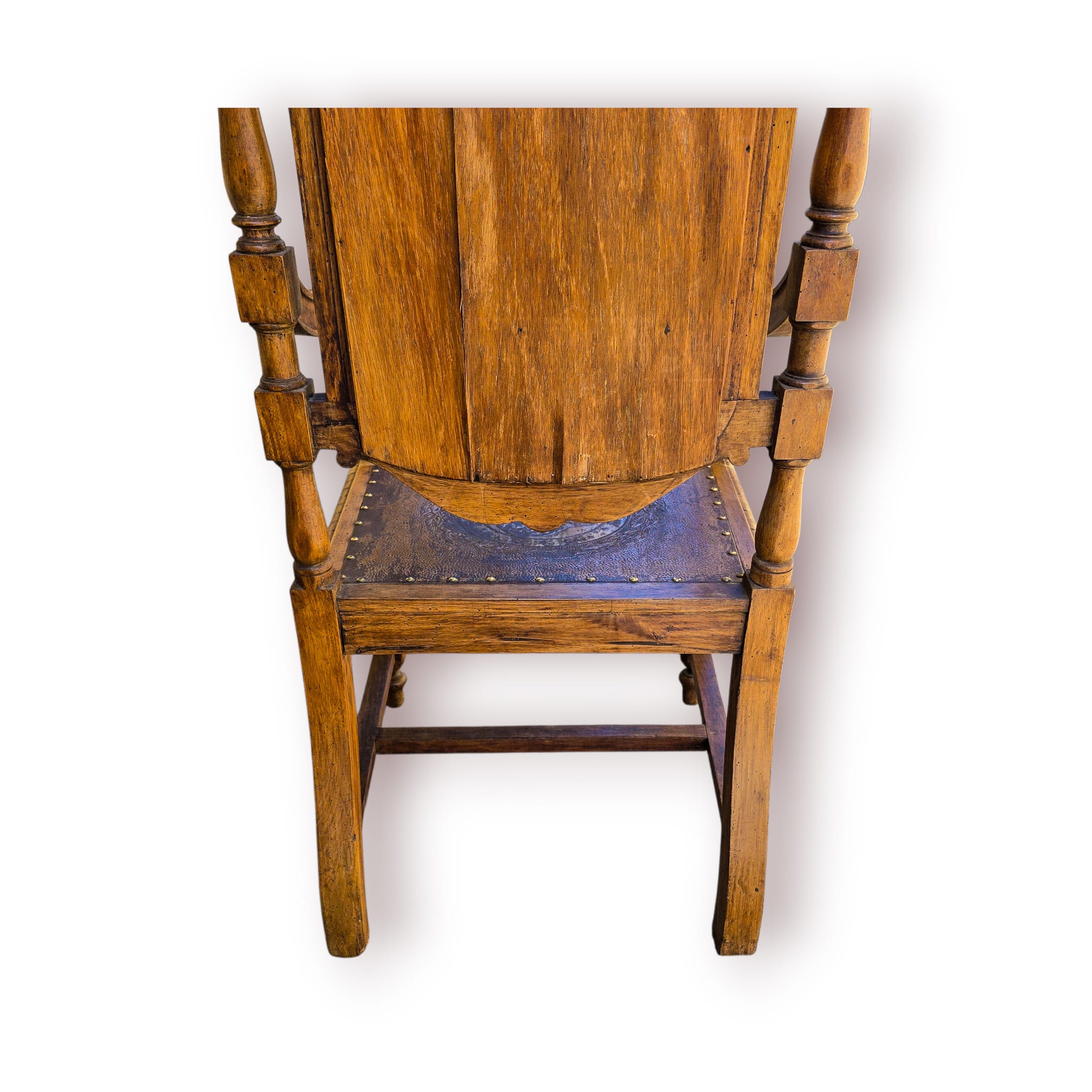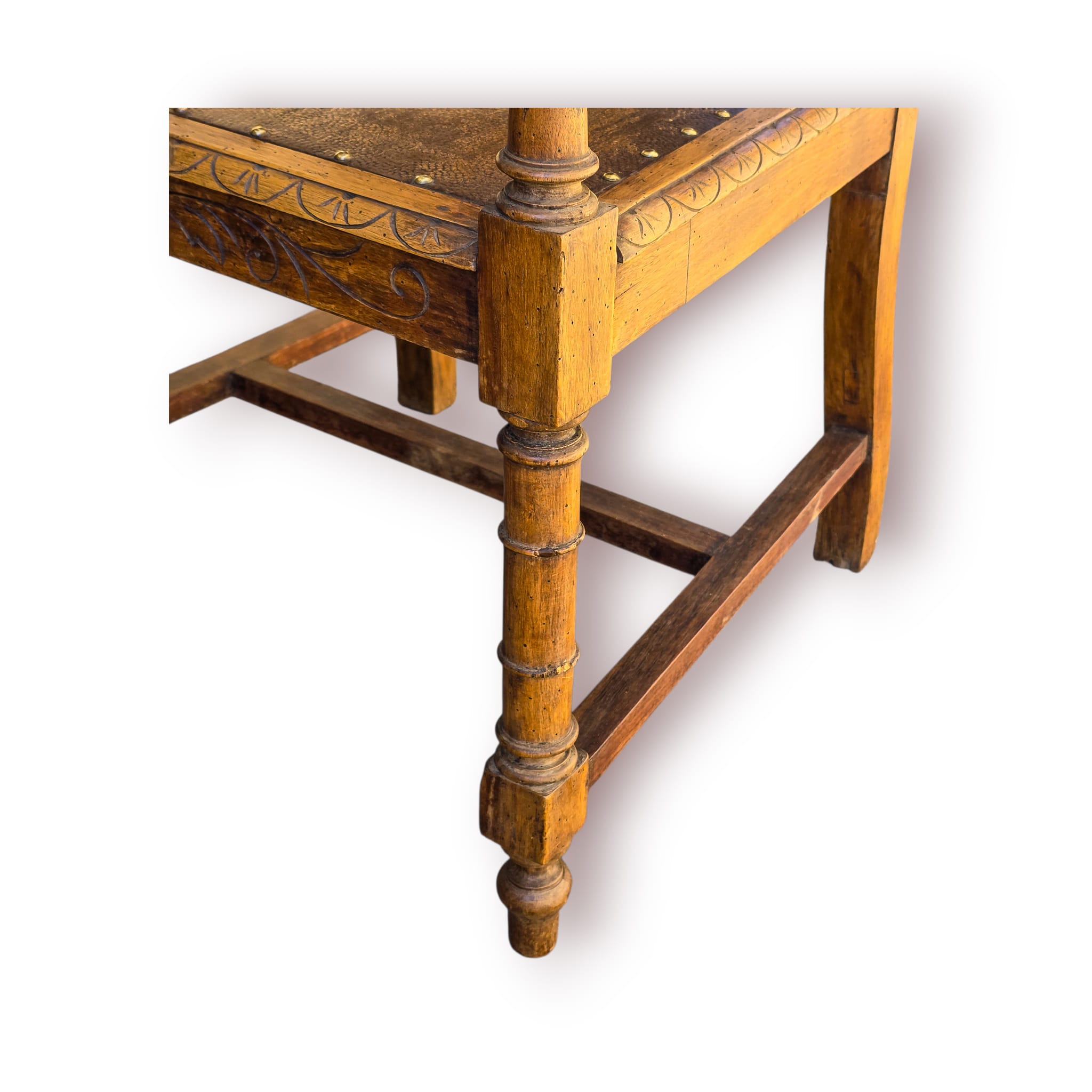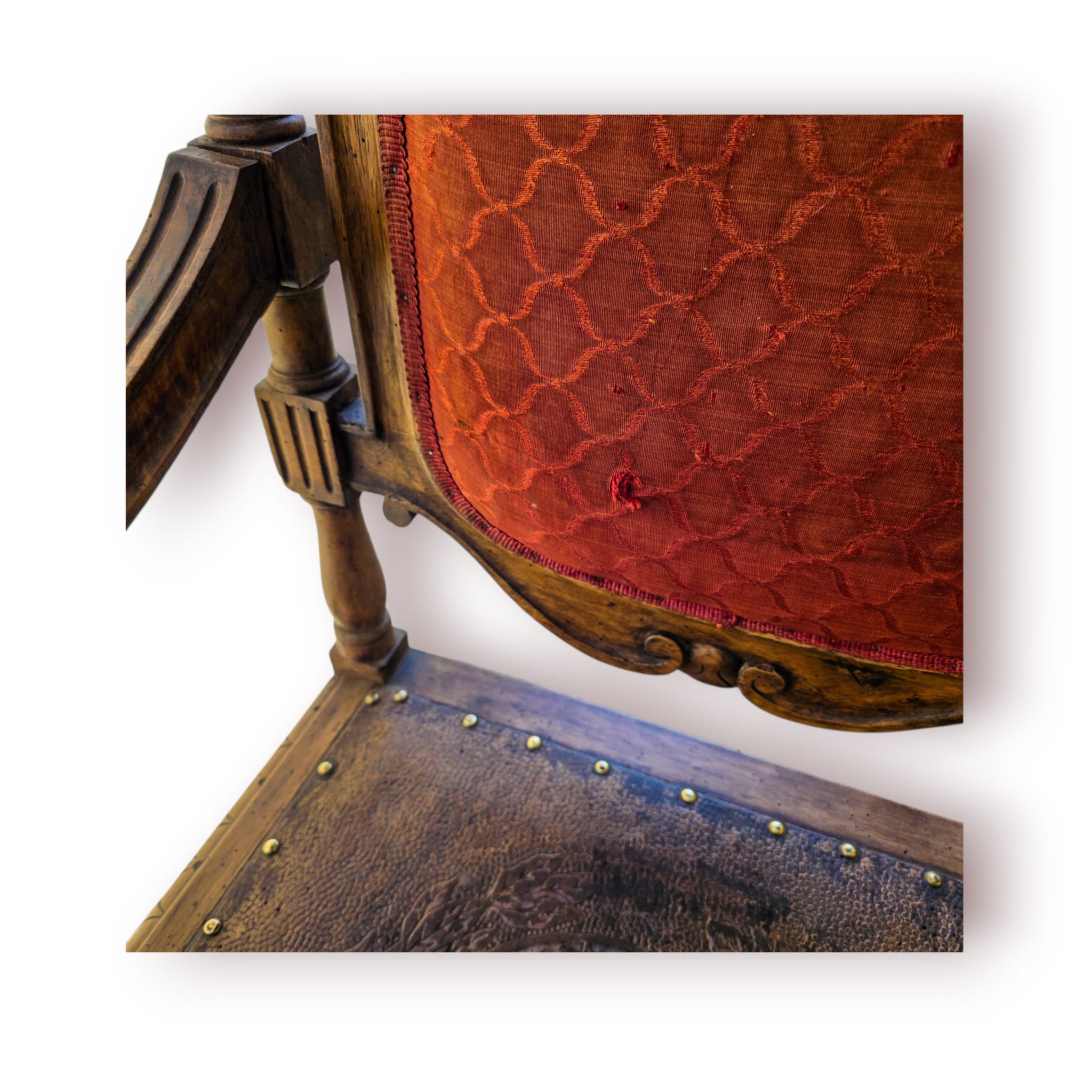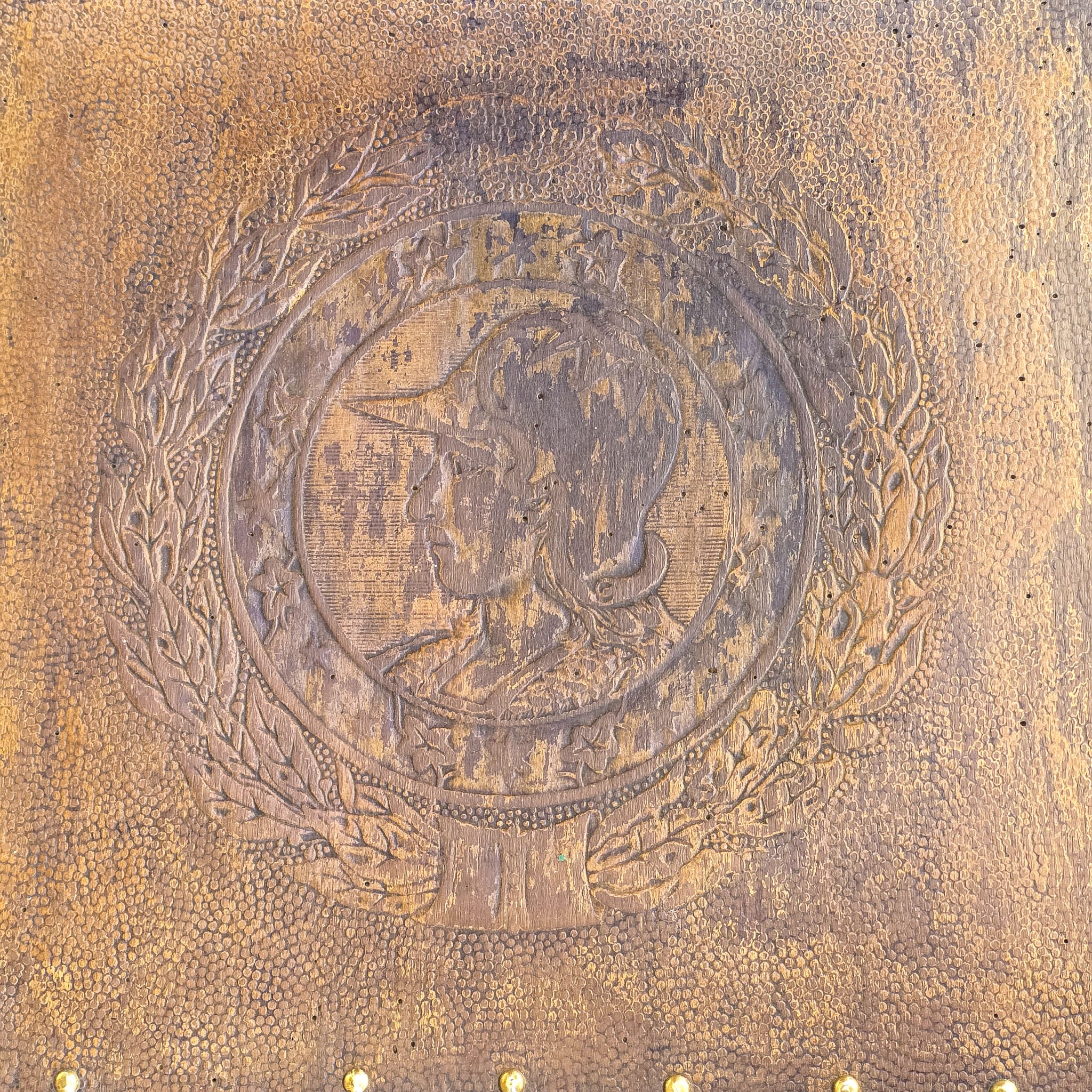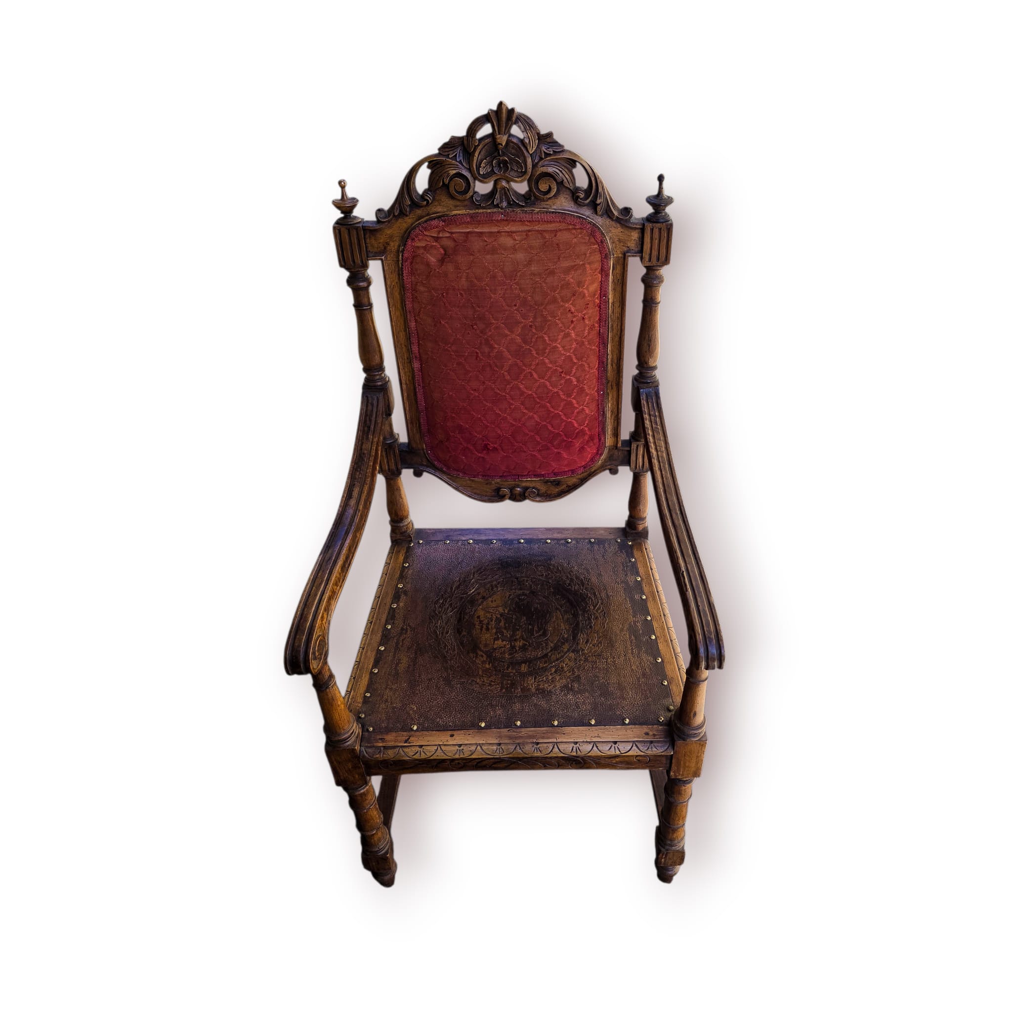 O assento é revestido em couro gravado com medalhão decorativo, rodeado por coroa de louros e fixado com pregaria em latão, um detalhe característico de mobiliário antigo de qualidade.
