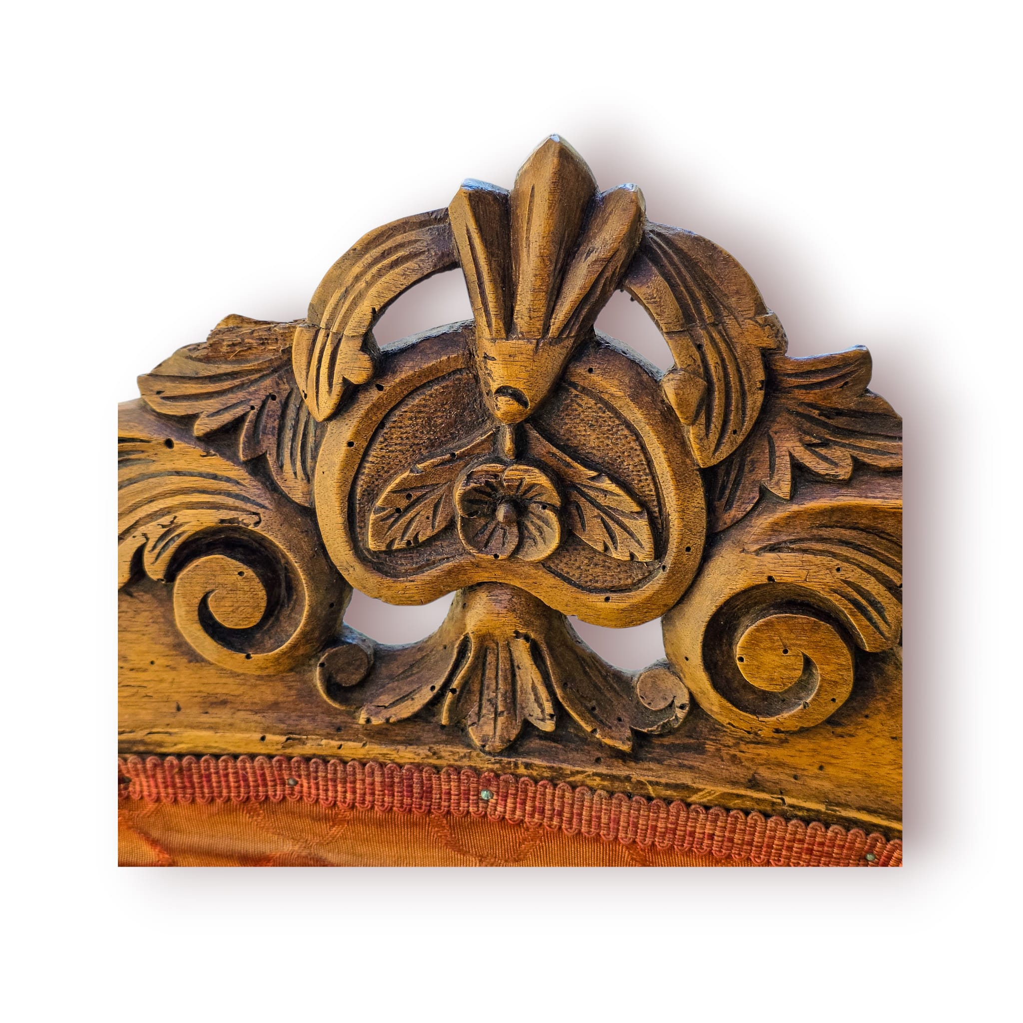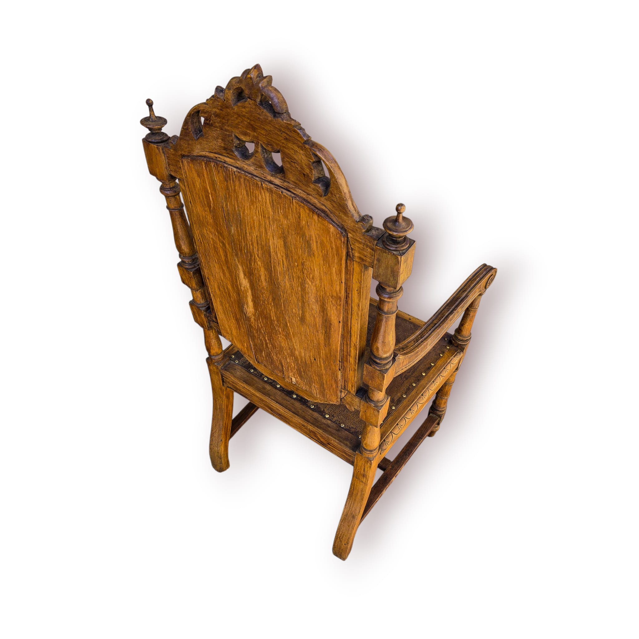 Elegante cadeirão antigo em madeira maciça, ricamente decorado com talha ornamental de inspiração renascentista.