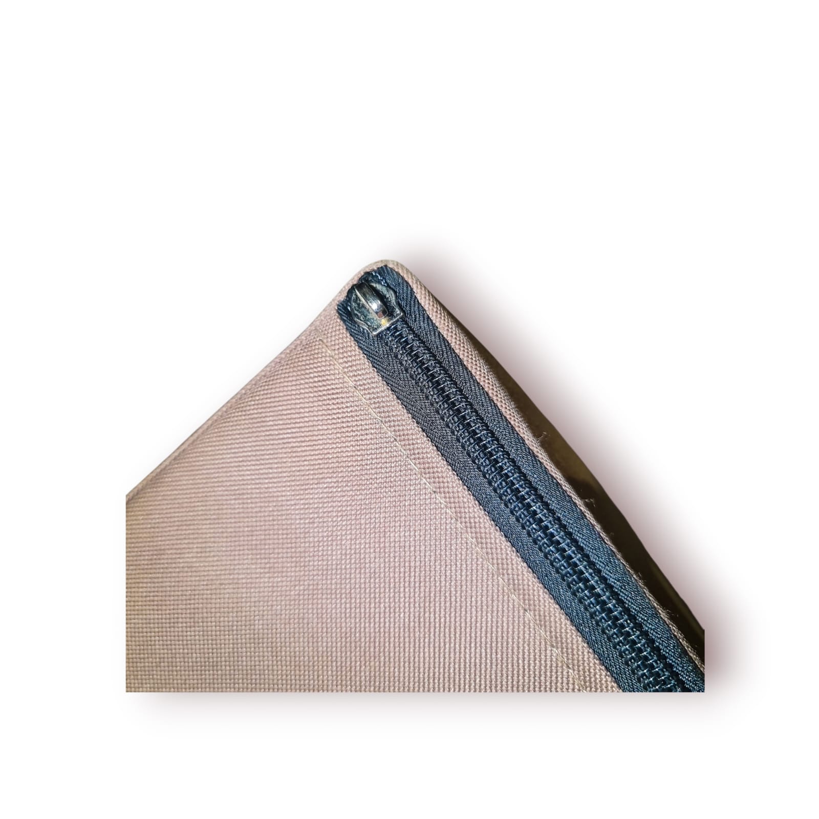 Cor castanho e bege, capa removível e lavável, estrutura firme em espuma moldada.