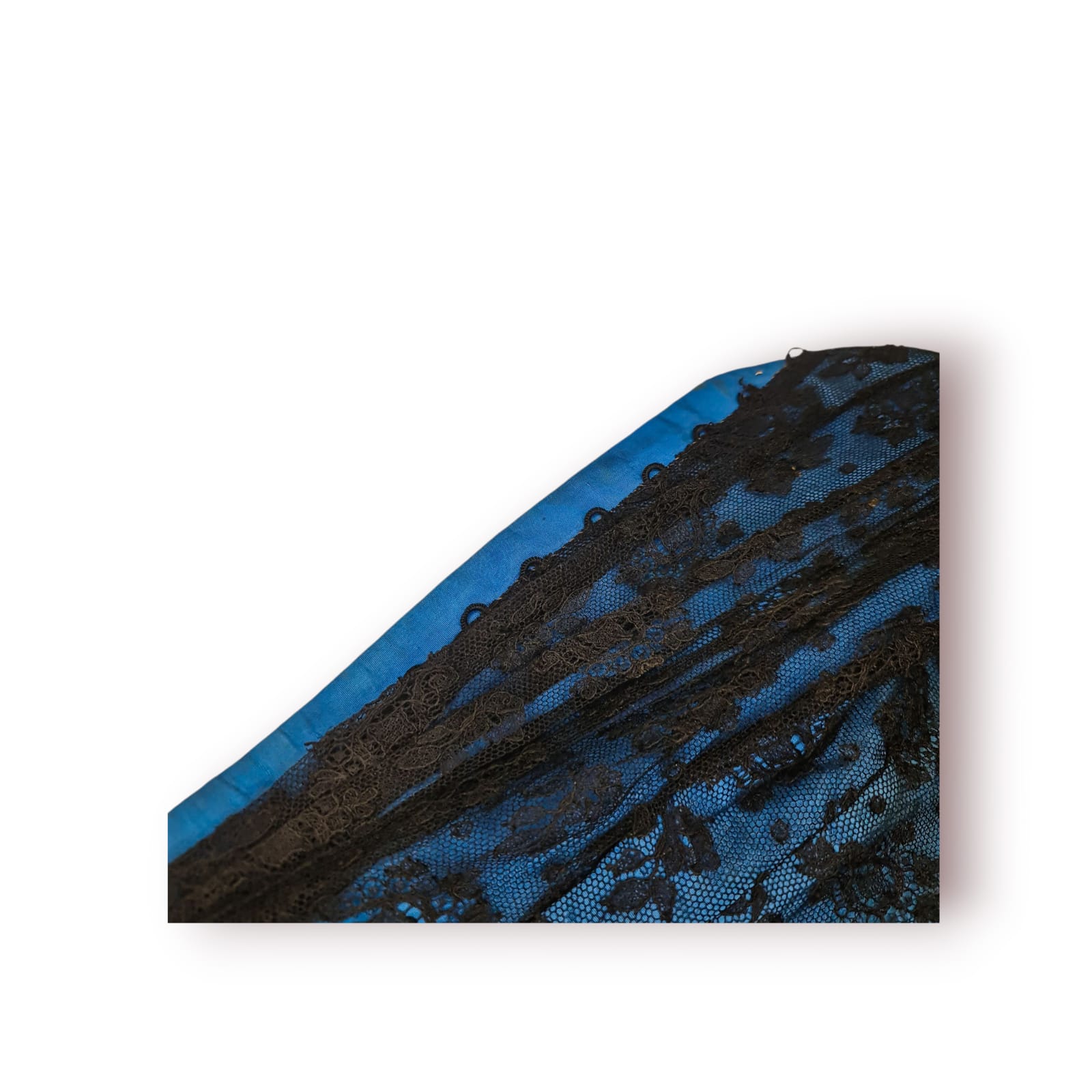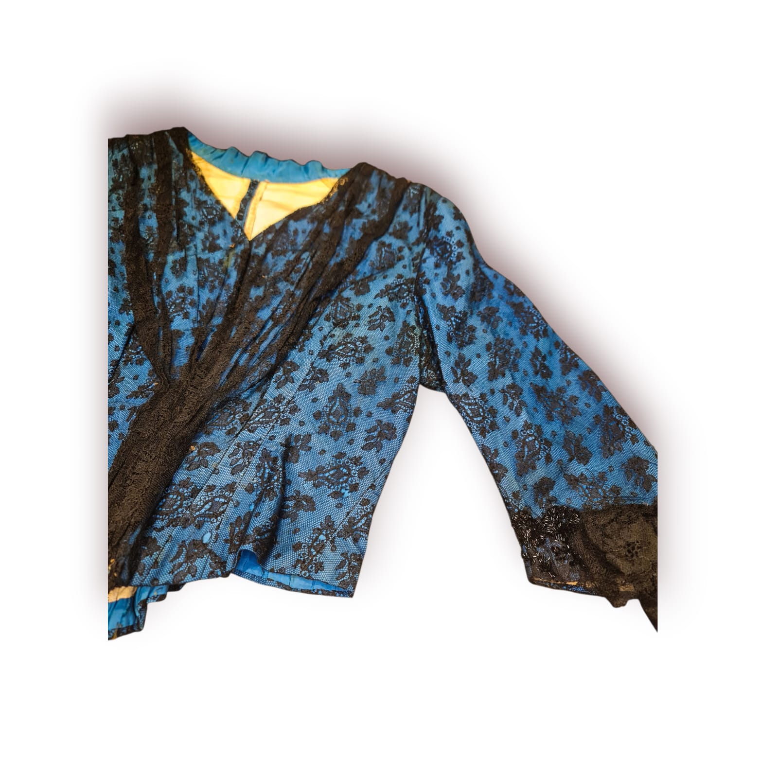 Peça feminina raríssima, confeccionada à mão em tecido azul trabalhado com renda preta aplicada e detalhes em vidrilhos cosidos individualmente.
