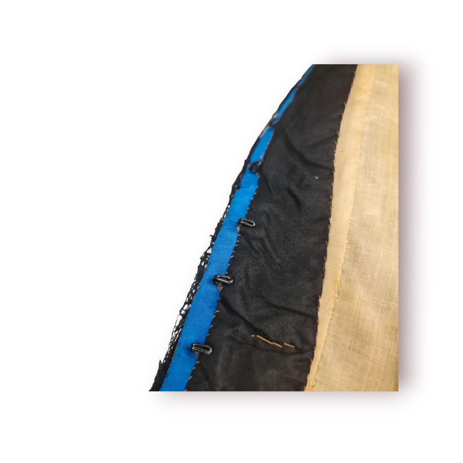 O interior mantém o forro original, típico do período, e o fecho é feito por colchetes metálicos alinhados à mão, demonstrando a construção artesanal da época.