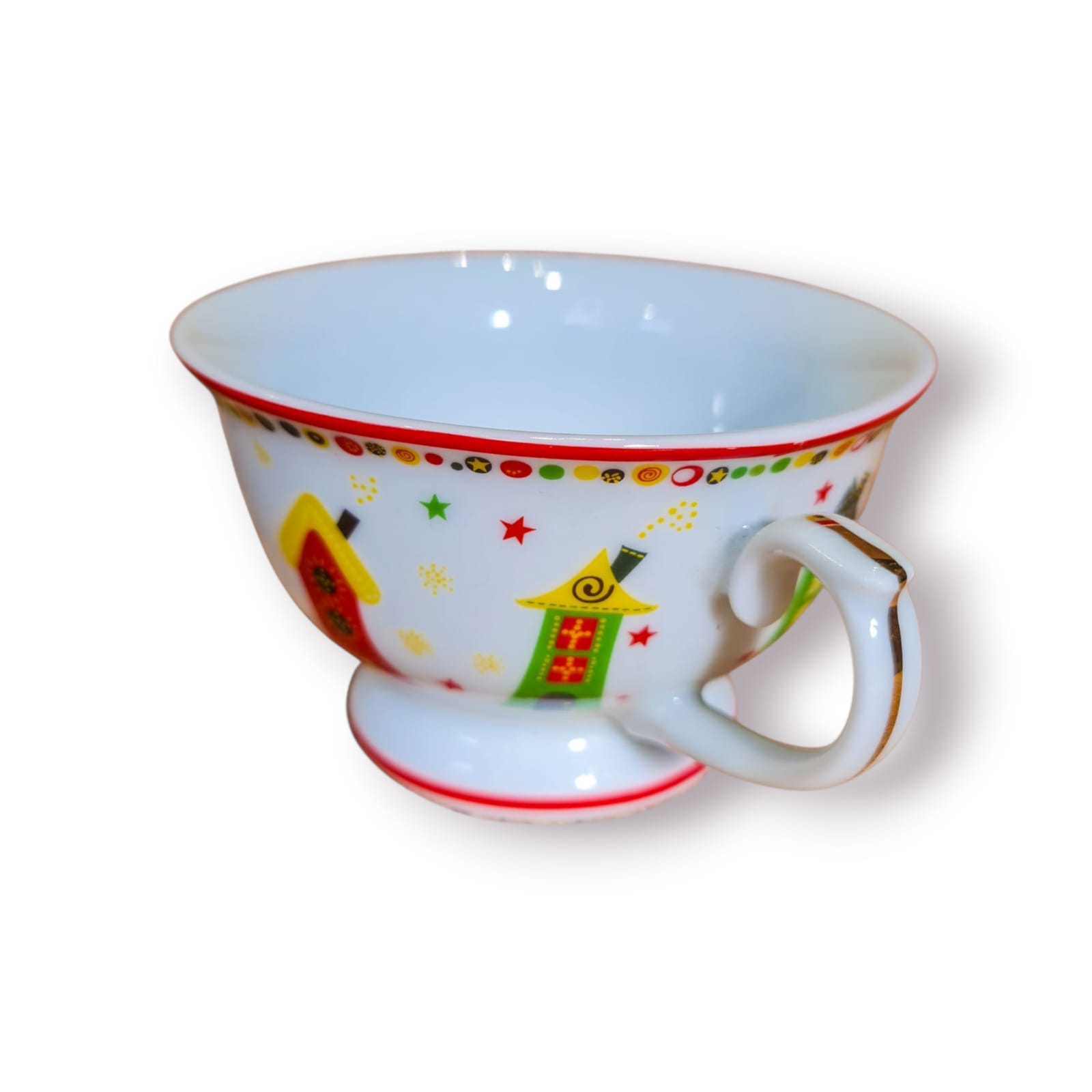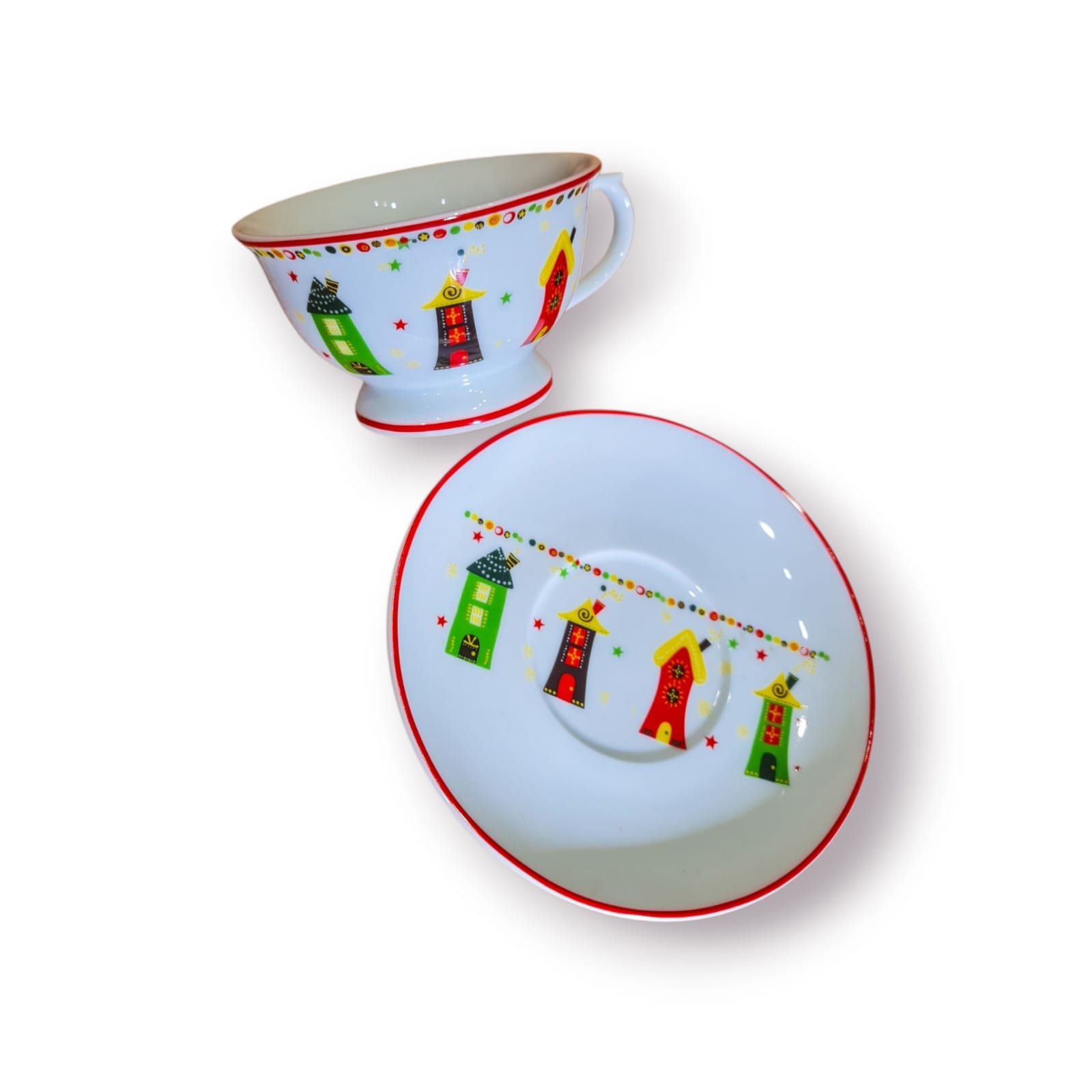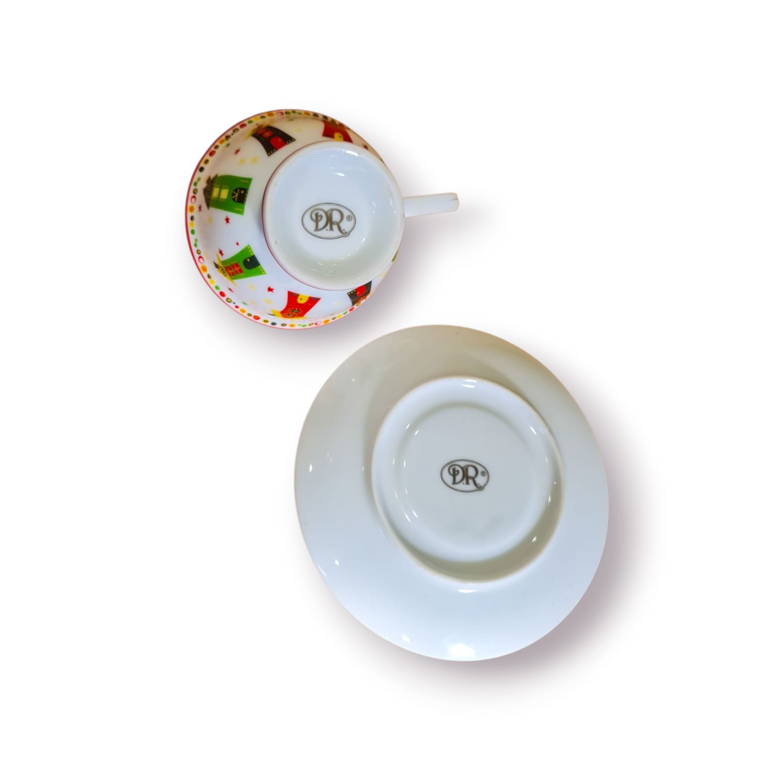 Conjunto composto por chávena e pires em porcelana branca, marca DR®, com decoração festiva de pequenas casas coloridas em tons de vermelho, verde e amarelo.