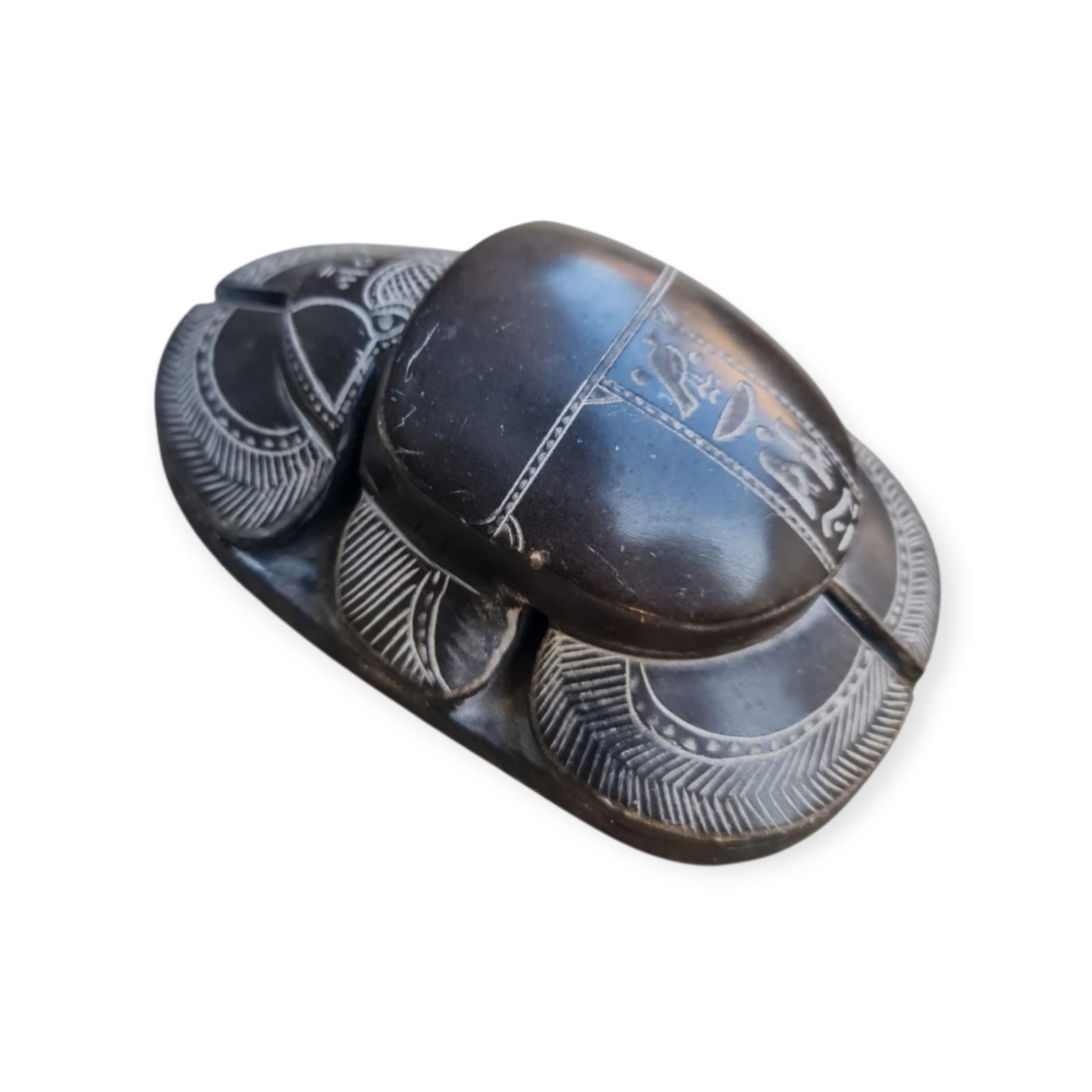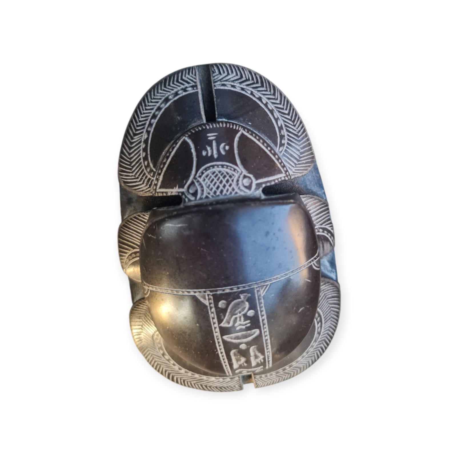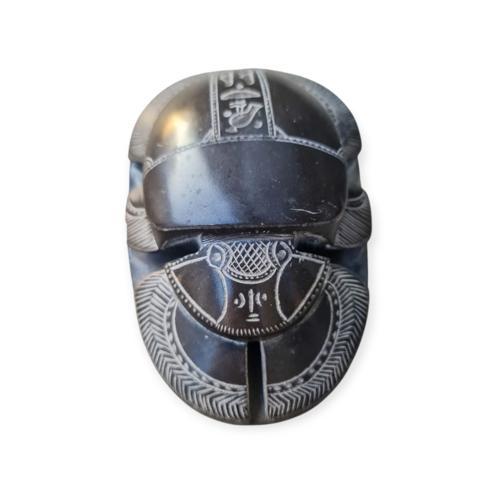 Magnífica representação de um escaravelho ritual egípcio esculpido em pedra escura, com detalhes minuciosos e hieróglifos gravados na base. Esta peça inspira-se nos amuletos simbólicos usados no Antigo Egito, que simbolizavam renascimento, proteção e ligação com os deuses. Os escaravelhos eram frequentemente colocados sobre o coração dos mortos para garantir a passagem segura para a vida após a morte, sendo considerados poderosos talismãs de proteção.