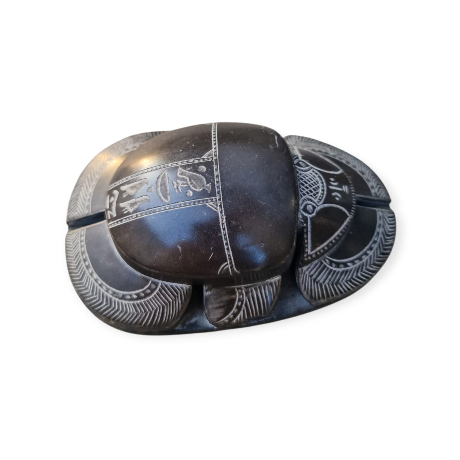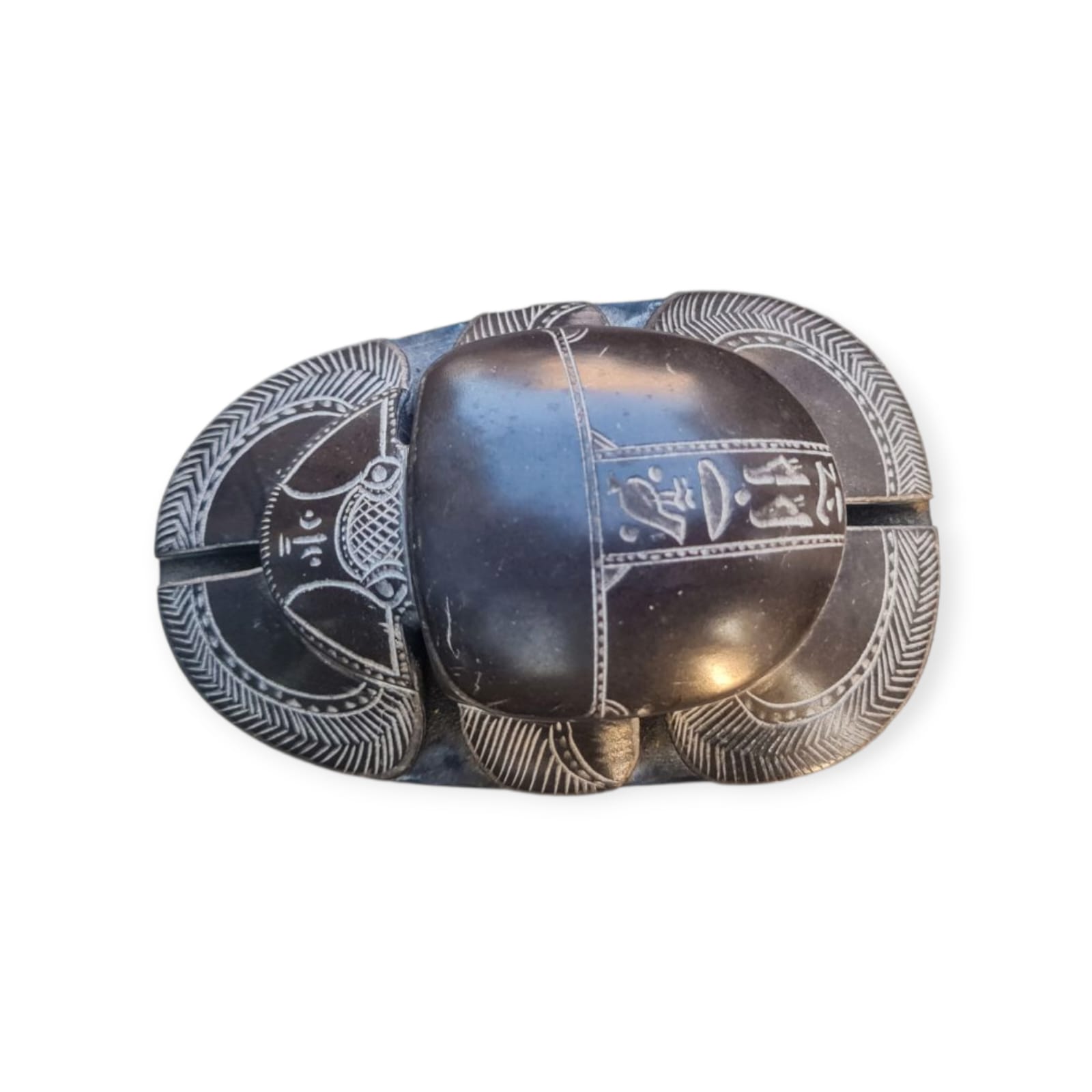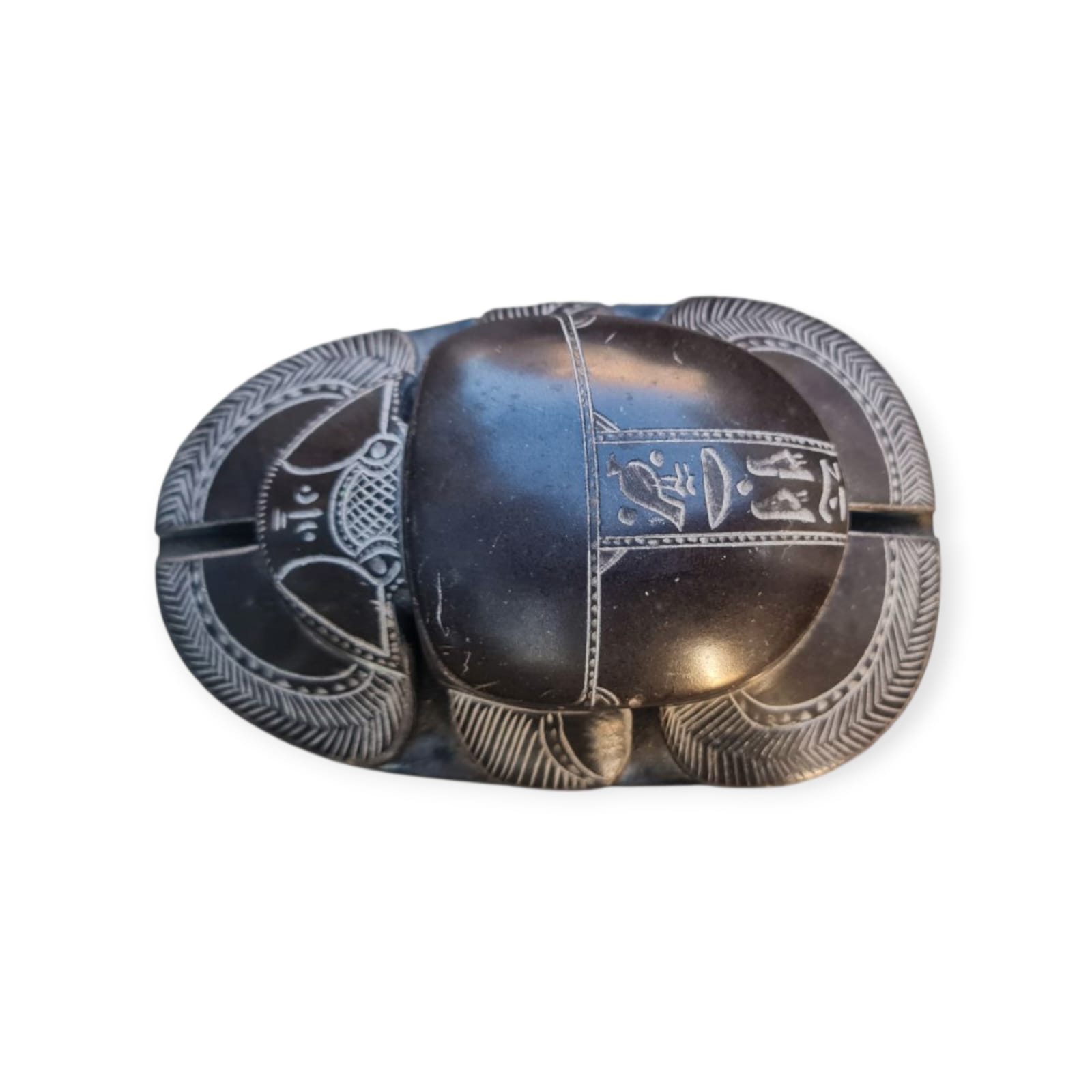 Magnífica representação de um escaravelho ritual egípcio esculpido em pedra escura, com detalhes minuciosos e hieróglifos gravados na base. Esta peça inspira-se nos amuletos simbólicos usados no Antigo Egito, que simbolizavam renascimento, proteção e ligação com os deuses. Os escaravelhos eram frequentemente colocados sobre o coração dos mortos para garantir a passagem segura para a vida após a morte, sendo considerados poderosos talismãs de proteção.