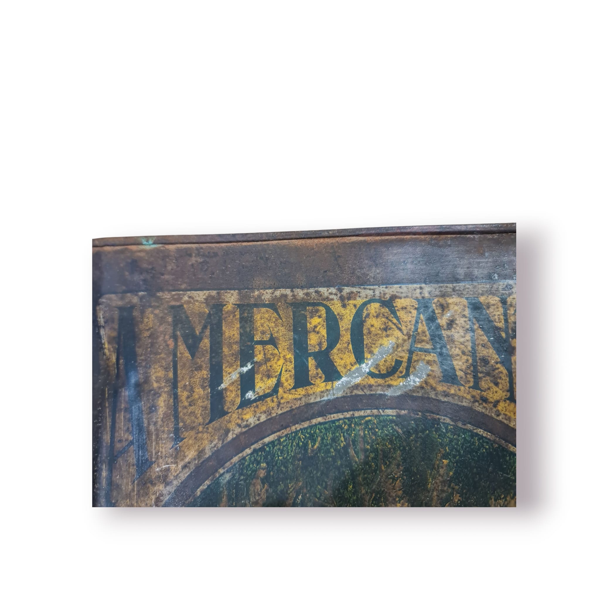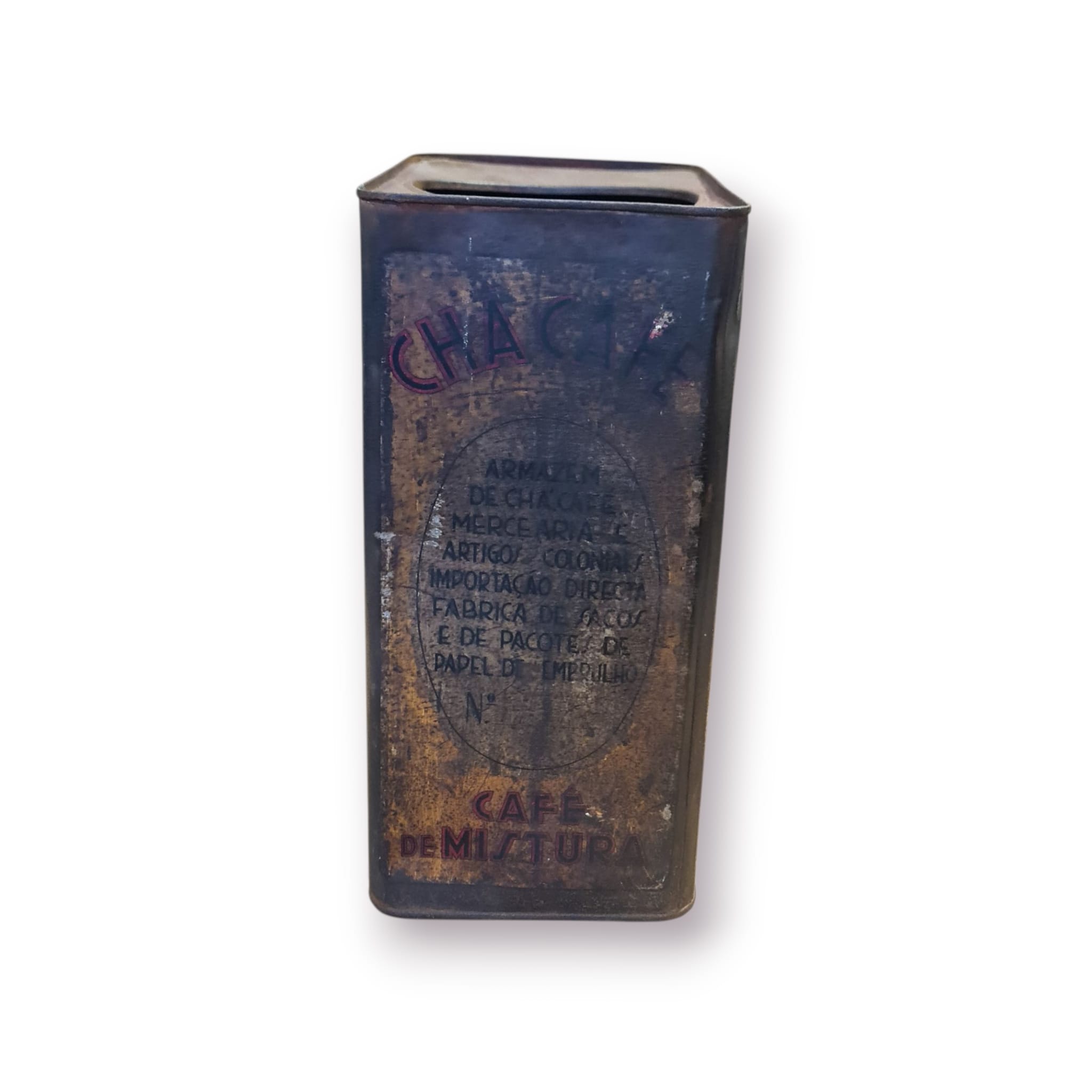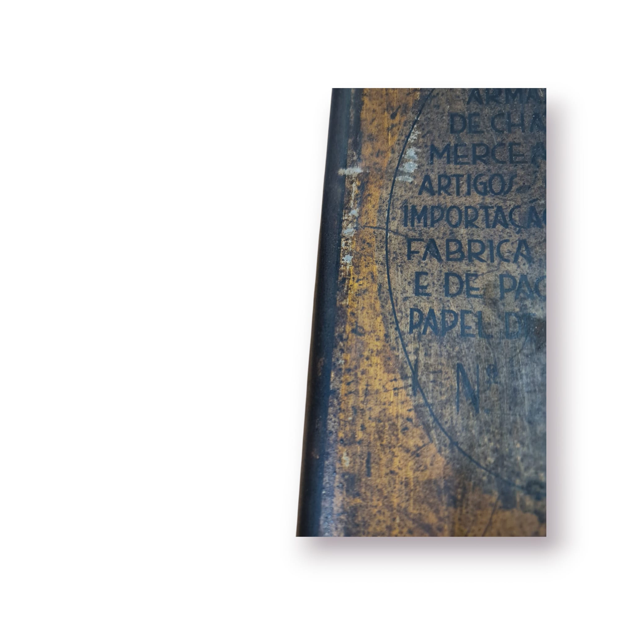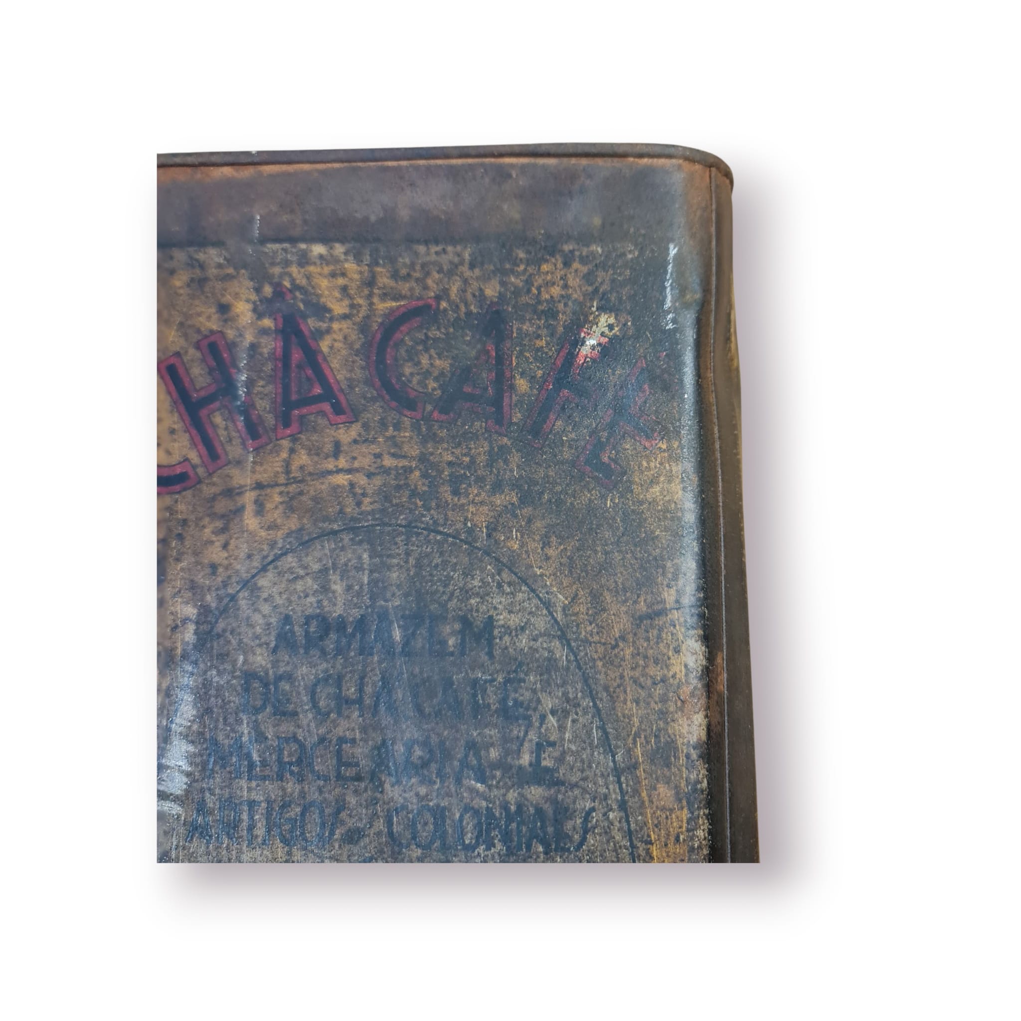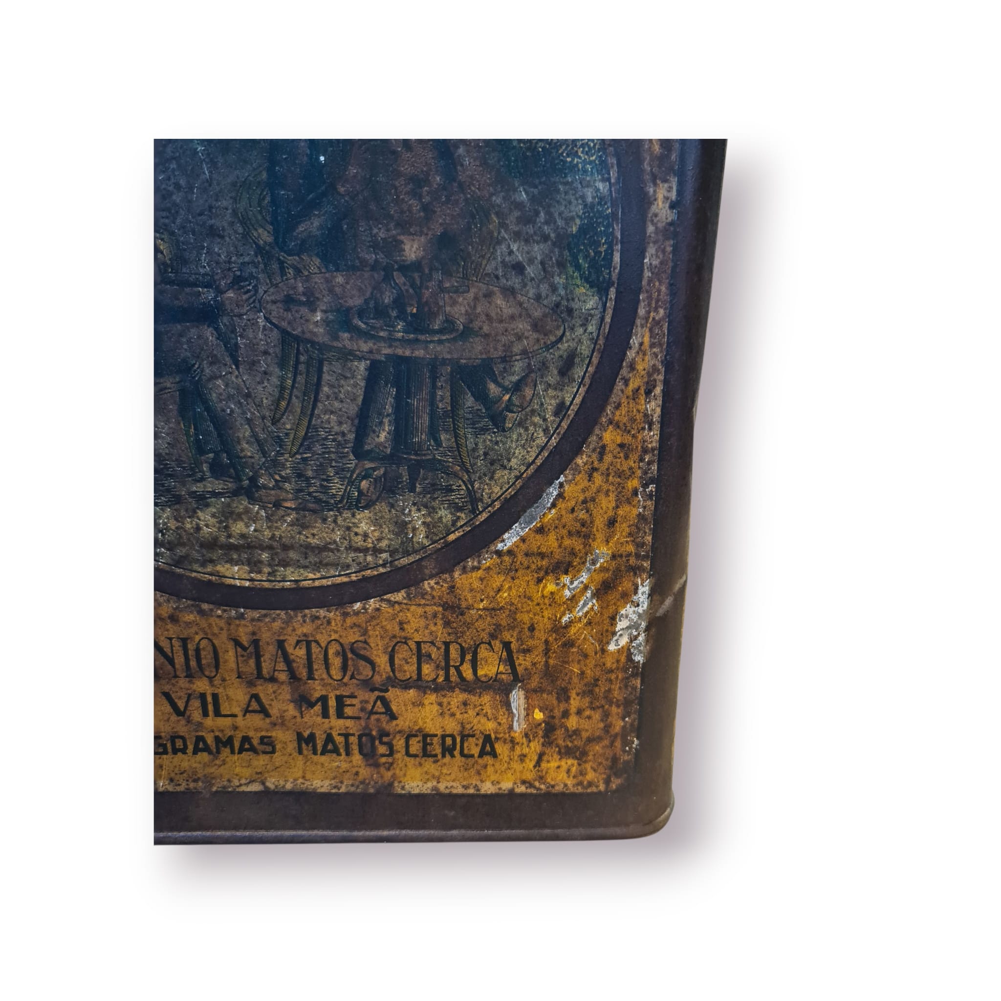 Peça portuguesa em folha-de-flandres litografada, com grafismos e ilustração de época, revelando o charme das mercearias tradicionais do início do século XX.