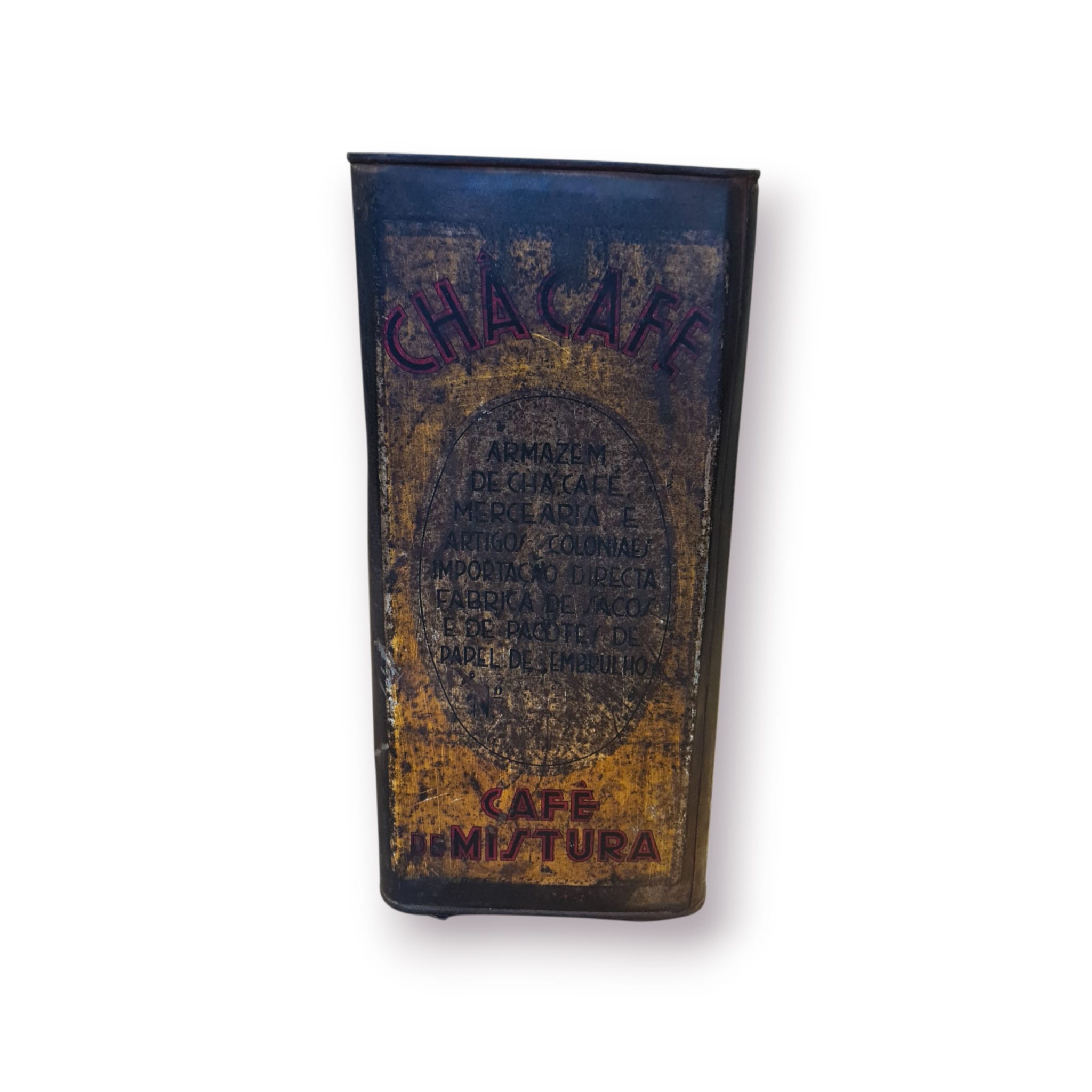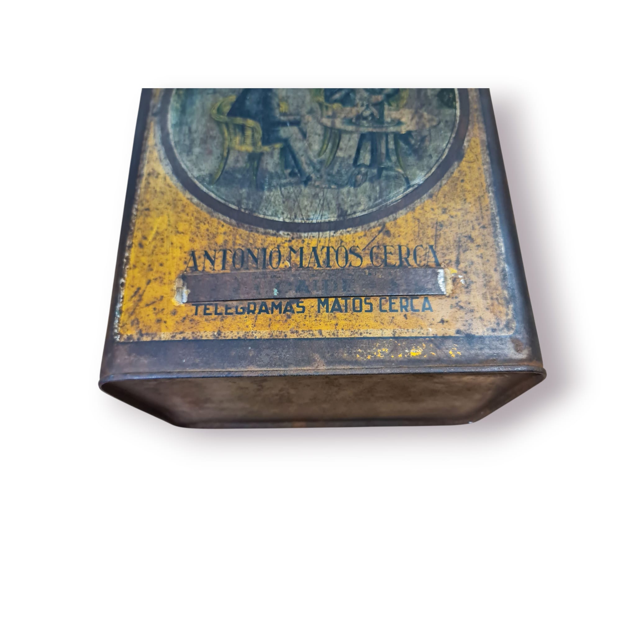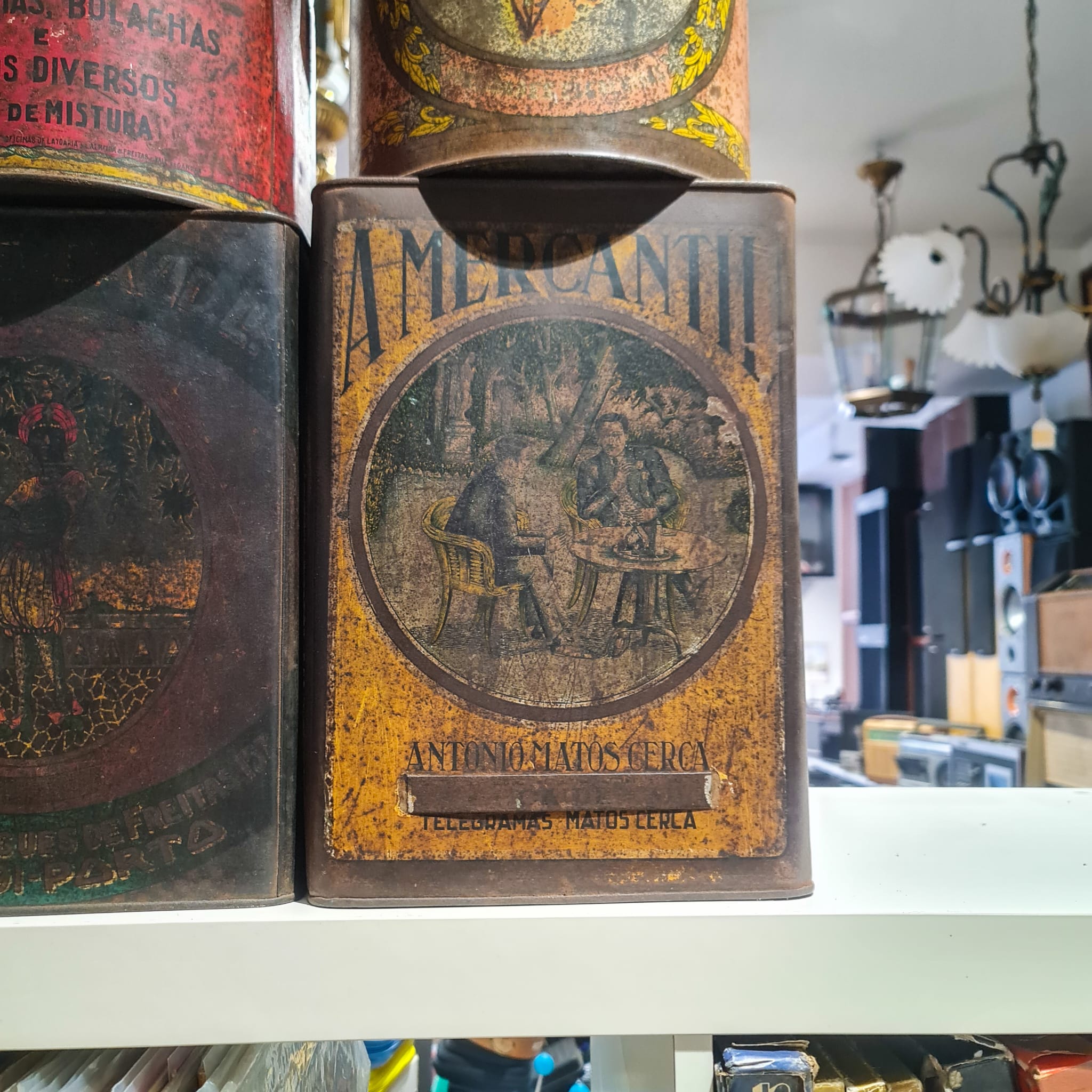 Lata metálica antiga, usada originalmente para armazenamento de chá ou café, com publicidade da histórica casa comercial “A Mercantil – António Matos Cerca, Vila Meã”.