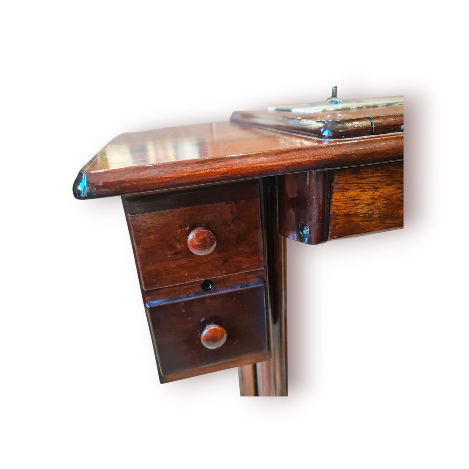 Instalada no seu móvel original em madeira nobre, com acabamento envernizado e pedaleira em ferro fundido com a inscrição “SINGER”, encontra-se em excelente estado estético e funcional, com todos os componentes mecânicos presentes.