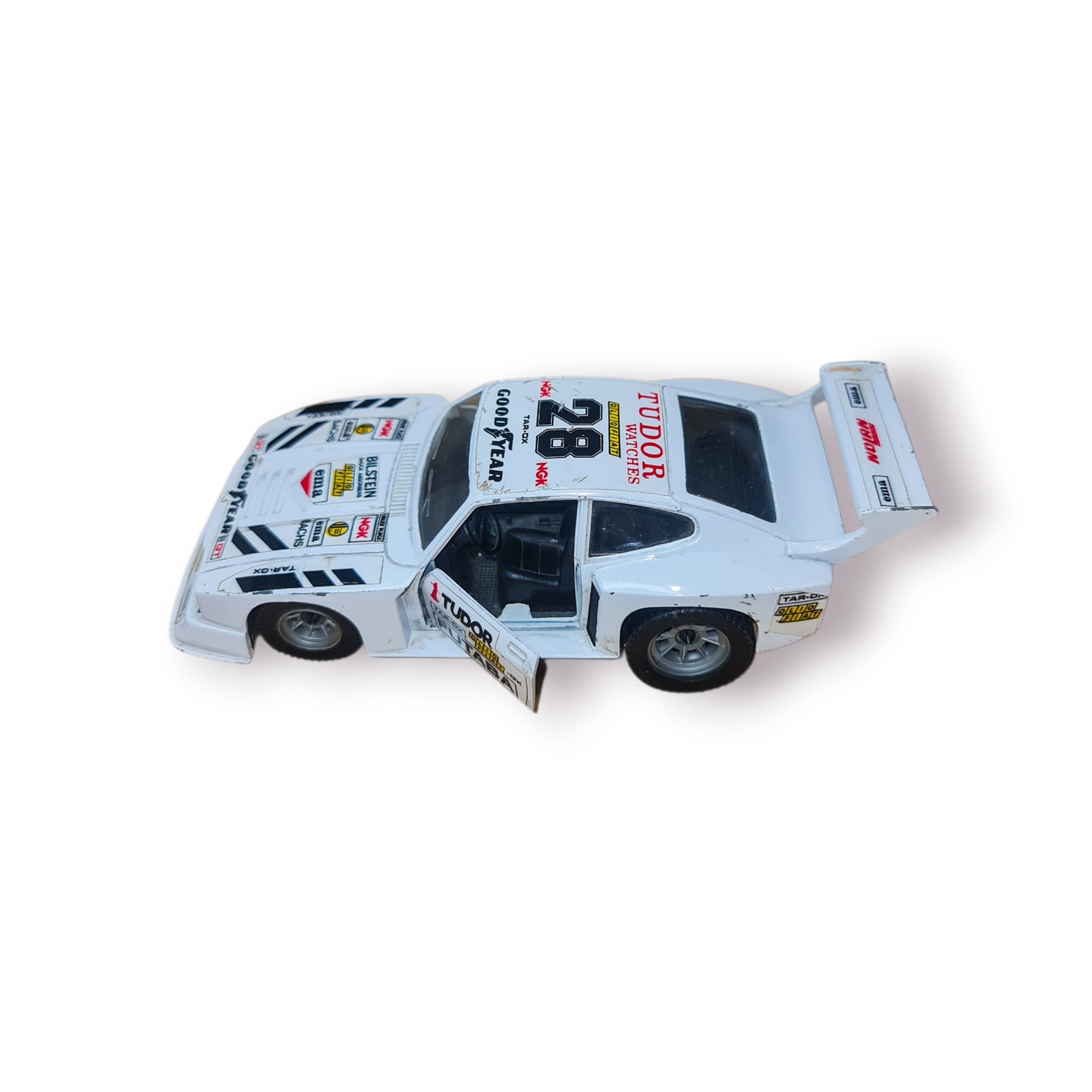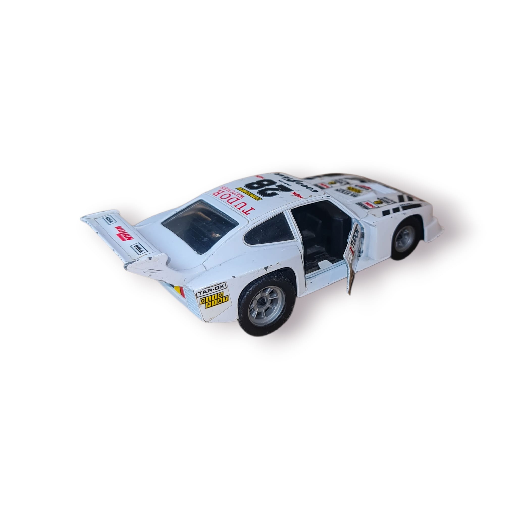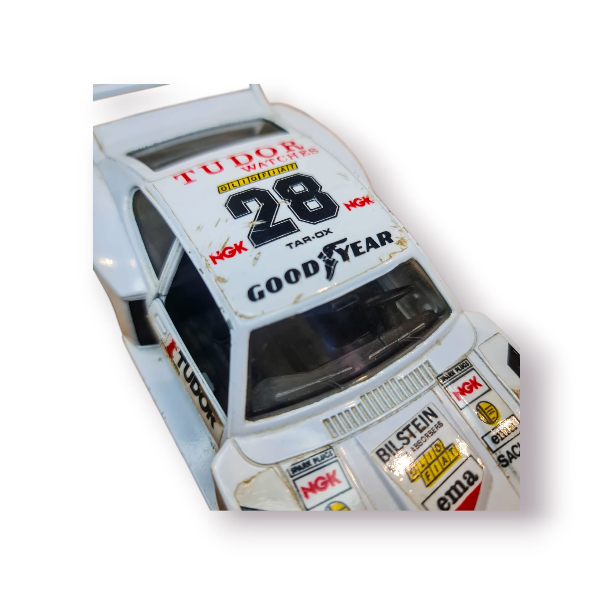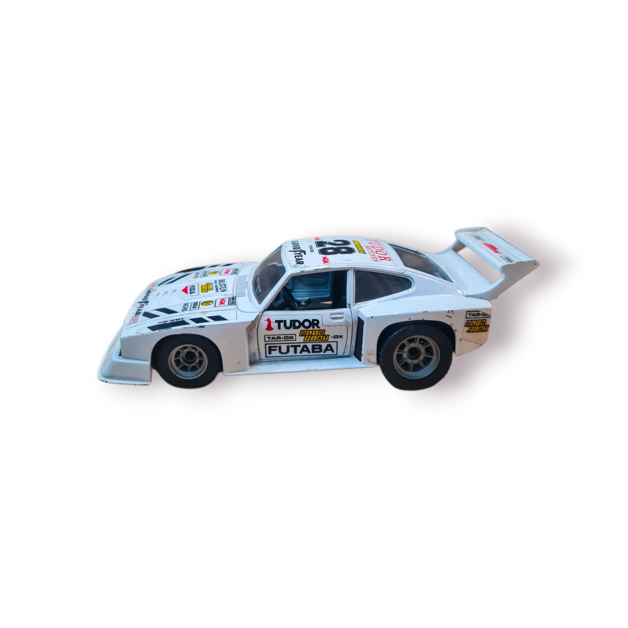 Modelo em escala 1:24, com carroceria em metal fundido (die-cast), portas que abrem e pintura branca decorada com patrocínios clássicos de corrida: Goodyear, Tudor, Futaba, NGK e Bilstein.
